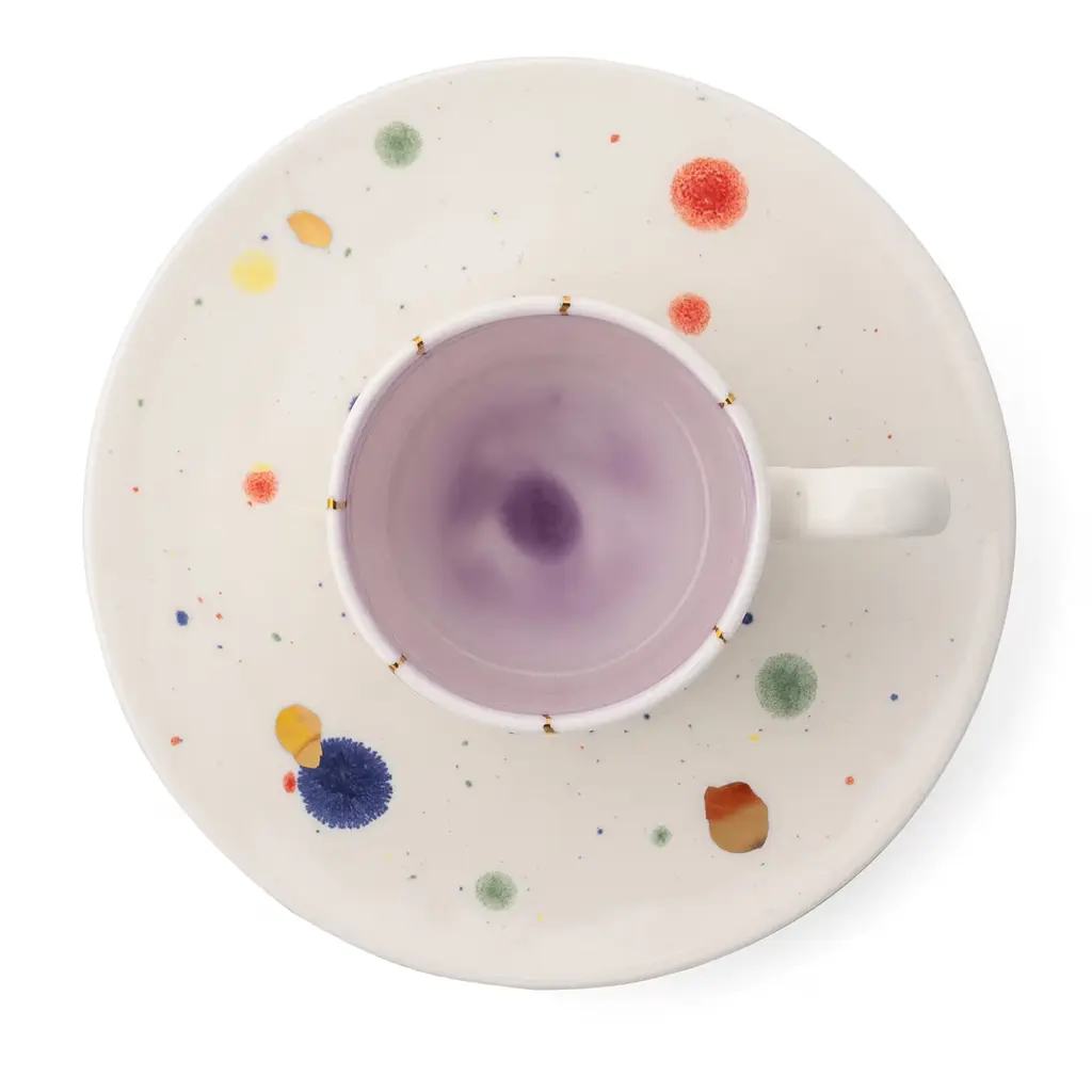 The Set of 2 Islamorada Straight Coffee Cups & Saucers from the Florida collection, launched in 2023, exudes luxury and cheerfulness. Inspired by the vibrant spirit of Florida, these pieces feature a soft Islamorada lavender that reflects the serene beauty of its sunsets. Each cup and saucer is adorned with playful multicolor dots, adding a whimsical touch to your coffee experience. The elegant design includes a delicate golden net that wraps around the cups, enhancing their sophistication.