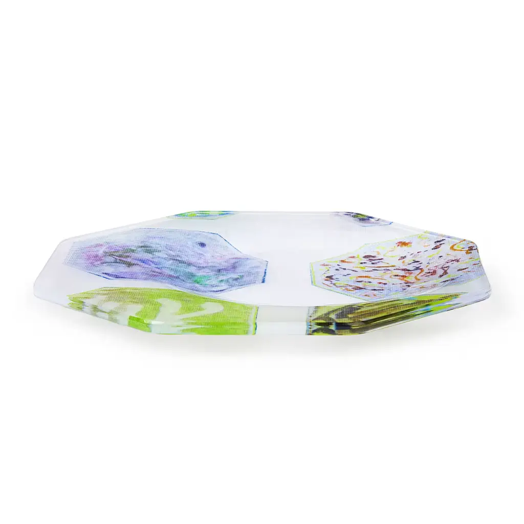 The perfect plate shape to be held with one hand, while standing up and having a chat. The other hand holds a glass, a fork, and finger food. The octagonal shape is asymmetrical with a larger brim for a secure grip. The hollow base is off-center for perfect balance. The crystal-clear material used, methacrylate, is fused together with printed linen, thermo-formed, and finished by hand. Food-certified, impact resistant, dishwasher safe, stackable, handy, and of great impact.