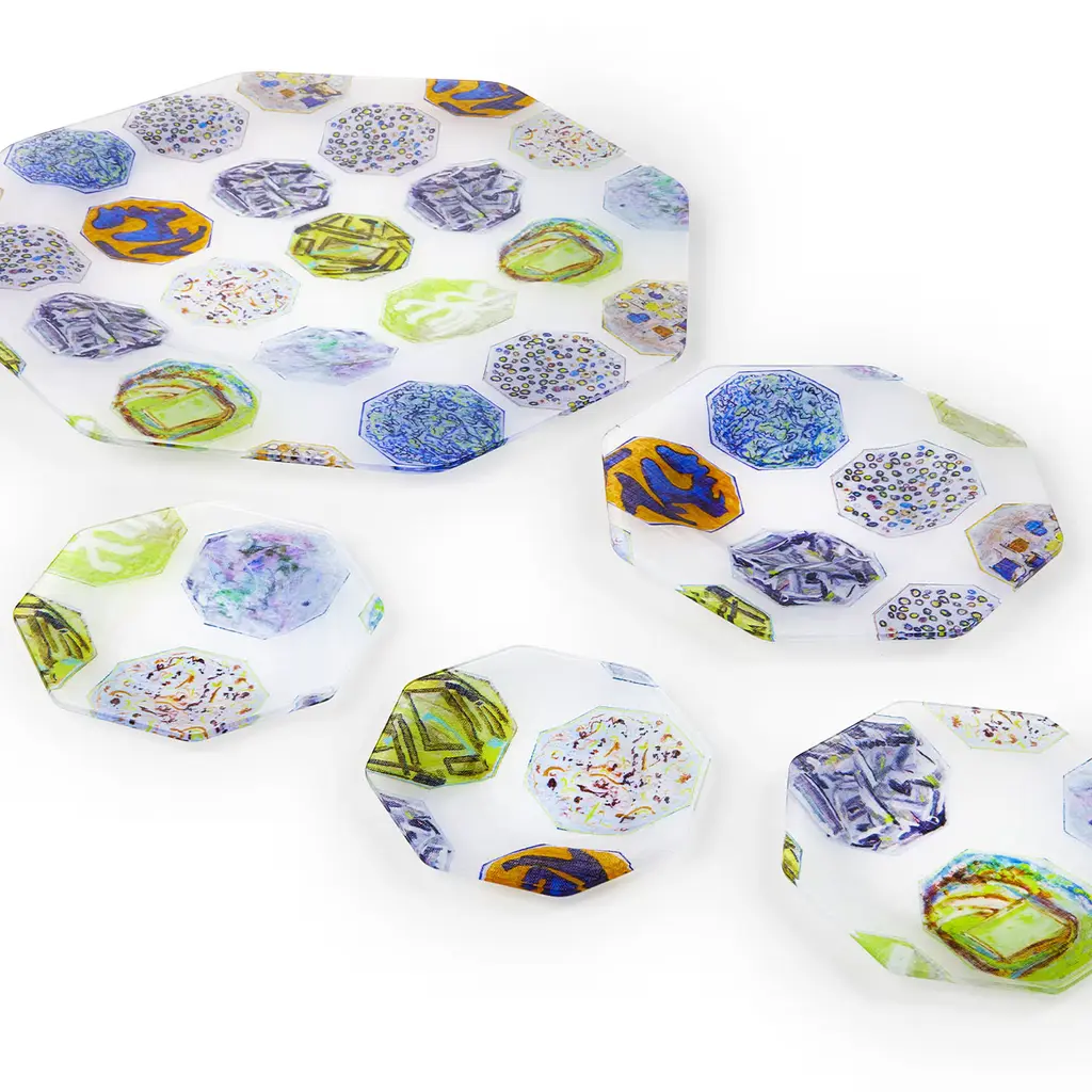 The perfect plate shape to be held with one hand, while standing up and having a chat. The other hand holds a glass, a fork, and finger food. The octagonal shape is asymmetrical with a larger brim for a secure grip. The hollow base is off-center for perfect balance. The crystal-clear material used, methacrylate, is fused together with printed linen, thermo-formed, and finished by hand. Food-certified, impact resistant, dishwasher safe, stackable, handy, and of great impact.