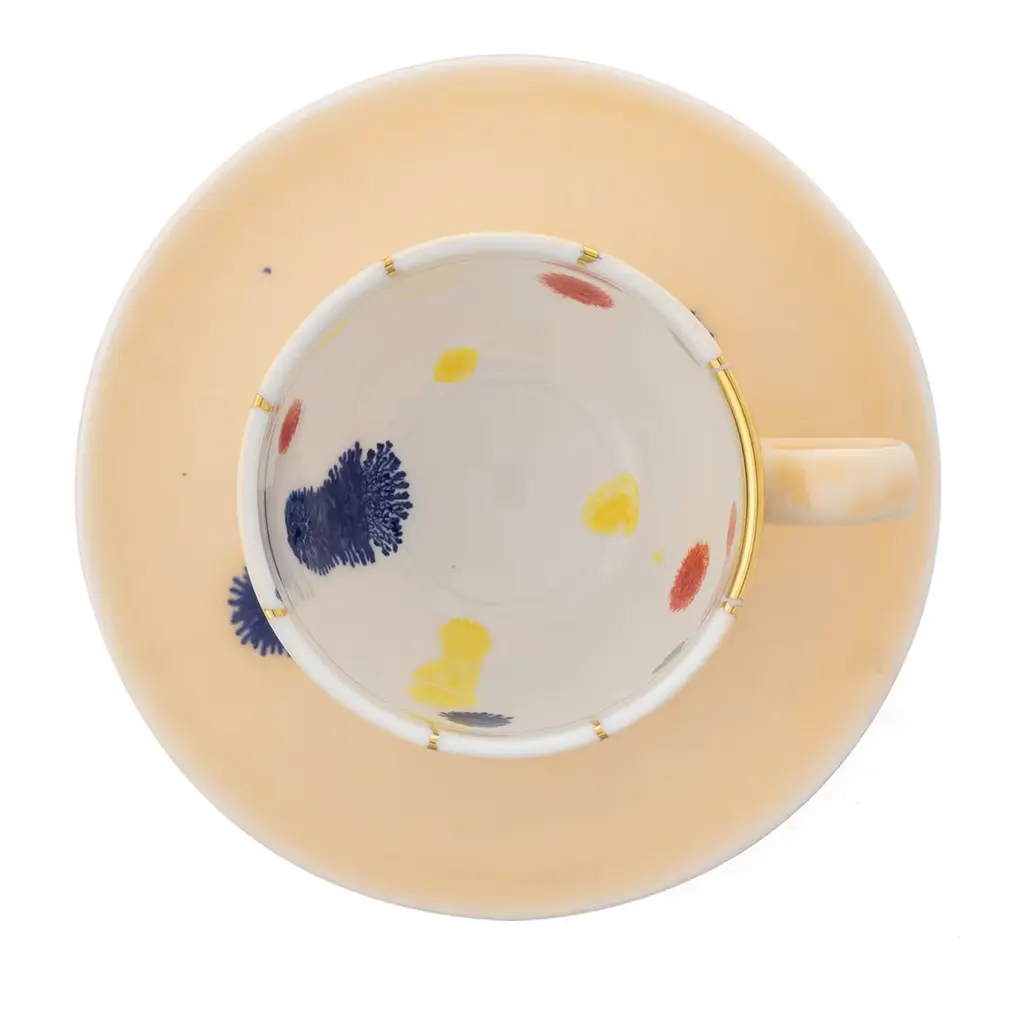 The Miami Coffee Cup from the Florida collection, launched in 2023, radiates luxury and cheerfulness. Inspired by Florida's vibrant character, this plate features a lively Miami orange that evokes the essence of its stunning beaches and sunsets. The design showcases playful multicolor dots and a golden net, enhancing its whimsical charm.