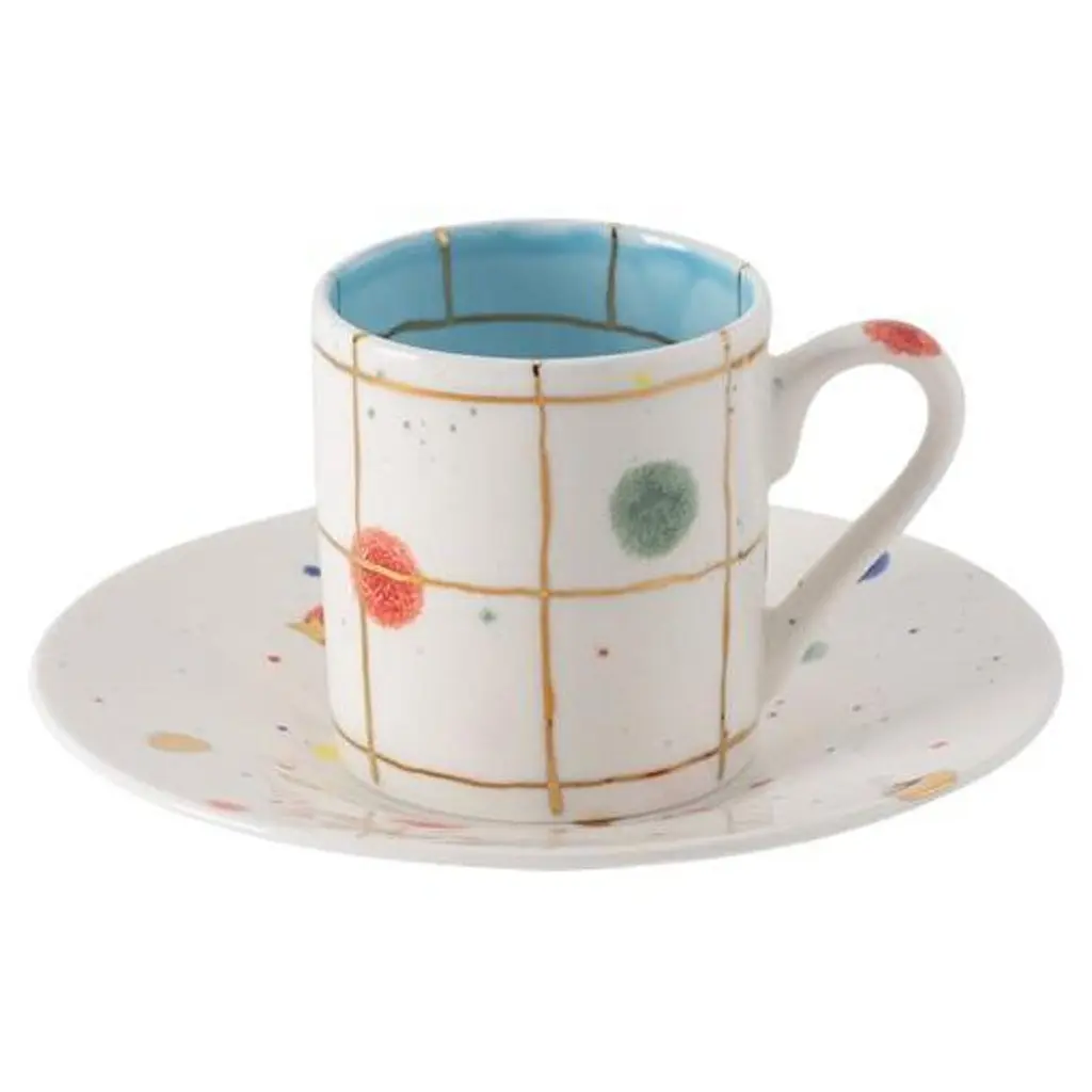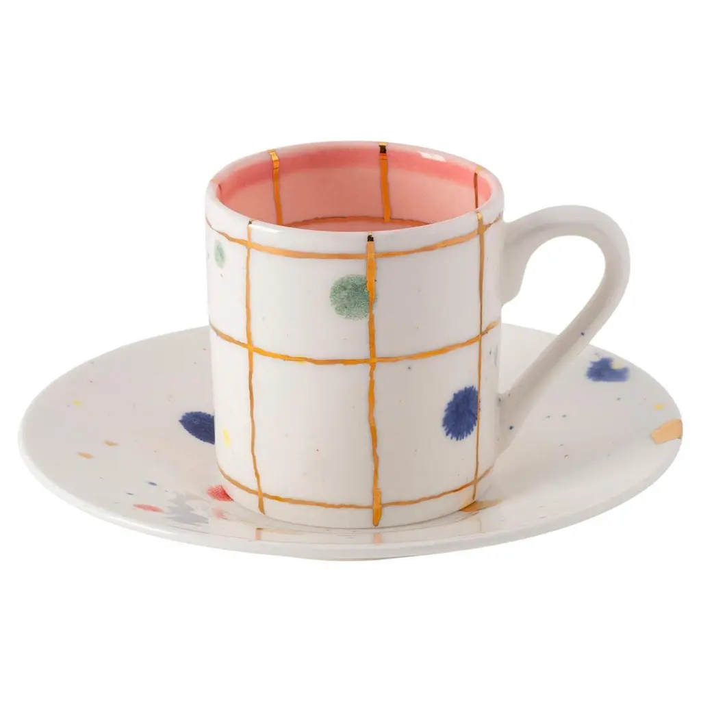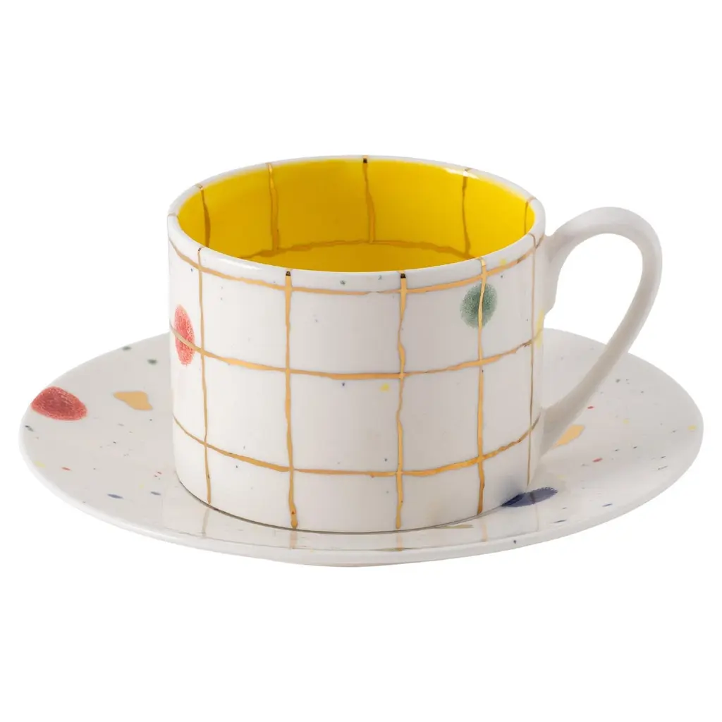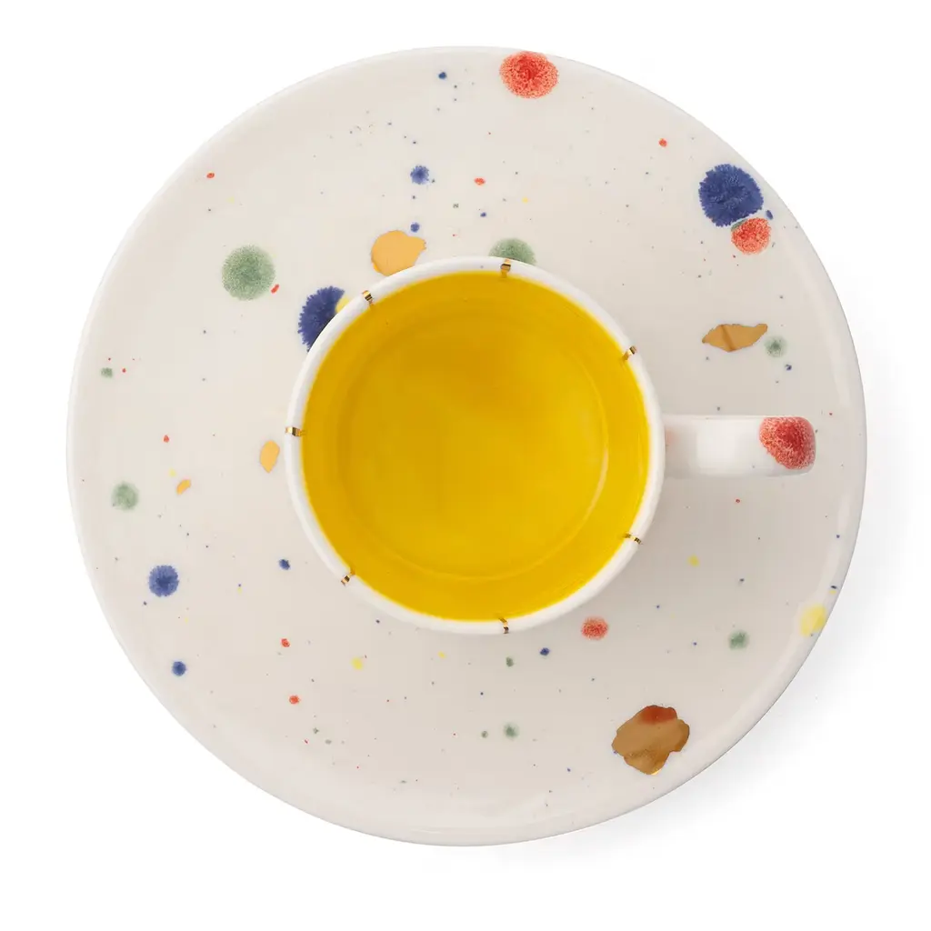 The Naples Coffee Cup from the Florida collection radiates luxury and cheer, embodying the vibrant spirit of Florida since its launch in 2023. Inspired by the state's colorful heritage, this piece features a sunny Naples yellow, reminiscent of its stunning beaches and sunsets. Is is adorned with multicolor dots and a golden net, adding a whimsical touch.