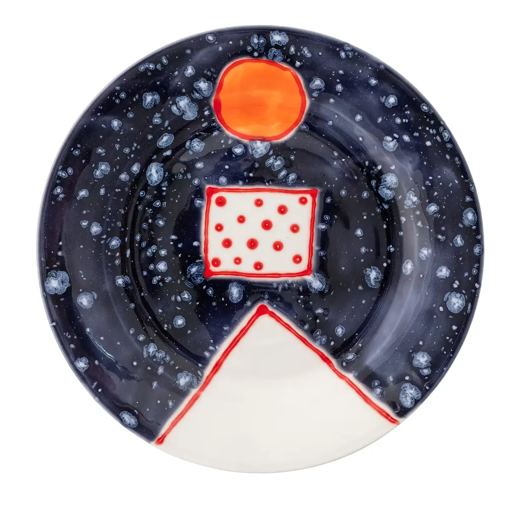 The Sierra Dinner Plate captivates with its deep, mysterious design, featuring a starry, dark background that evokes a sense of wonder. The vibrant orange accents create a striking contrast, bringing warmth and energy to the plate. Central to the design is a classic mountain figure, a signature element in Coralla's work, symbolizing strength and adventure. This unique combination of colors and imagery transforms each meal into an experience, making it perfect for both everyday dining and spe