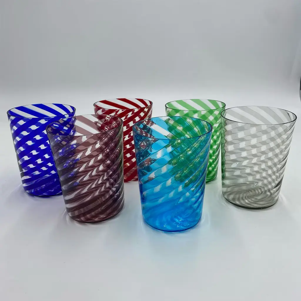 Timeless elegance and sophistication define this gorgeous set of two water glasses, a veritable work of art that celebrates the century-old tradition of Murano glassmaking. Handmade, it features a captivating spiral texture enhanced with a versatile gray shade. Ideally combined with other sets of different colors. Please consult the Artemest catalog for other available colors.