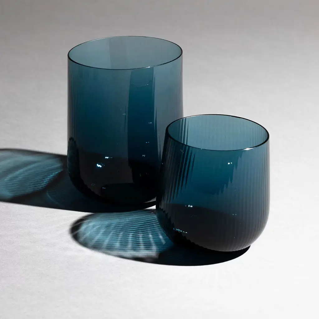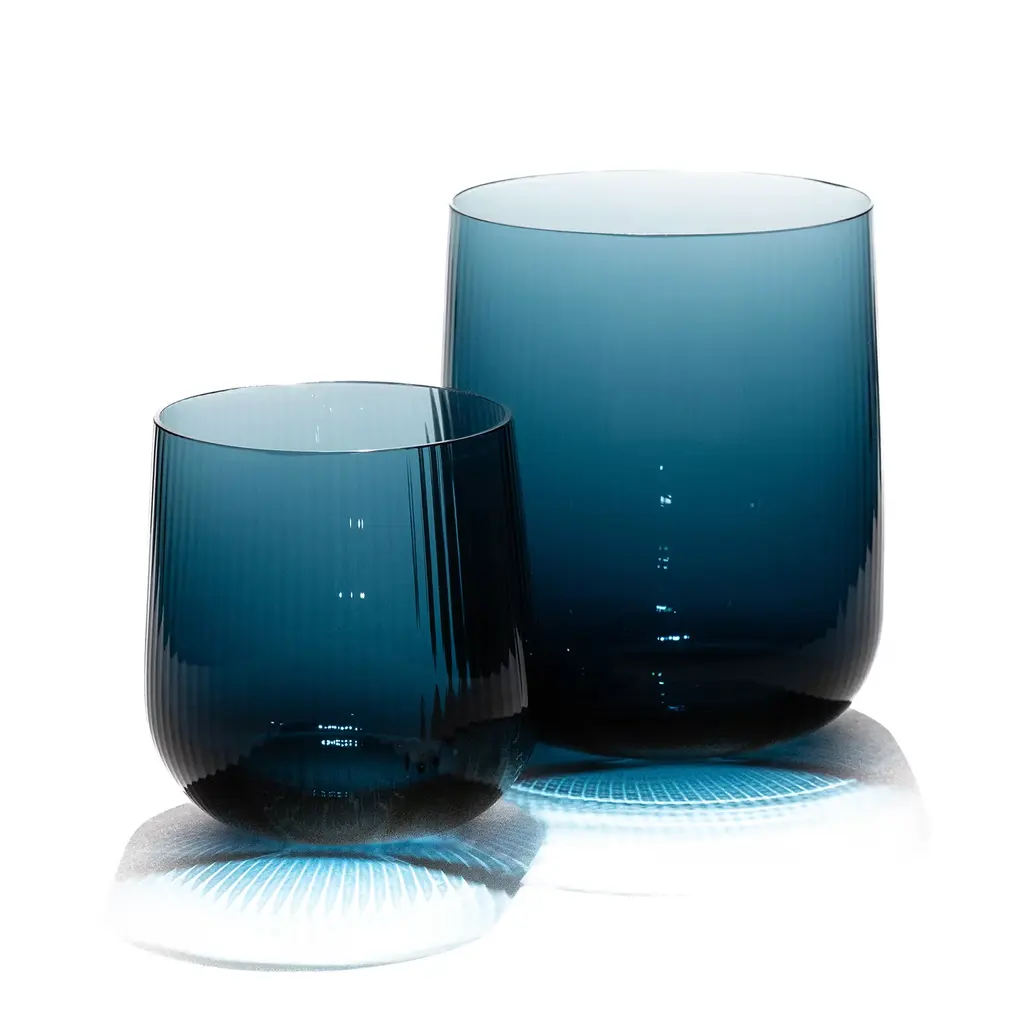 Stilla, the Latin word for a drop of water, embodies liquid transparency and perfection. Designed by Federico Peri for Purho in spring 2024, Stilla Liquida small glasses in deep blue feature textured surfaces and gently elliptical shapes. Engraved with the rigadin technique, their thin vertical lines preserve the glass’s transparency. Crafted from Murano glass. They are also available in larger sizes and different colors. Please, contact the Concierge for more information.