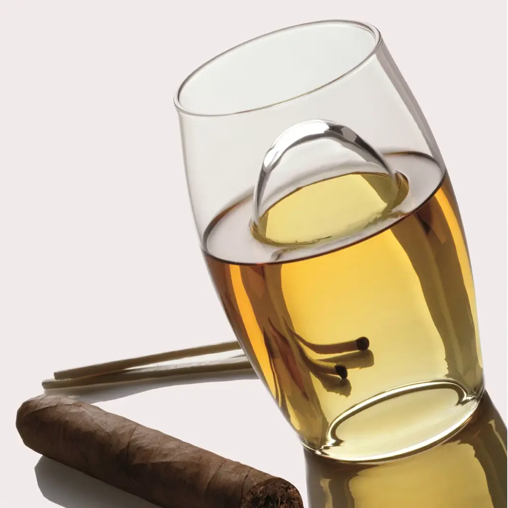 The unique shape of this glass was designed by Sara Guasticchi and crafted in borosilicate glass, which is highly resistant to cold and hot temperatures and makes this piece versatile and ideal for cold or hot drinks. Used upside-down, this glass features an inbuilt protection, allowing a natural insulation, making it also suitable to enjoy cognac.