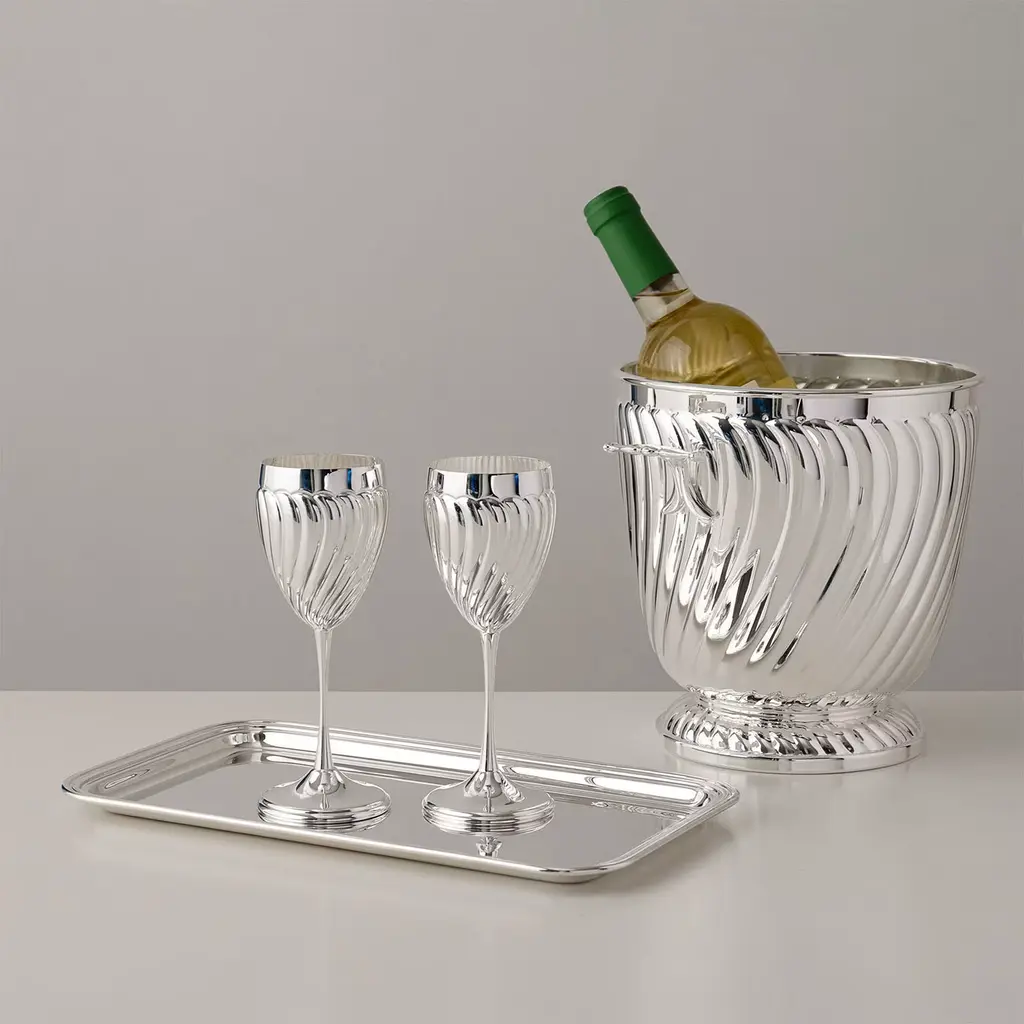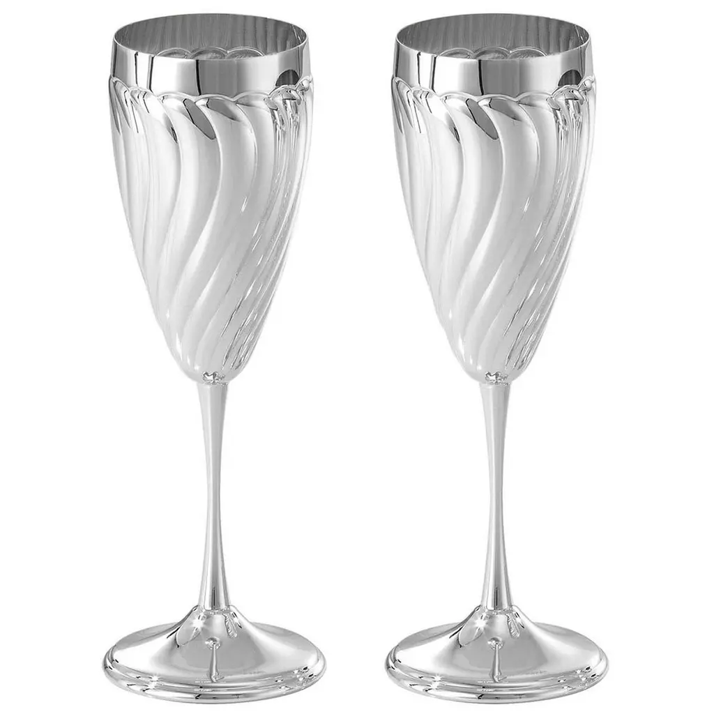 Set of 2 Twisted wine goblets bring refined dynamism to your dinners, thanks to their chiseled craftsmanship, a contemporary classic that naturally complements both traditional and modern tables. The brilliance of silver-plated brass and the dynamic lines illuminate the table with mesmerizing reflections and light effects, making them perfect for unforgettable dinners. Handcrafted in Italy following the tradition of fine silversmithing, with meticulous attention at every stage, they ensure lasting quality and timeless prestige. Also available in a larger size designed for water, please contact the Concierge for more information.