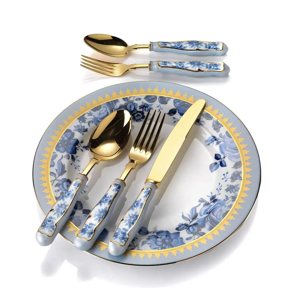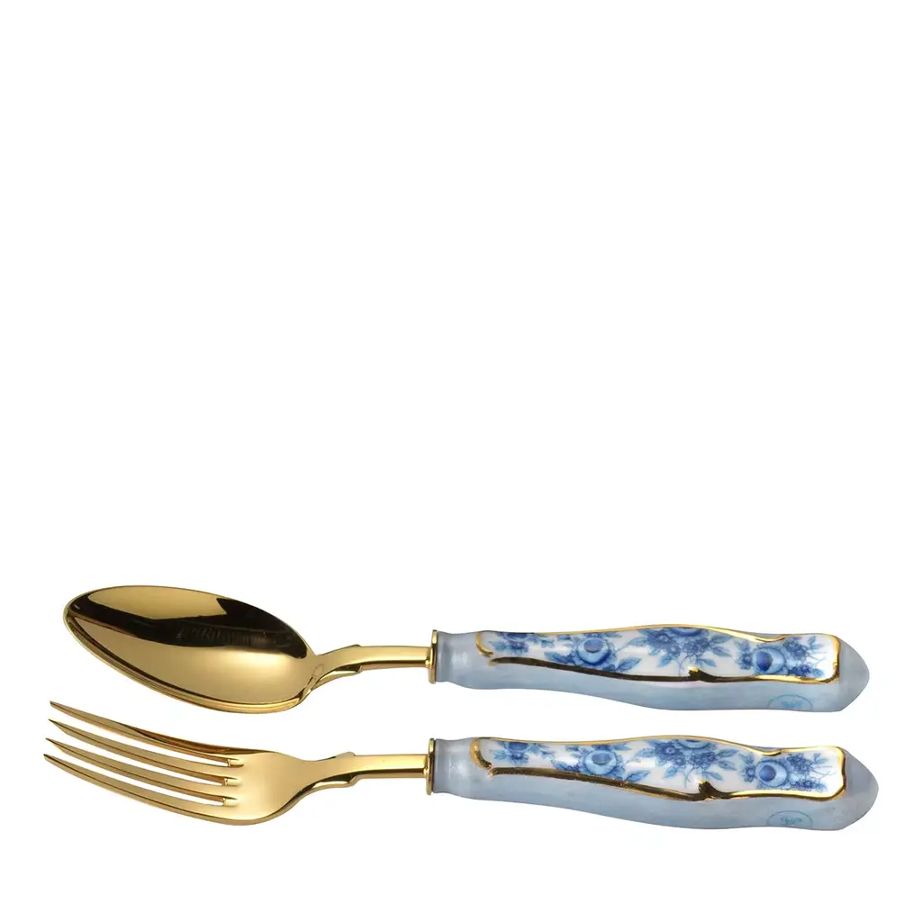 This porcelain cutlery set is part of the Blue Roses collection, decorated with silk pale blue color, blue roses, and real gold details. The set is composed of gold plated spoon, fork, and knife. This precious cutlery is very unique. Please ask the Concierge for customization options.