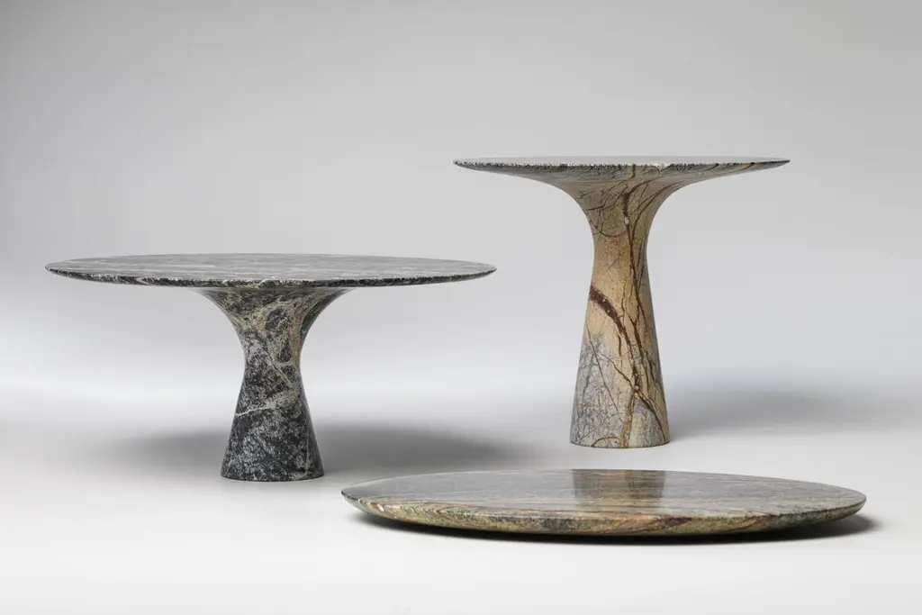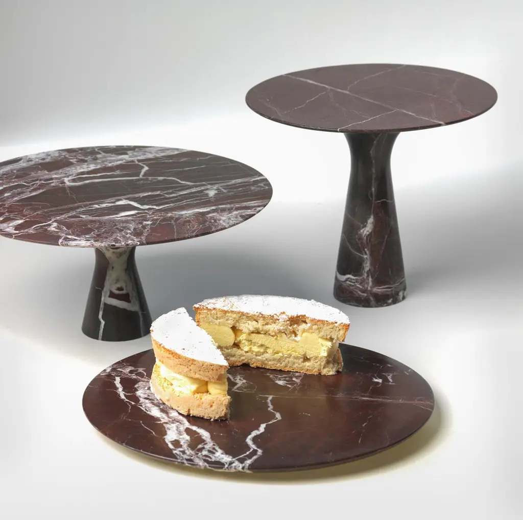 Set of 3 Refined Contemporary Marble Bianco Statuarietto Cake Stands and PlateSigned by Leo Aerts.Dimensions: D 26 x H 22.5 cm D 32 x H 15 cmD 32 x H 2 cmMaterial: Bianco Statuarietto marbleTechnique: Polished, carved. Available in marble: kyknos, bianco statuarietto, grey saint laurent, picasso green, port saint laurent, travertino silver, rosso lepanto, or travertino rosso. Available in sizes small or medium. Also available in sets. Angelo O is the brother and scale model of the natural stone table Angelo M. Angelo O can be ideally used as a cake dish or to serve other delicacies. The collection consists of three different models available in nine different marble types. Each object is completely hand-finished and is signed on the bottom. The slim base provides an elegant look and also promotes holding the object while serving.The objects have a honed, matte finish. Every Angelo O cake dish is packed in an original wooden gift box.A sculptural shape, robust material, elegant design, and a refined finish are the characteristics of Angelo O. The essence of each piece is defined by design, natural stone, and craftsmanship to meet the highest quality requirements. Angelo O2 is the little brother and scale model of the internationally award-winning Angelo M round table.Interior architect and designer Leo Aerts has run his own design agency Alinea for more than 30 years. The design has become part of his lifestyle. He swears by sober functional and timeless design that can be passed on from generation to generation. Neither Leo nor his designs can be categorized easily. The leitmotif? Durable materials are full of character. According to Leo, quality should always take precedence over quantity. His designs have repeatedly received national and international awards and accolades, including the coveted German Red Dot Award as well as the German Design Award, the Good Design Award in Chicago, and the AZ Award in Toronto.