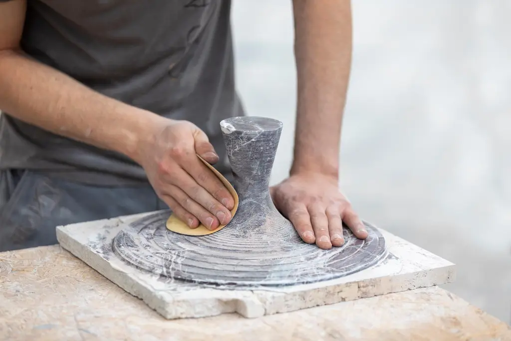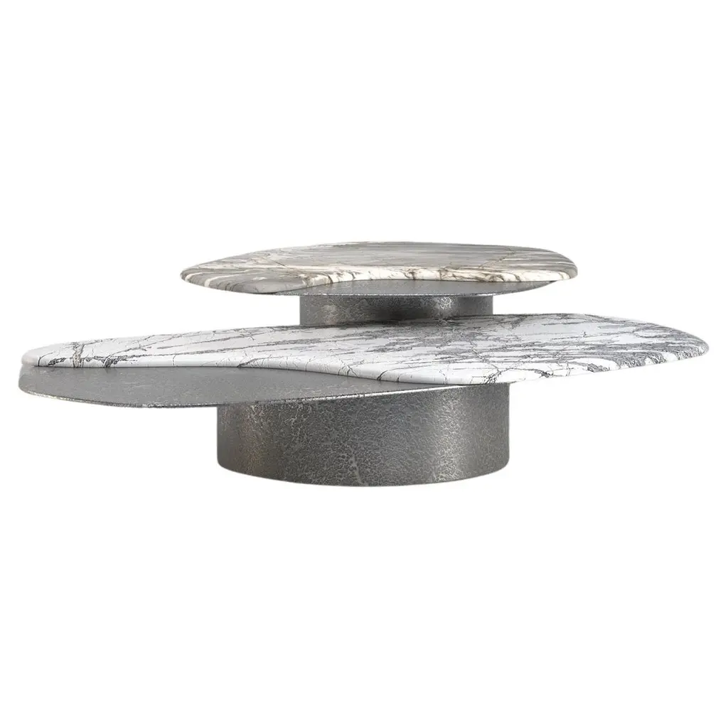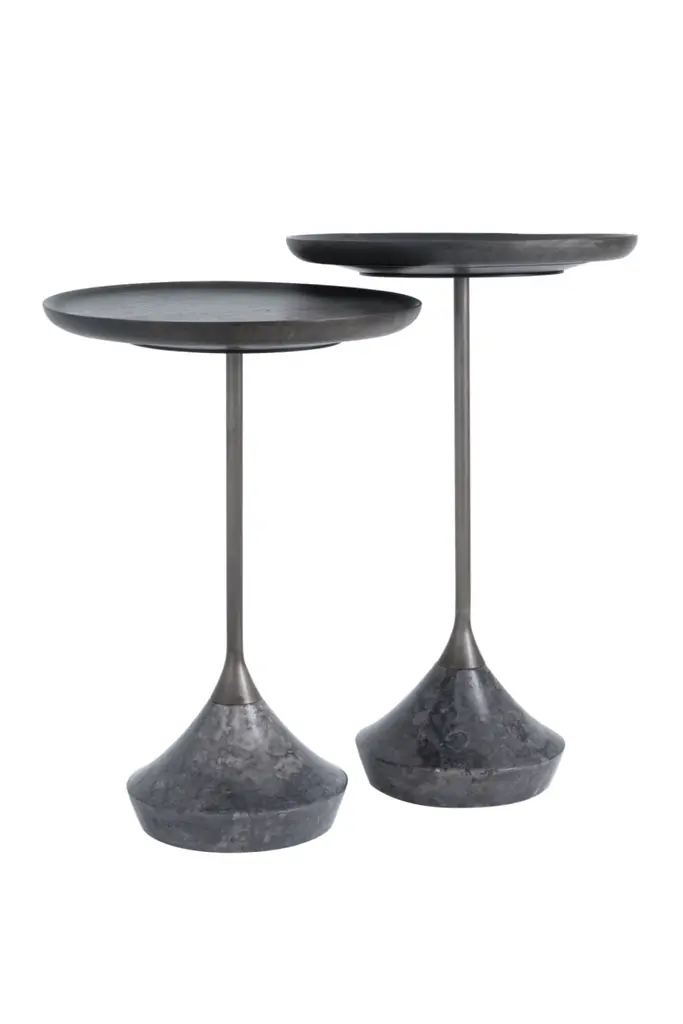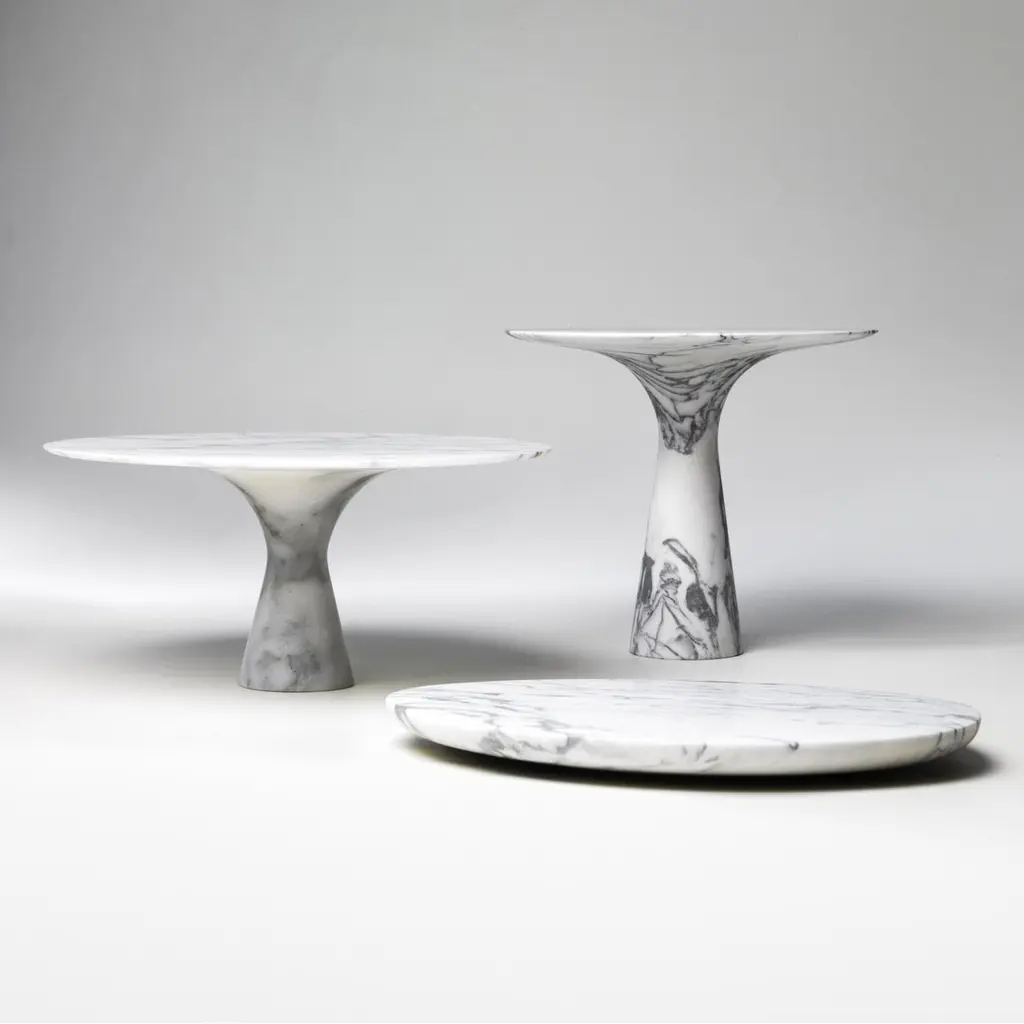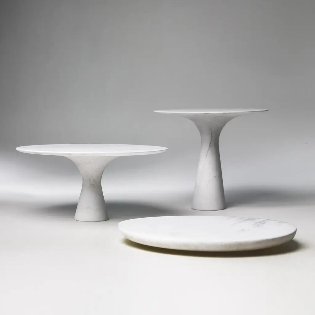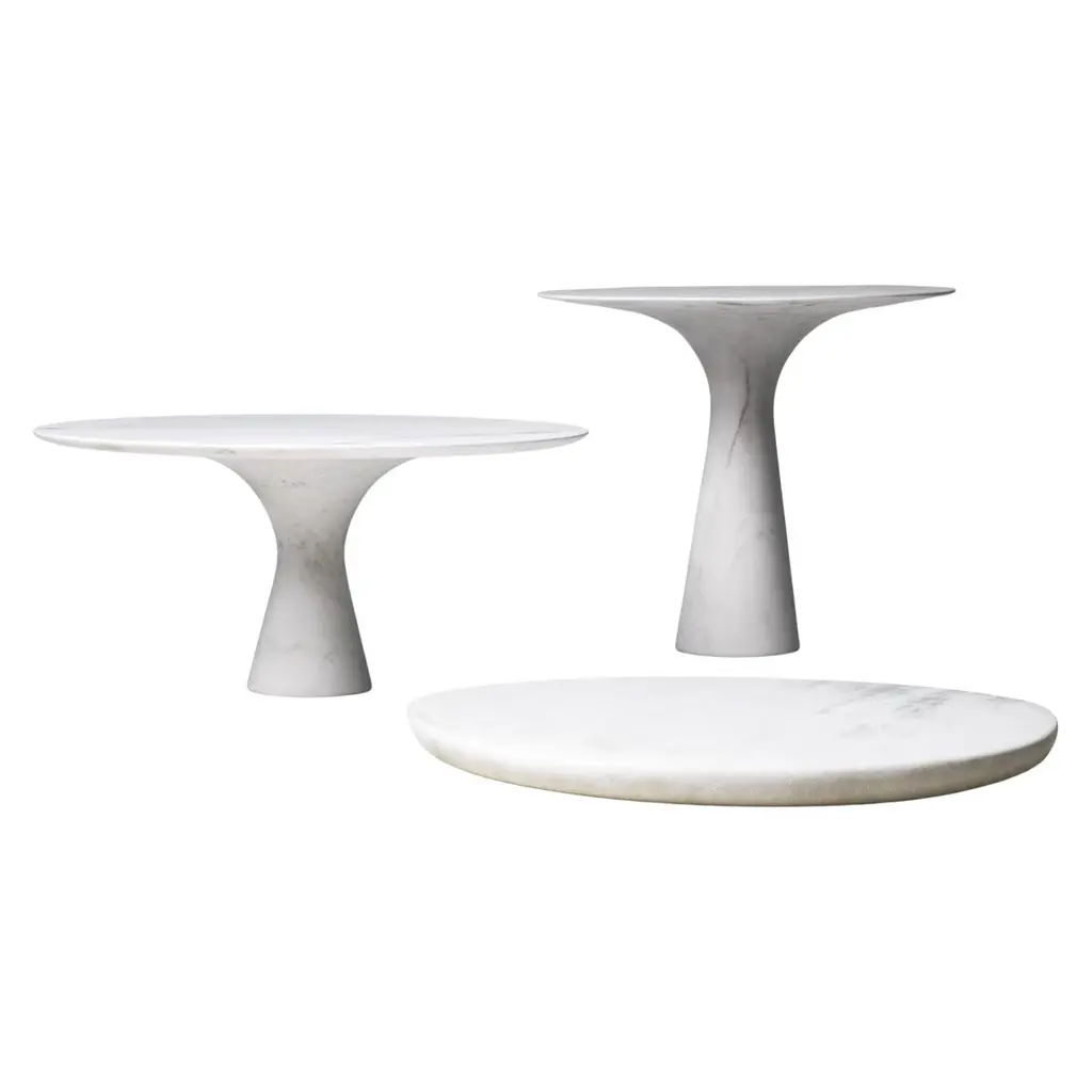 Set of 3 Refined Contemporary Marble Grafitte Cake Stands and PlateSigned by Leo Aerts.Dimensions: D 26 x H 22.5 cm D 32 x H 15 cmD 32 x H 2 cmMaterial: Grafitte marbleTechnique: Polished, carved. Available in marble: kyknos, bianco statuarietto, grey saint laurent, picasso green, port saint laurent, travertino silver, rosso lepanto, or travertino rosso. Available in sizes small or medium. Also available in sets. Angelo O is the brother and scale model of the natural stone table Angelo M. Angelo O can be ideally used as a cake dish or to serve other delicacies. The collection consists of three different models available in nine different marble types. Each object is completely hand-finished and is signed on the bottom. The slim base provides an elegant look and also promotes holding the object while serving.The objects have a honed, matte finish. Every Angelo O cake dish is packed in an original wooden gift box.A sculptural shape, robust material, elegant design, and a refined finish are the characteristics of Angelo O. The essence of each piece is defined by design, natural stone, and craftsmanship to meet the highest quality requirements. Angelo O2 is the little brother and scale model of the internationally award-winning Angelo M round table.Interior architect and designer Leo Aerts has run his own design agency Alinea for more than 30 years. The design has become part of his lifestyle. He swears by sober functional and timeless design that can be passed on from generation to generation. Neither Leo nor his designs can be categorized easily. The leitmotif? Durable materials are full of character. According to Leo, quality should always take precedence over quantity. His designs have repeatedly received national and international awards and accolades, including the coveted German Red Dot Award as well as the German Design Award, the Good Design Award in Chicago, and the AZ Award in Toronto.