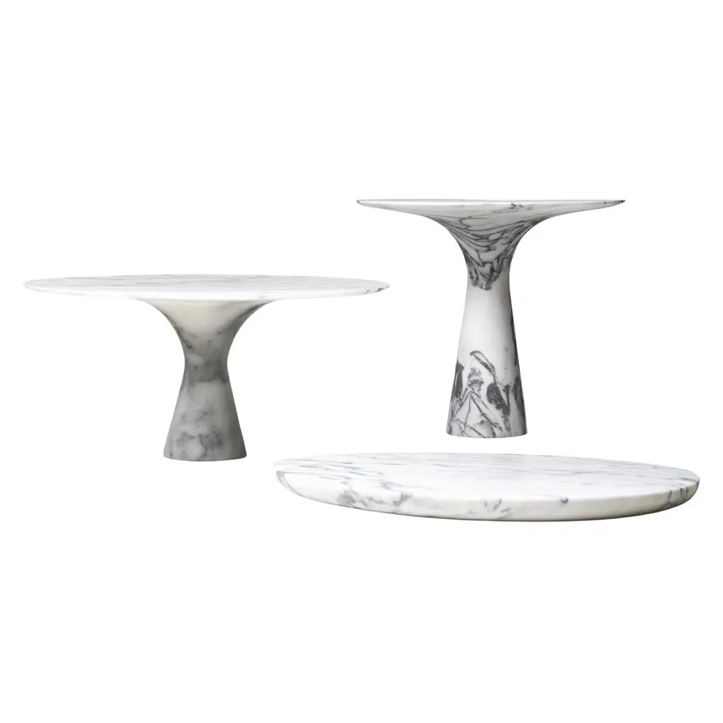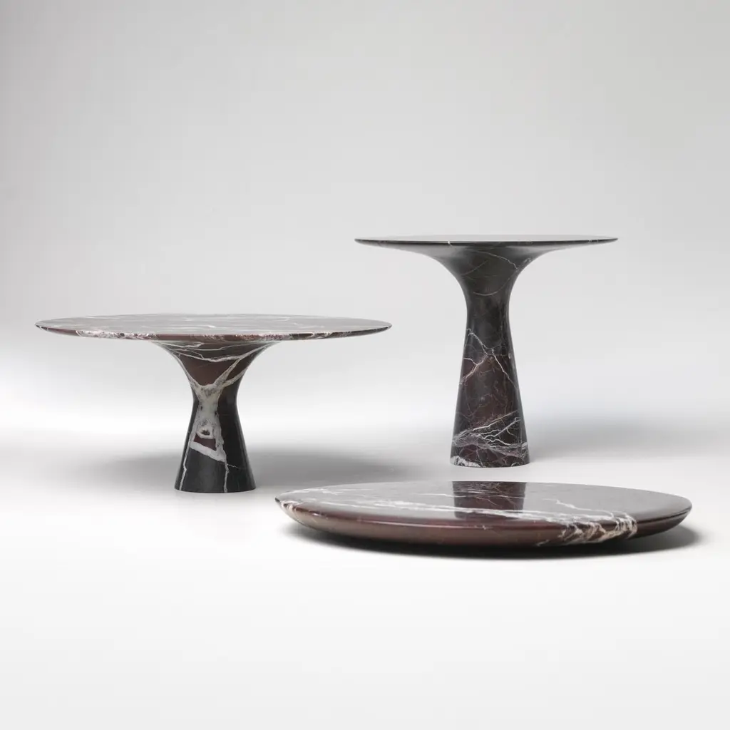 Set of 3 Refined Contemporary marble Kynos cake stands and plateSigned by Leo Aerts.Dimensions: D 26 x H 22.5 cm D 32 x H 15 cmD 32 x H 2 cmMaterial: Kynos marbleTechnique: Polished, carved. Available in marble: kyknos, bianco statuarietto, grey saint laurent, picasso green, port saint laurent, travertino silver, rosso lepanto, or travertino rosso. Available in sizes small or medium. Also available in sets. Angelo O is the brother and scale model of the natural stone table Angelo M. Angelo O can be ideally used as a cake dish or to serve other delicacies. The collection consists of three different models available in nine different marble types. Each object is completely hand-finished and is signed on the bottom. The slim base provides an elegant look and also promotes holding the object while serving.The objects have a honed, matte finish. Every Angelo O cake dish is packed in an original wooden gift box.A sculptural shape, robust material, elegant design, and a refined finish are the characteristics of Angelo O. The essence of each piece is defined by design, natural stone, and craftsmanship to meet the highest quality requirements. Angelo O2 is the little brother and scale model of the internationally award-winning Angelo M round table.Interior architect and designer Leo Aerts has run his own design agency Alinea for more than 30 years. The design has become part of his lifestyle. He swears by sober functional and timeless design that can be passed on from generation to generation. Neither Leo nor his designs can be categorized easily. The leitmotif? Durable materials are full of character. According to Leo, quality should always take precedence over quantity. His designs have repeatedly received national and international awards and accolades, including the coveted German Red Dot Award as well as the German Design Award, the Good Design Award in Chicago, and the AZ Award in Toronto.