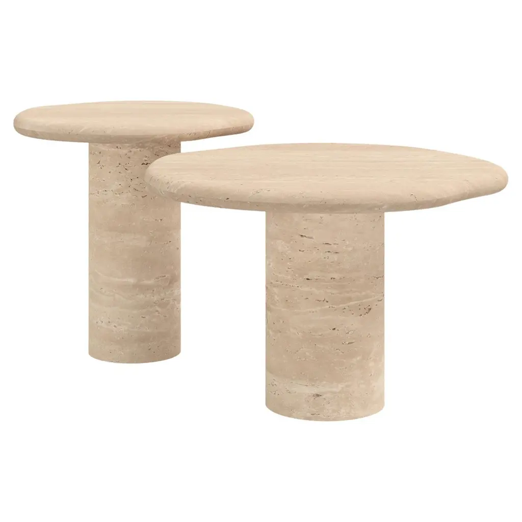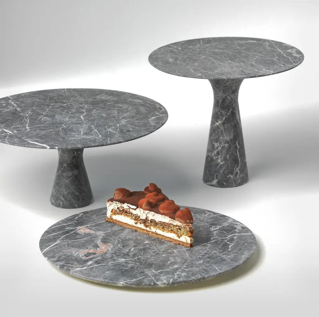 Set of 3 Refined Contemporary Marble Travertino Silver Cake Stands and PlateSigned by Leo Aerts.Dimensions: D 26 x H 22.5 cm D 32 x H 15 cmD 32 x H 2 cmMaterial: Travertino Silver marbleTechnique: Polished, carved. Available in marble: Kyknos, Bianco Statuarietto, Grey Saint Laurent, Picasso Green, Port Saint Laurent, Travertino Silver, Rosso Lepanto, or Travertino Rosso. Available in sizes Small or Medium. Also available in Sets. Angelo O is the brother and scale model of the natural stone table Angelo M. Angelo O can be ideally used as a cake dish or to serve other delicacies. The collection consists of three different models available in nine different marble types. Each object is completely hand-finished and is signed on the bottom. The slim base provides an elegant look and also promotes holding the object while serving.The objects have a honed, matte finish. Every Angelo O cake dish is packed in an original wooden gift box.A sculptural shape, robust material, elegant design, and a refined finish are the characteristics of Angelo O. The essence of each piece is defined by design, natural stone, and craftsmanship to meet the highest quality requirements. Angelo O2 is the little brother and scale model of the internationally award-winning Angelo M round table.Interior architect and designer Leo Aerts has run his own design agency Alinea for more than 30 years. The design has become part of his lifestyle. He swears by sober functional and timeless design that can be passed on from generation to generation. Neither Leo nor his designs can be categorized easily. The leitmotif? Durable materials are full of character. According to Leo, quality should always take precedence over quantity. His designs have repeatedly received national and international awards and accolades, including the coveted German Red Dot Award as well as the German Design Award, the Good Design Award in Chicago, and the AZ Award in Toronto.