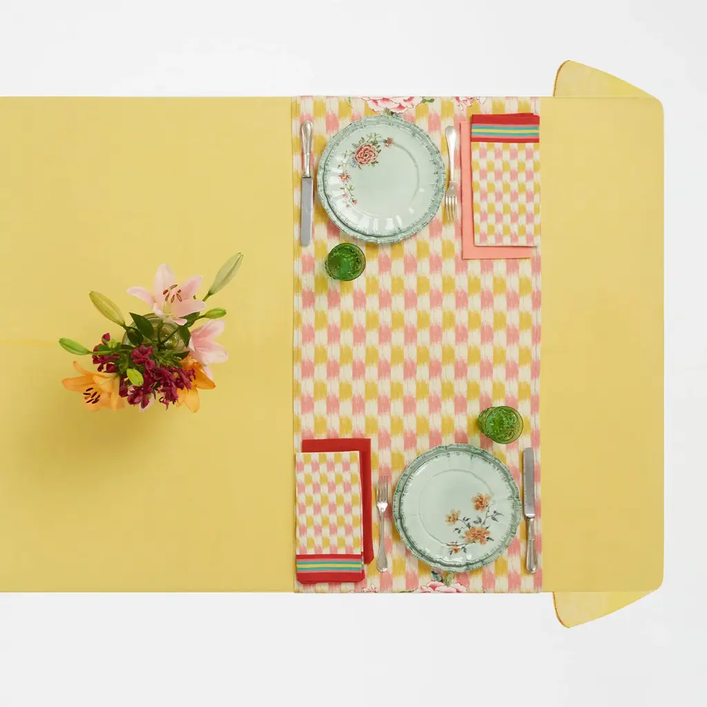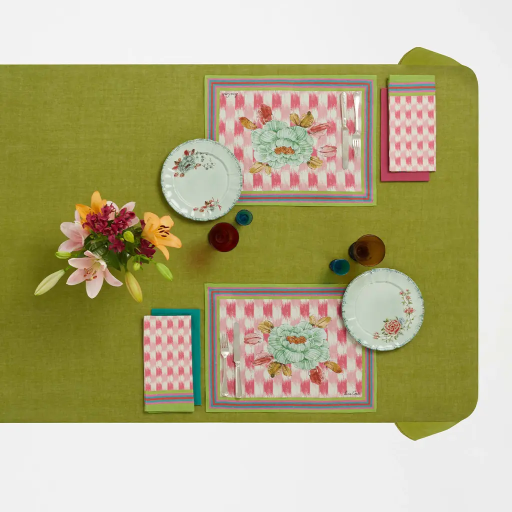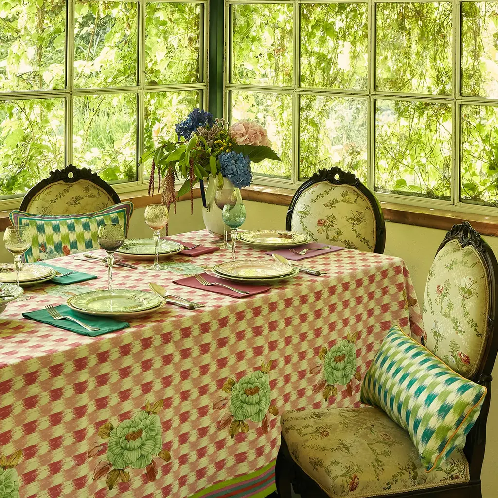 This collection, which was born within a capsule of ceramics and home textiles created in collaboration with Lisa Corti, combines the history and imagery of two worlds in a fresh and versatile palette. The shaped form emphasizes the romantic theme, while the fringed, hand-painted edge recalls traditional ikat textile prints.