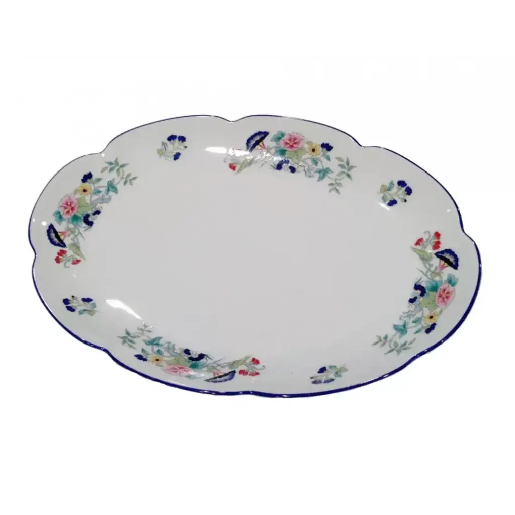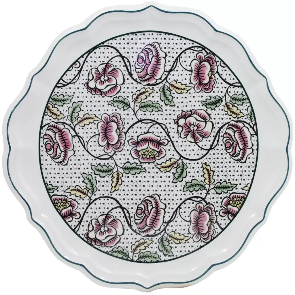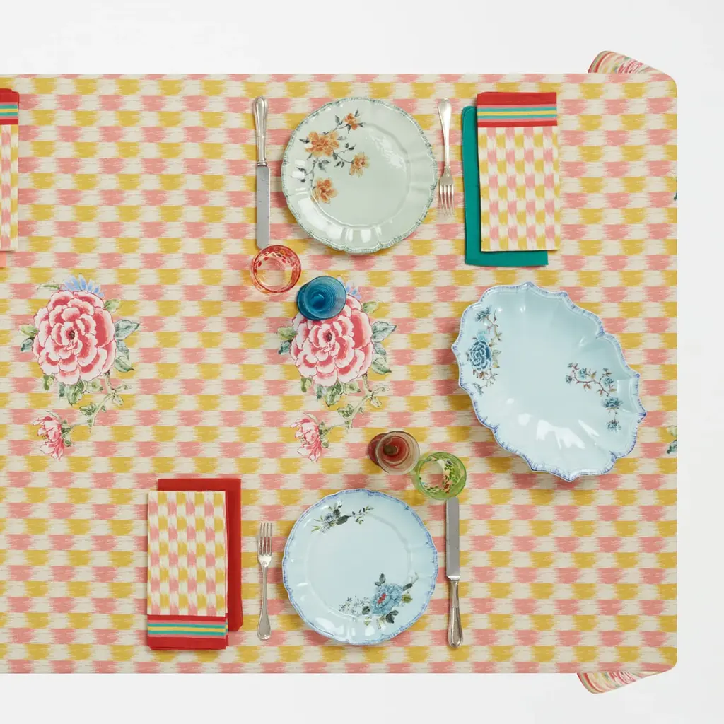 This collection, which was born within a capsule of ceramics and home textiles created in collaboration with Lisa Corti, combines the history and imagery of two worlds in a fresh and versatile palette. The shaped form emphasizes the romantic theme, while the fringed, hand-painted edge recalls traditional ikat textile prints.