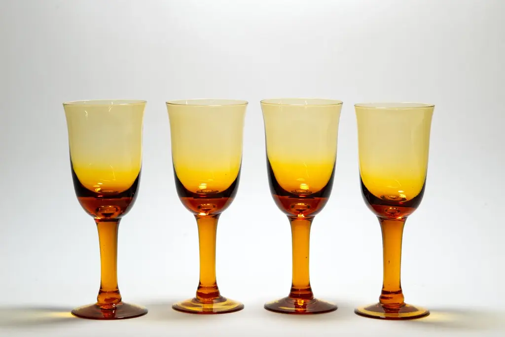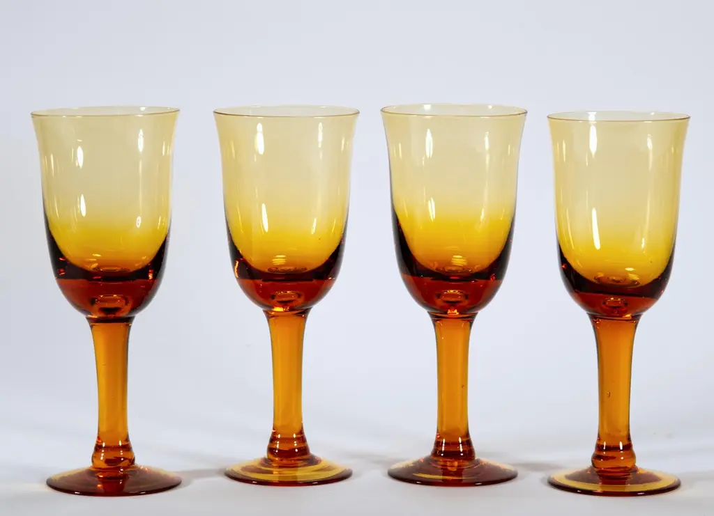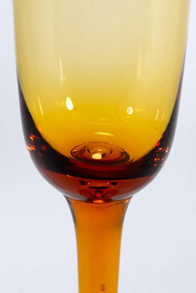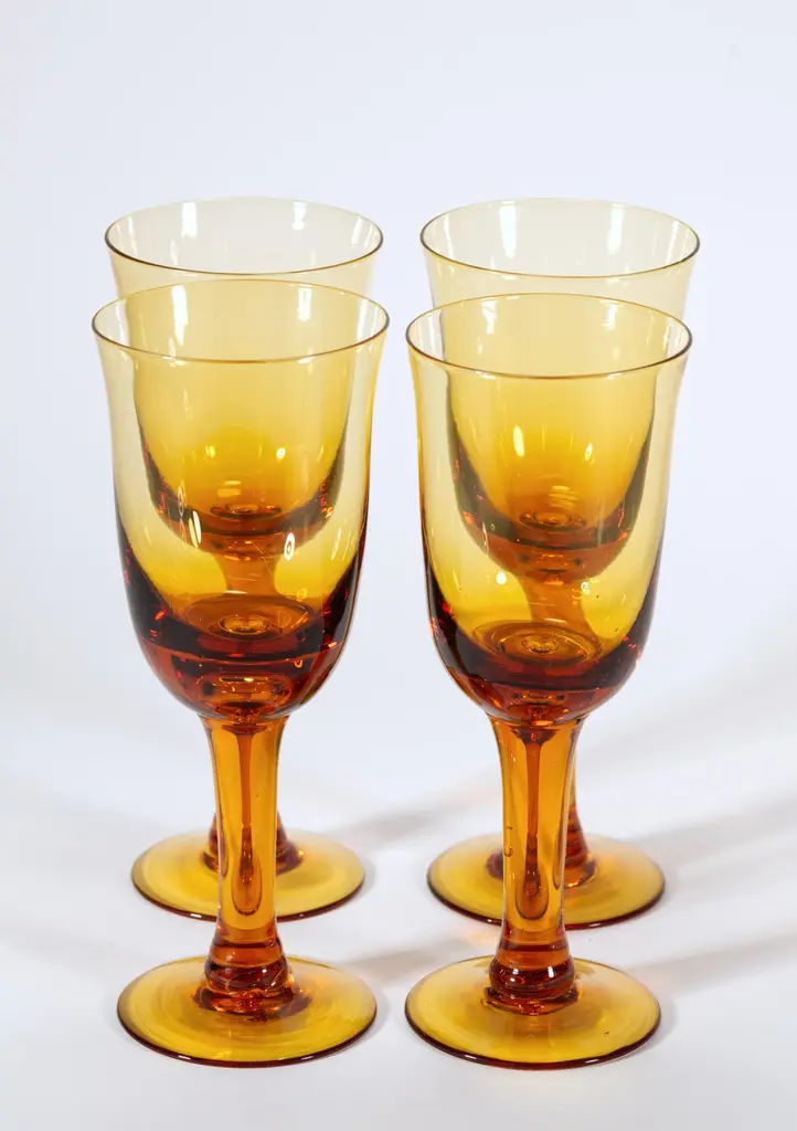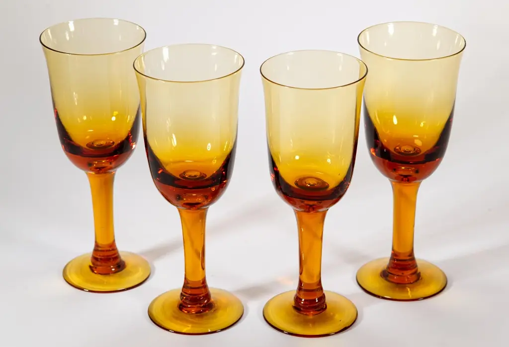 Set Of 4 Amber Hand Blown Glasses Goblets With Controlled Bubbles