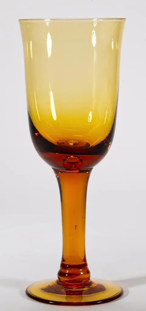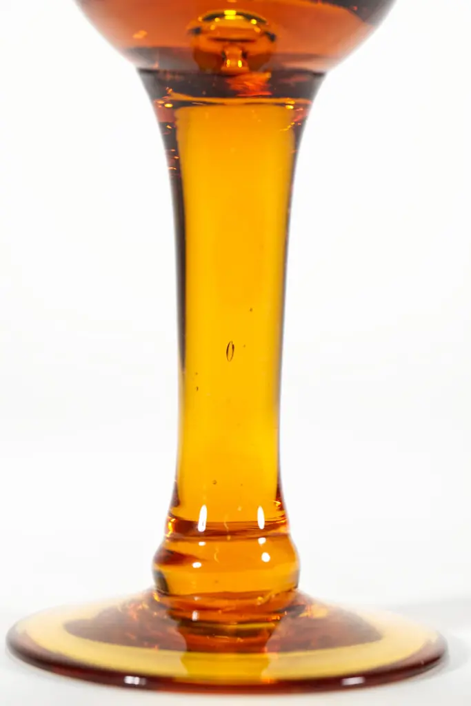 Set of 4 goblets can be used either as wine or water glasses. The goblets are hand blown of deep, almost honey-hued amber glass, with a large controlled bubble at the base of the bowl adding visual interest to minimally shaped pieces. Lightly textured foot and base of the goblet balance streamlined bowl.