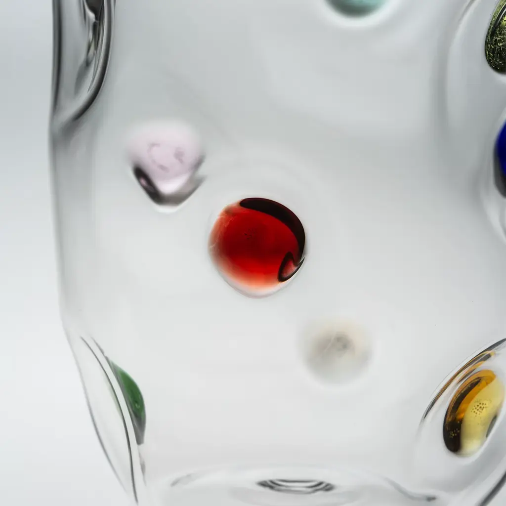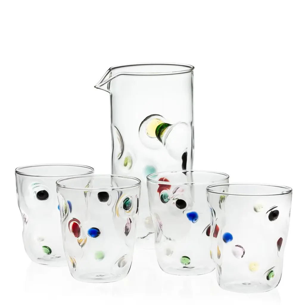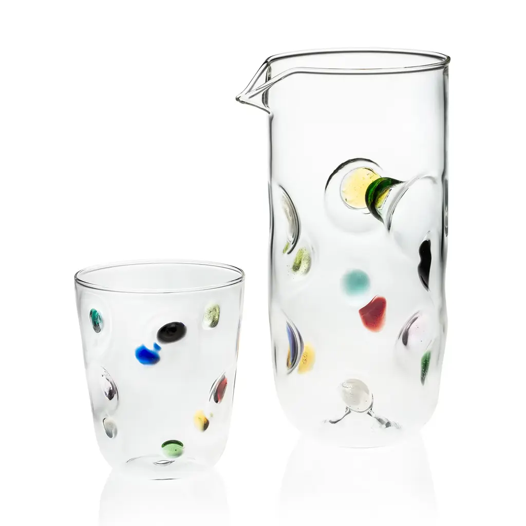 This set of four Arlecchino colored water glasses is a delightful addition to any table setting. Each piece is handcrafted in Venice, showcasing transparent glass that is beautifully adorned with vibrant, multicolored glass pois. The playful design features smooth surfaces interrupted by expertly melted colored pois, creating an engaging interplay of light and color. Originally inspired by the colored bubble glasses featured in the Casarialto catalog, the Arlecchino collection is celebrated for its unique blend of lightness and durability. These glasses are perfect for everyday use, combining elegance with practicality. Measuring H 11 x Ø 9 cm, they are designed to elevate the aesthetic of any dining experience. Dishwasher safe for easy care, these glasses are ideal for both casual and formal occasions, adding a touch of sophistication and playfulness to any gathering.