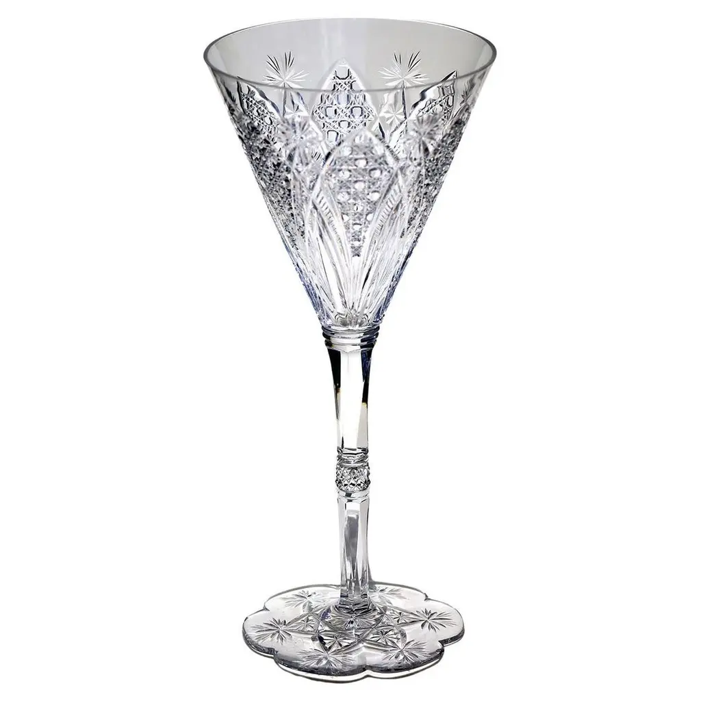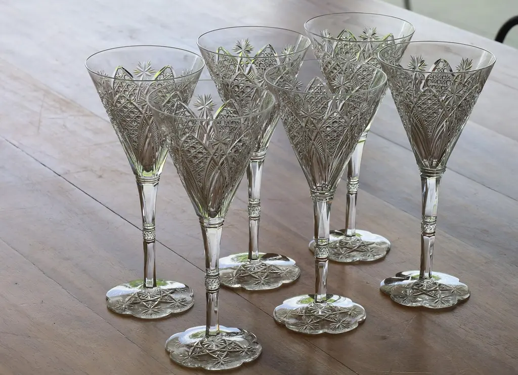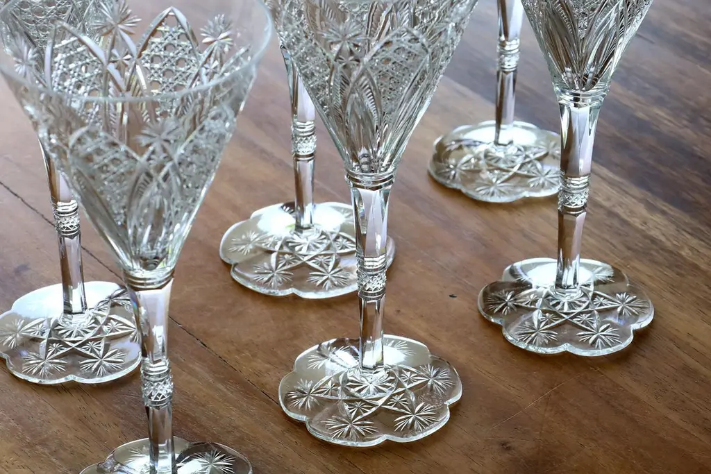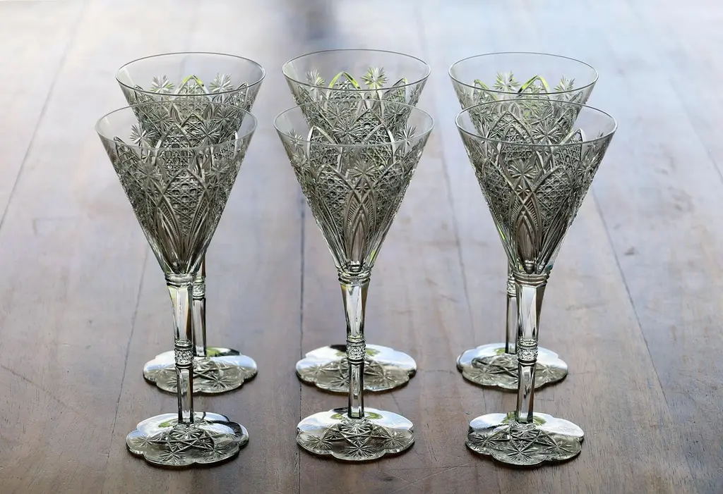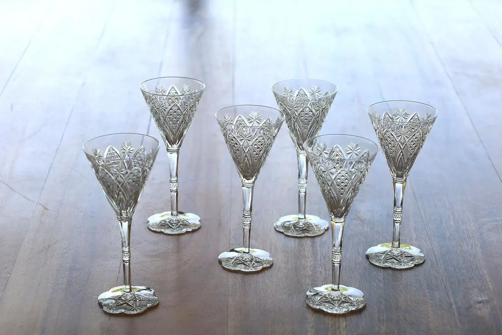 Baccarat Elbeuf service was first introduced in 1908 and presented at the International Exhibition in Nancy, France in 1909. Specially ordered in 1920 by the Maharaja of Baroda. This set of 6 signed Baccarat glasses are hand blown clear crystal and cut with elegant lines, brilliantly refracting light like a rainbow and they ring like a bell. The exquisite cutting on the bowls suggest diamonds, jewels and palmettes that evoke a flower when seen from above in keeping with the Art Nouveau style of the time.