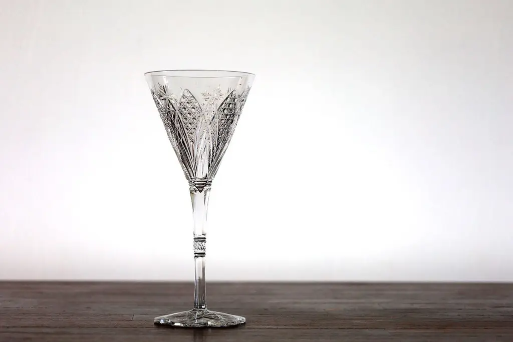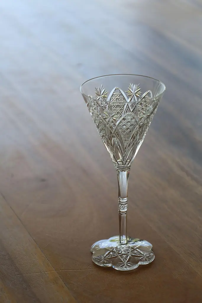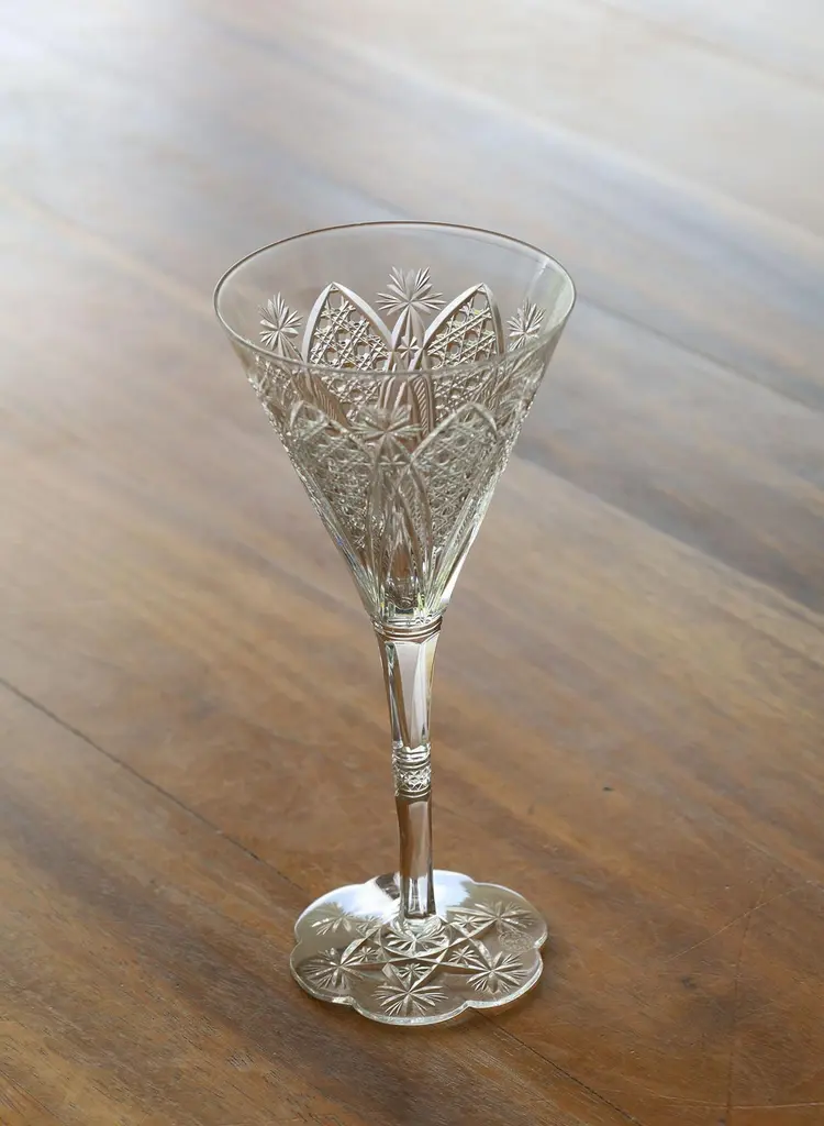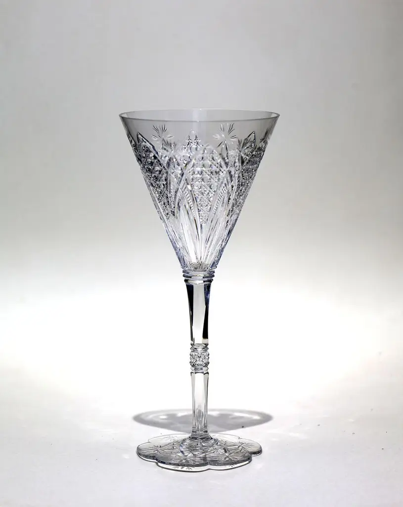Baccarat Elbeuf service was first introduced in 1908 and presented at the International Exhibition in Nancy, France in 1909. Specially ordered in 1920 by the Maharaja of Baroda. This set of 6 signed Baccarat glasses are hand blown clear crystal and cut with elegant lines, brilliantly refracting light like a rainbow and they ring like a bell. The exquisite cutting on the bowls suggest diamonds, jewels and palmettes that evoke a flower when seen from above in keeping with the Art Nouveau style of the time.