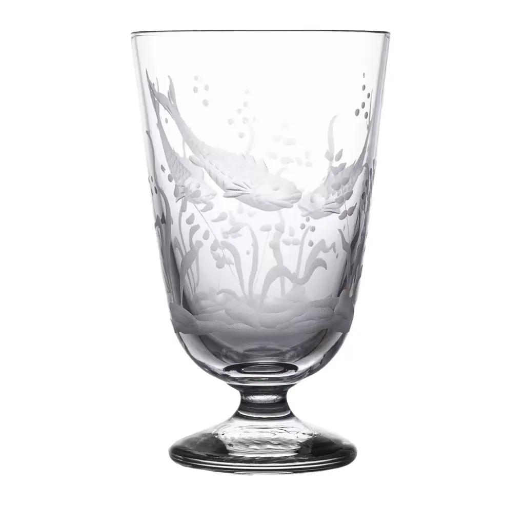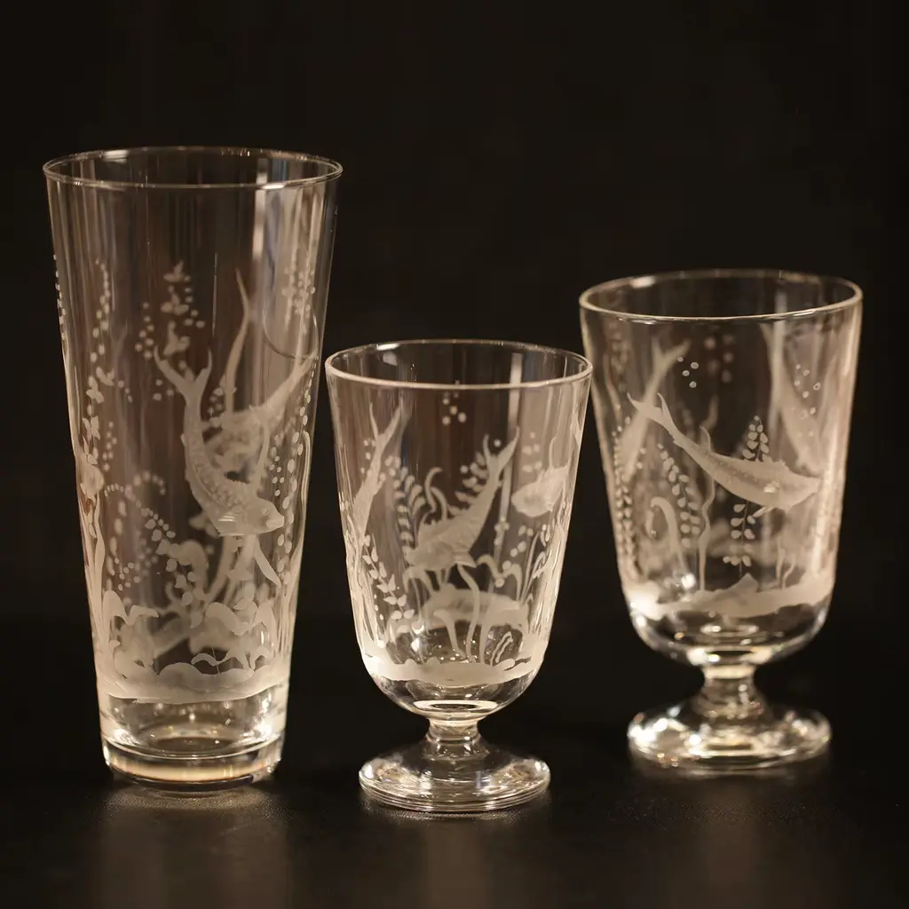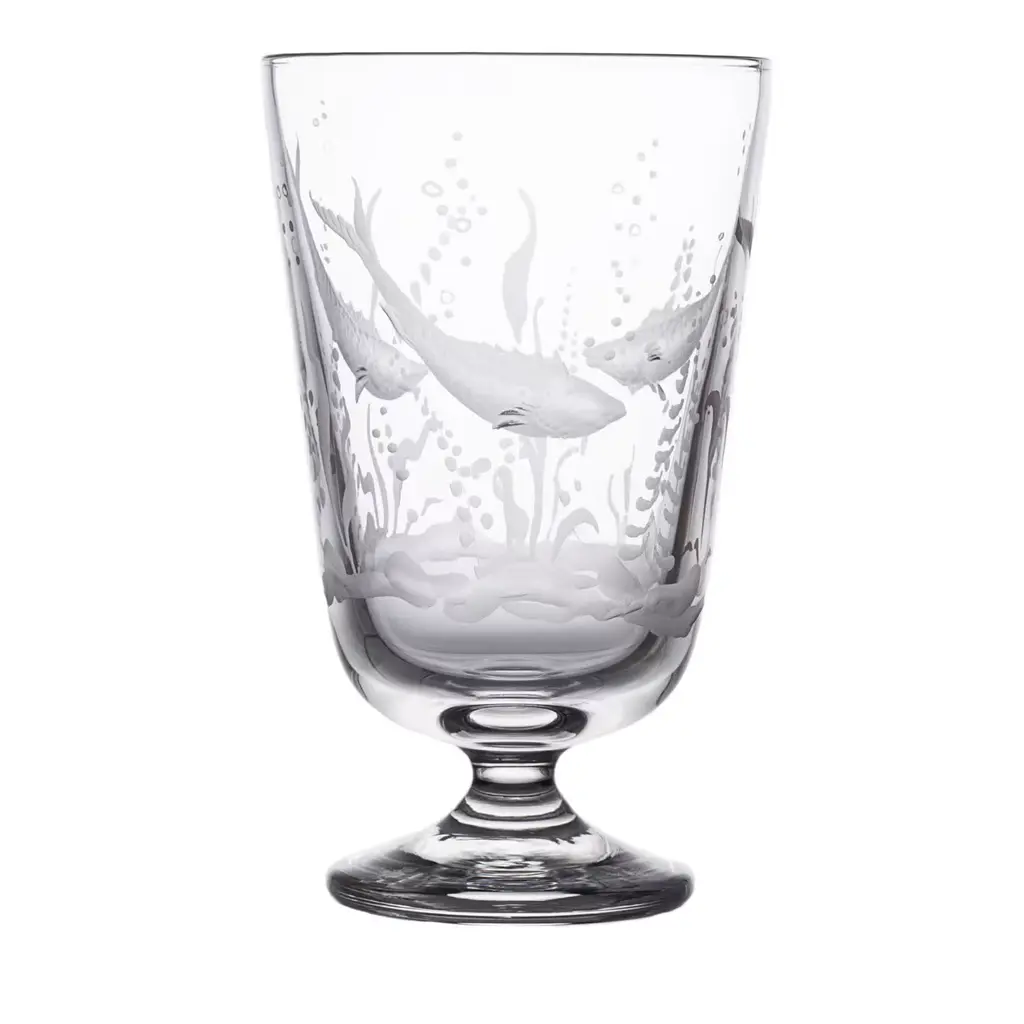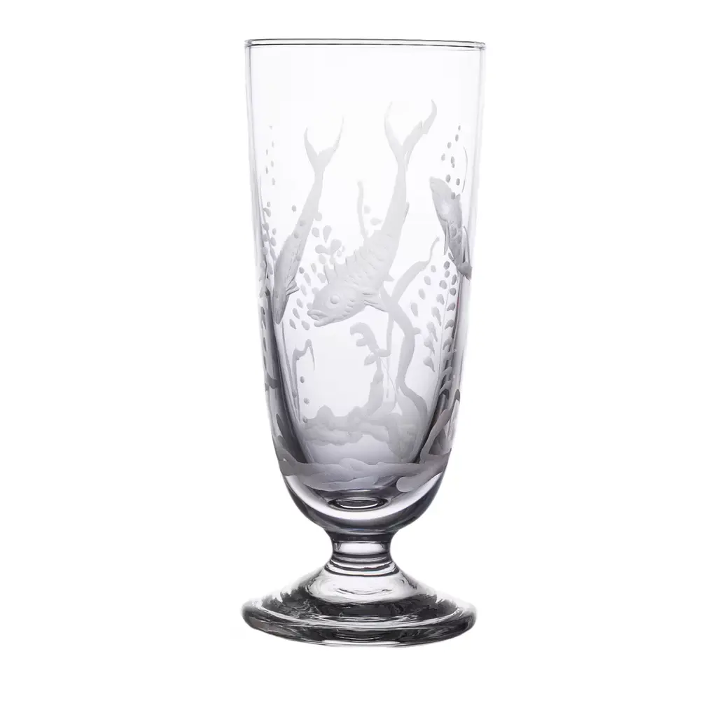 A set of 4 different glasses depicting an underwater scene, flawlessly engraved by the skilled artisans of Moleria Locchi in Florence. Note the different yet millimetric depths in the handmade etchings, in particular the detail of the fish scales, that make up this classic design. Water glass: L 7,5 X H 12 X 7,5 cm; wine glass: L 6,5 X H 11,5 X 6,5 cm; champagne glass: L 5,8 X H 14 X 5,8 cm; tall glass: L 7,5 X 16 X 7,5 cm.