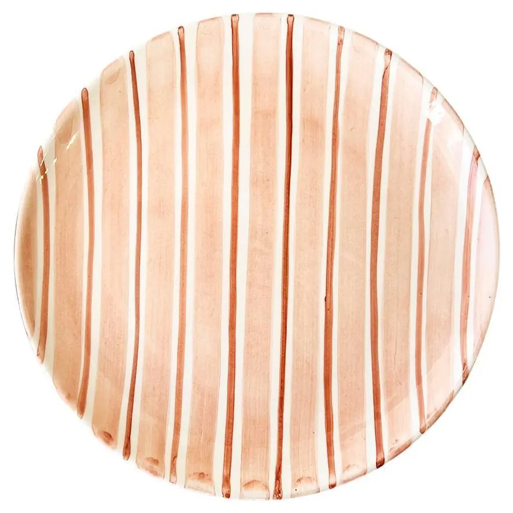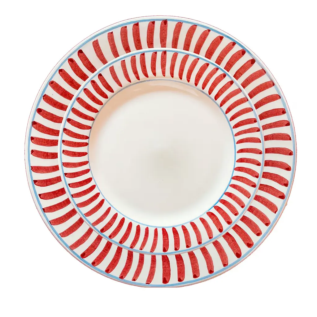 This set of four hand-painted ceramic dining plates, featuring elegant red stripes, adds a touch of sophistication to any table. Crafted with care, these Italian-made plates are perfect for both everyday dining and special occasions.