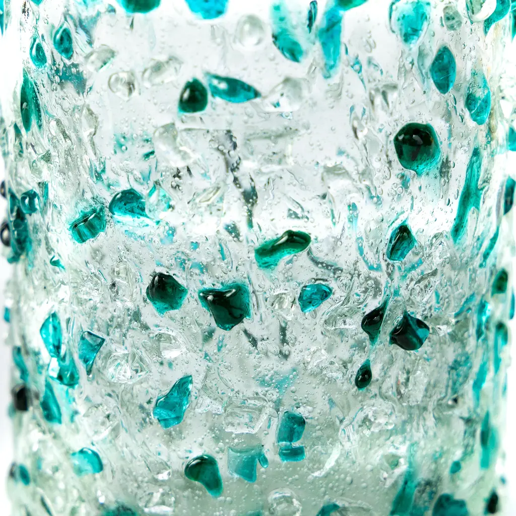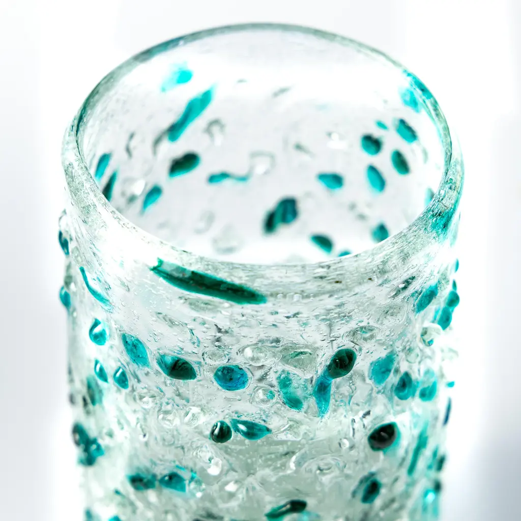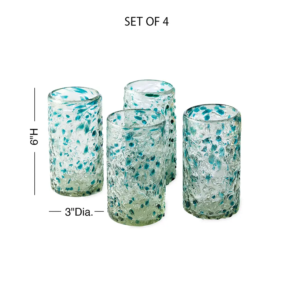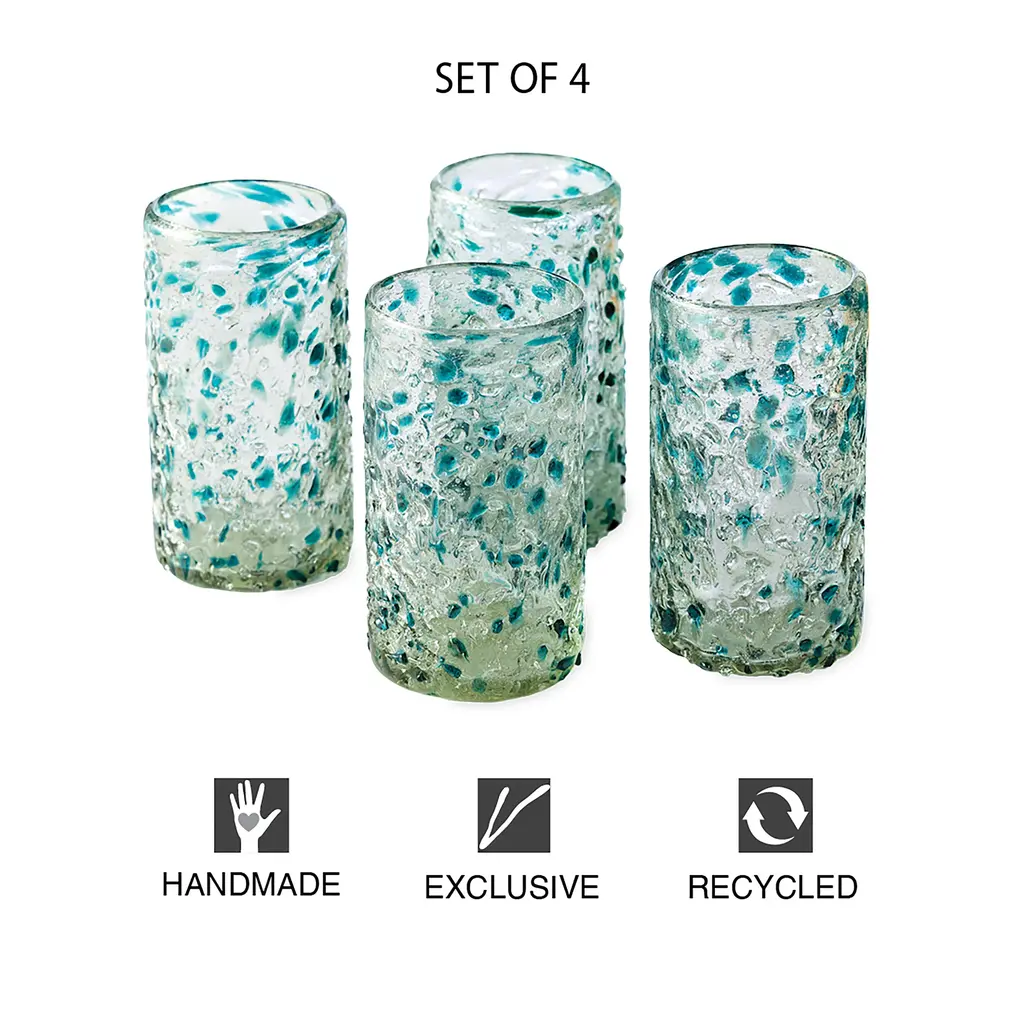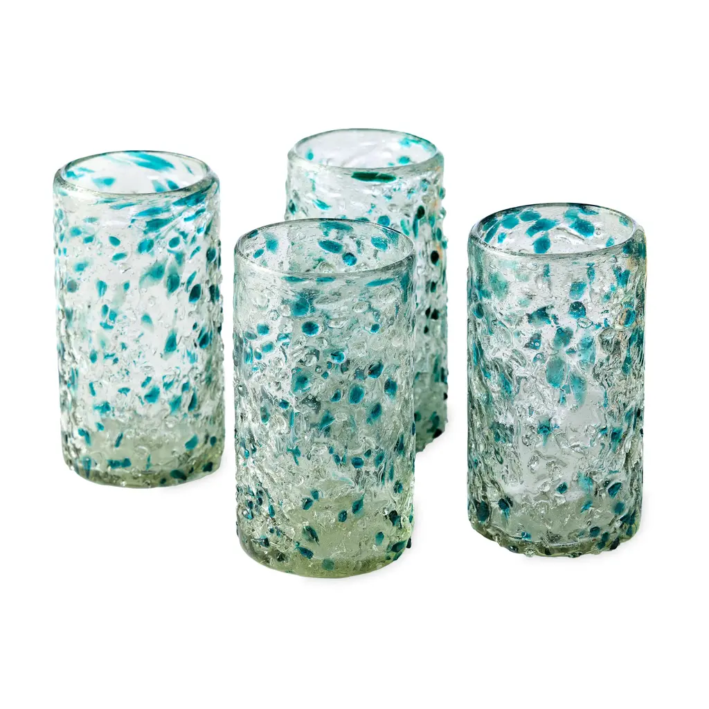Handcrafted by artisans in Mexico of mouthblown recycled glass, each weighty piece features variations that make it entirely unique. These thick bar glasses feature splashes of colorful sea tones for sunny-day sipping and easygoing outdoor entertaining. Transforming trash into treasure, our set of four handcrafted glasses is made using old soda bottles rescued from the landfill. Grace your table with an explosion of sparkling colors created by melting and artfully reforming the reclaimed glass.