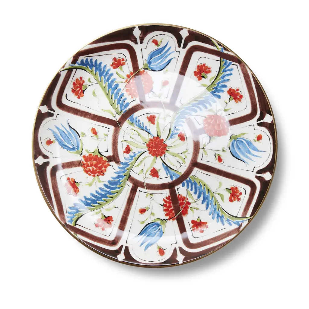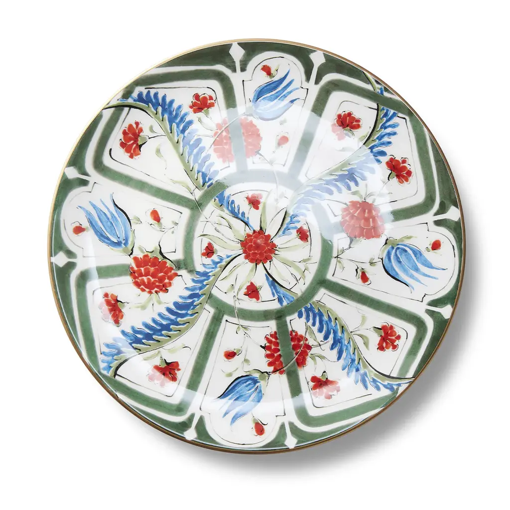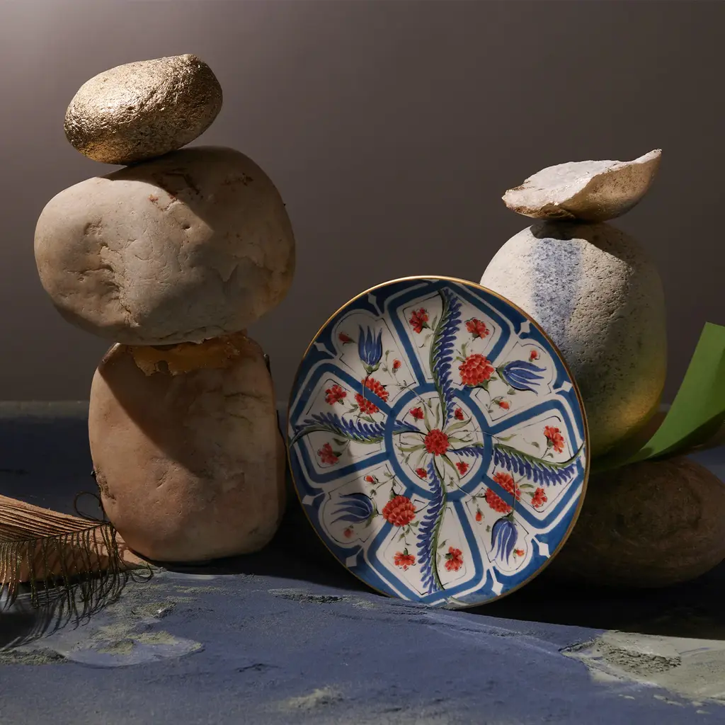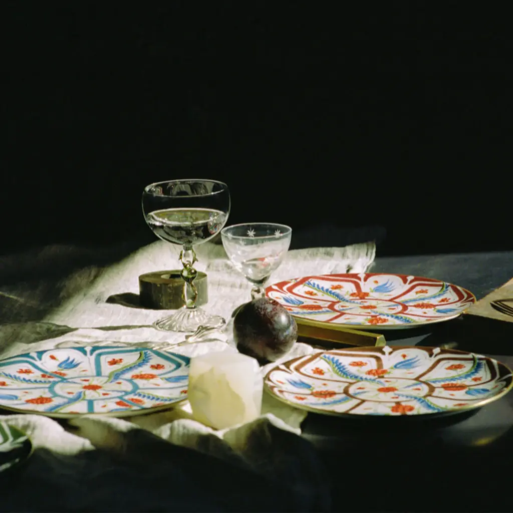 This vibrant series captures the name of the ancient city of Smirne. It reinterprets the typical geometries and elements of the valuable İznik ceramics, which were well-known for their refined underglaze decoration techniques during the Ottoman Empire. This vibrant set is enhanced by the handmade gold rim. A nostalgic journey to the Middle East, a mysterious land in the middle, to reopen a window onto the Mediterranean.