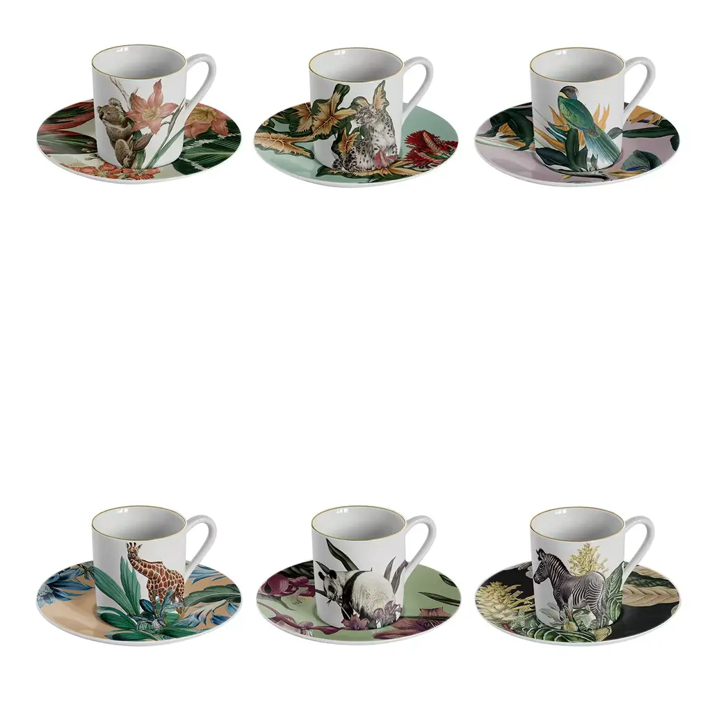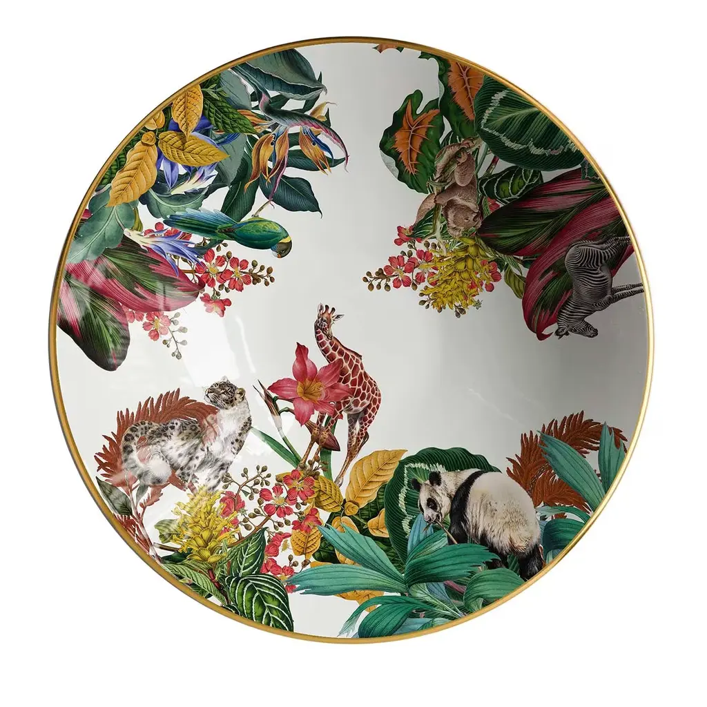 A jungle: an effective rhetorical figure to evoke the marvelous and inextricable chaos of the interweaving of leaves, roots, trunks, and lianas in equatorial forests. The border of this Collection, too, is overrun with dense and colorful vegetation, from which four majestic rulers of those exotic and unexplored places cautiously peek out.