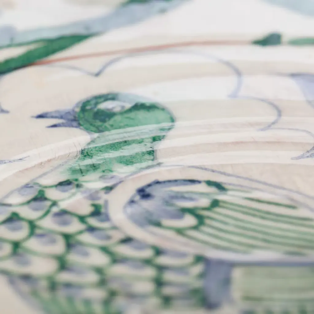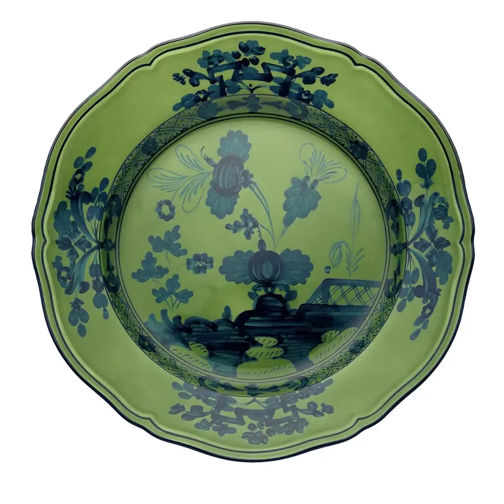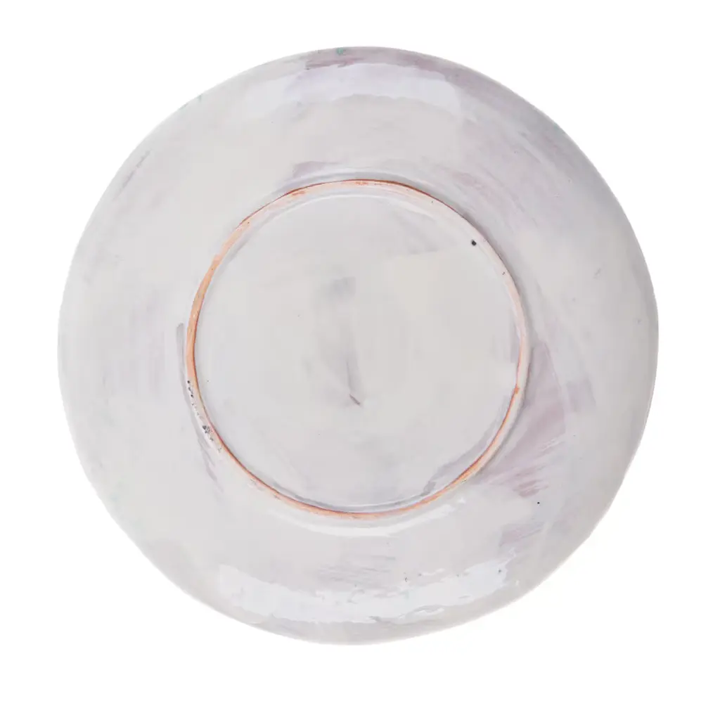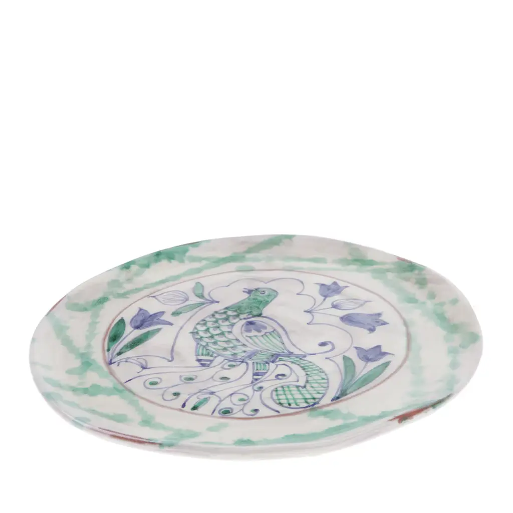 These stylish plates are entirely handcrafted by the skilled artisans of Nuove Forme both in the molding of the clay, the typically Mediterranean terra rossa, and in its embellishment. The painted decoration is a modern reinterpretation of classic designs inspired by peacocks, here featuring at the center of each plate. This set, part of the Pavone Collection, includes 4 plates suitable for main courses.