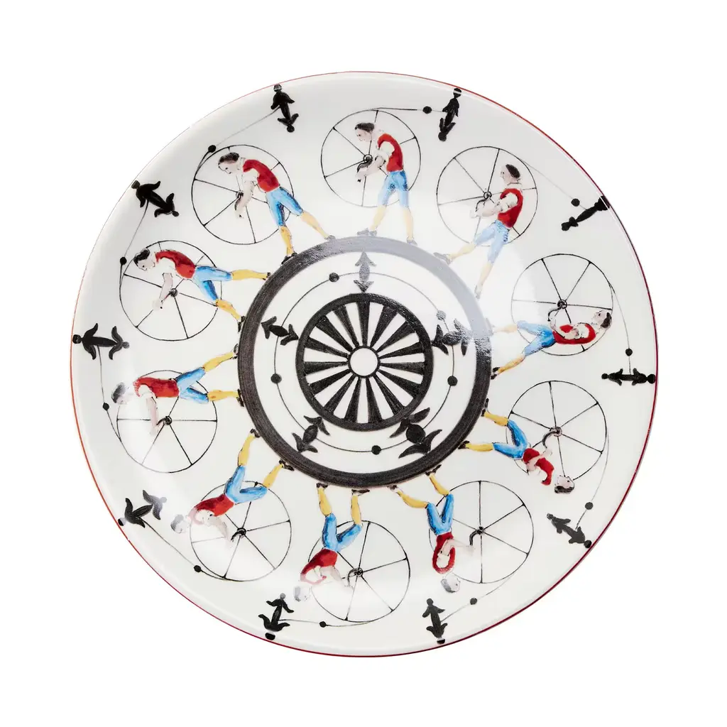 If the Lumière brothers imagined a Collection, it would most likely look something like this. The protagonists of these playful and colorful plates, shown at the 2016 Design Week, are just waiting to rotate around their center, as in an ancient zoetrope, to come to life. So, the swallow is getting ready to spread its wings, the horse is getting ready to leap over the obstacle, and the juggler is getting ready to finish his act.