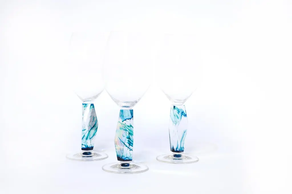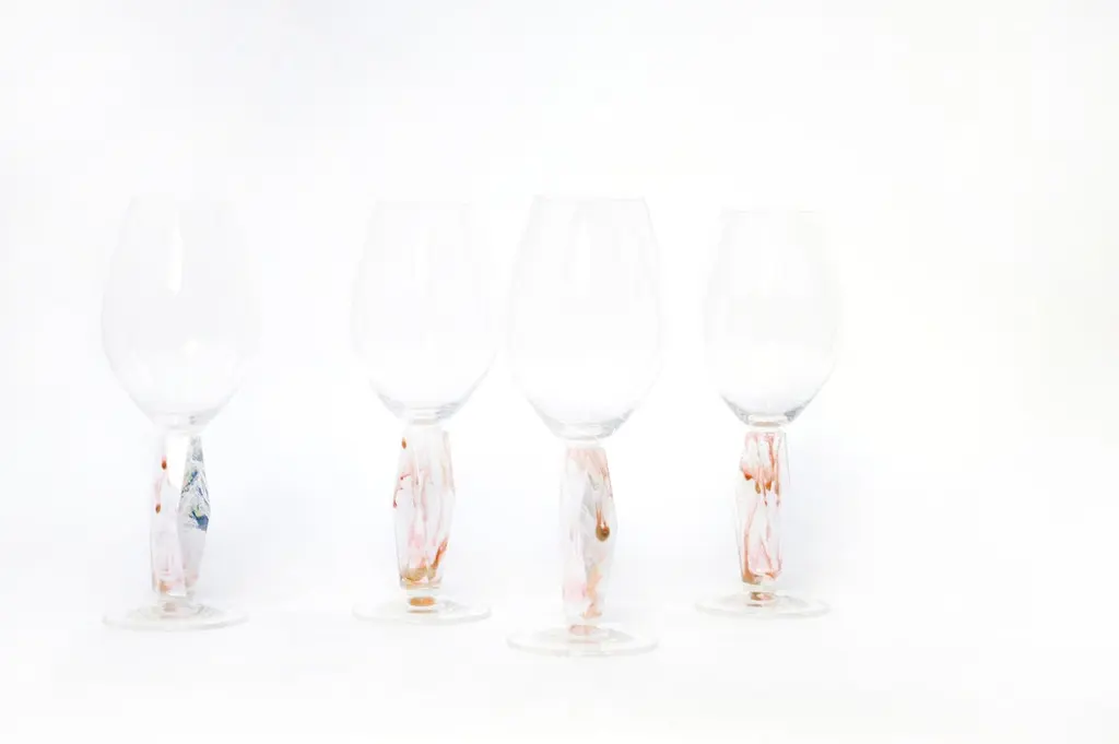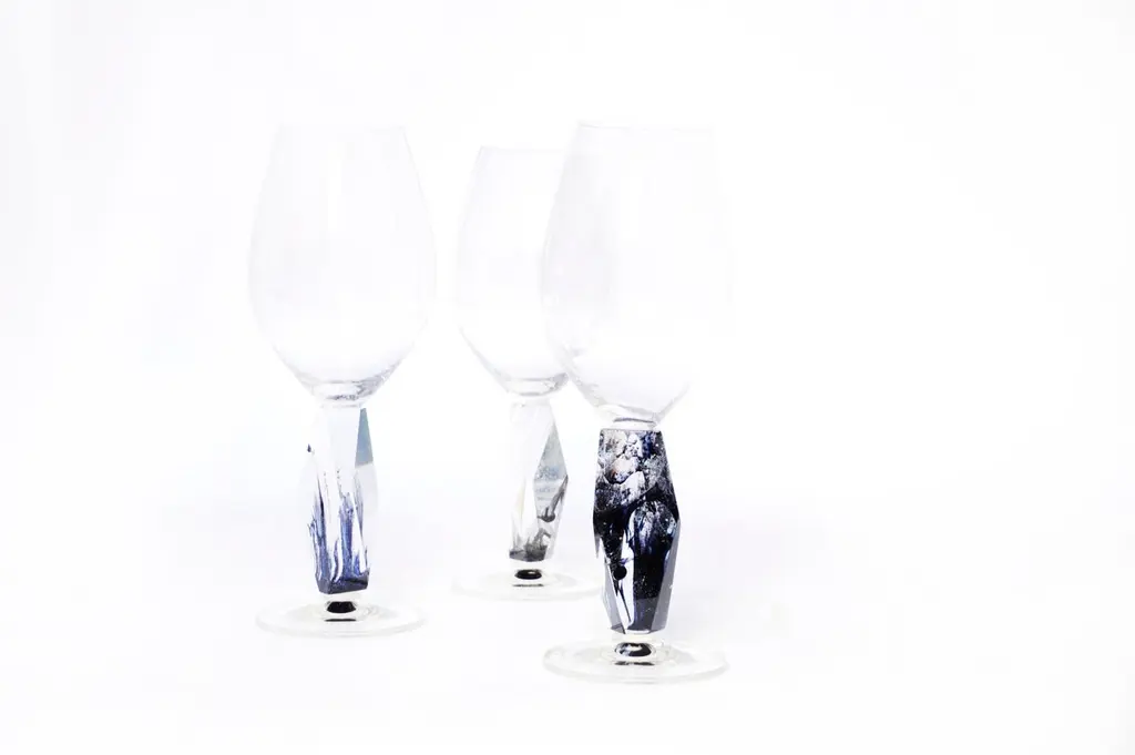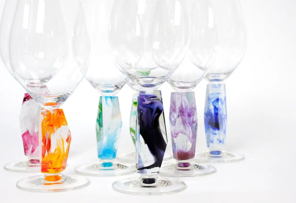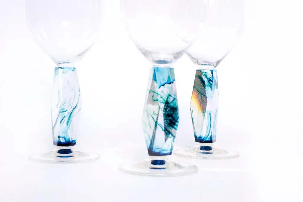The new design of Orfeo Quagliata, a set of four wine glasses made by hand with the highest quality crystal.Each facet of the handle is made one by one to later be polished in our workshop.Touches of color that remain suspended in time with the elegance and modernity that characterizes the Studio.