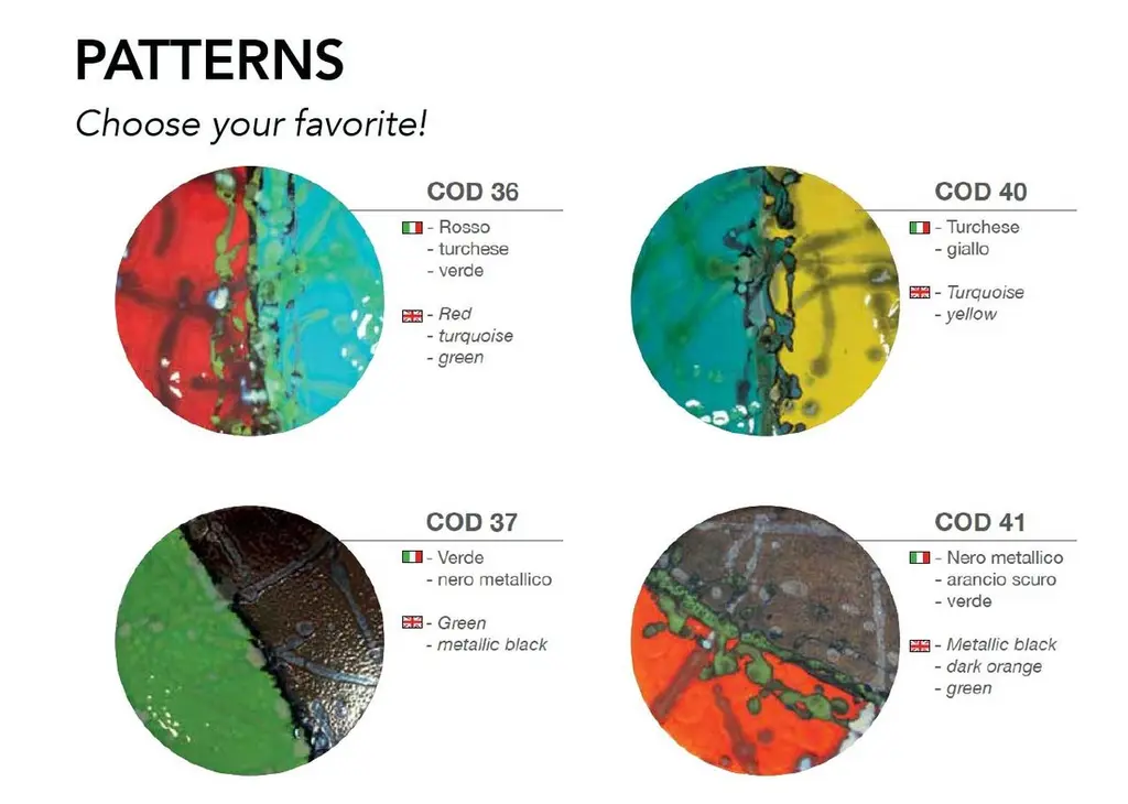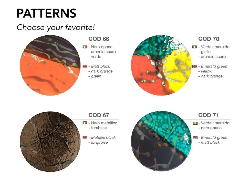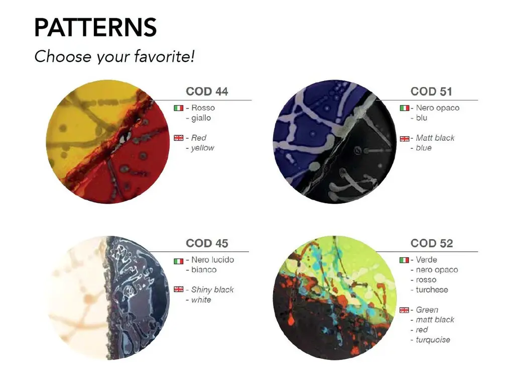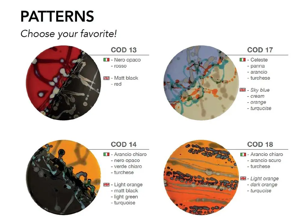 For more than 30 years this artist has revolutionized the way of thinking about stone. Their artisan techniques are the result of careful research and deep knowledge of the subject: they involve the meticulous artistic work of those who know how to see beyond, transforming the unexpected into a formula of uniqueness. The eclectic and resistant combinations in lava and volcanic stone are the effect of processes that change the shape of the material through the idea, fixed and tempered in an oven that forges its identity. The incredible characteristics of volcanic stone and lava rock make them perfect materials for projects with high customization capacity: beautiful even in its natural form, the stone is coated with different glazes and hand-painted decorations for unique pieces of every color, size and shape. With its extraordinary resistance, the table tops can live both indoors and outdoors.Volcanic stone (mined underground) is used for the Classic tops (SUN), while Lava Rock (above ground) is used for the Design tops (COD). Lava rock is denser and harder than volcanic stone and it also bakes dark charcoal and does not require a white glaze base coat prior to adding the ceramic glaze. This allows the artist much greater flexibility and freedom as the organic color of the rock does not influence the designs.The term Majolica lava stone commonly indicates a lava basalt object that has a majolica surface decoration. In reality, since ceramics rather means a large grouping of terracotta artifacts, this decorative technique in the specialist field is more correctly referred to as Majolica lava stone or Majolica on lava stone. Thanks to the particular aesthetic potential due to ceramics, combined with the remarkable mechanical and physical resistance of basalt, ceramic-coated lava stone is used for the production of tables, tops for kitchens and bathrooms, floors, mosaics, shower trays, sinks and coverings.The process of working stone and volcanic lava is divided into several phases, all carried out by hand in the studio: cutting, glazing, hand decoration, vitrification and double firing at over 1000 degrees. All this makes the material suitable for any indoor and outdoor environment, as it does not undergo any variation if exposed to snow, rain, sunlight or salt. Furthermore, it has excellent characteristics of impact resistance, does not absorb any type of substance, does not stain, does not alter in contact with heat sources such as embers, hot pots or acid solutions and has a degree of resistance to scratching higher than marble.The artist's workmanship is an expression of the great technical and custom ability of its craftsmen, who elaborate complex shapes and combinations to create objects with a strong, fluid and harmonious identity like the hand of nature. The ability to investigate the stone and its facets allows you to work objects whose appearance you can only imagine: present and future alternate in the eyes of the craftsman, until the moment of firing, which consecrates the piece in its indestructible final form.