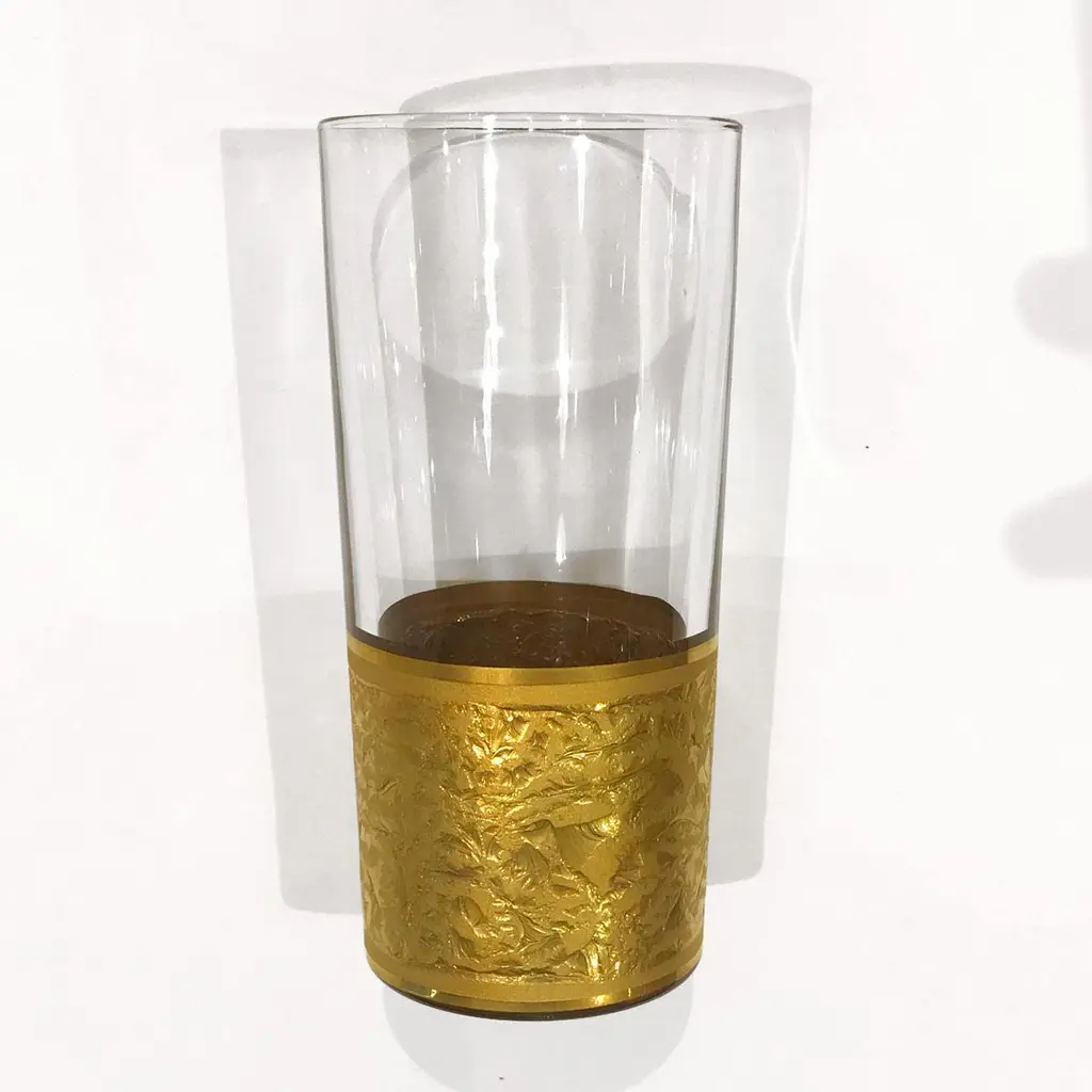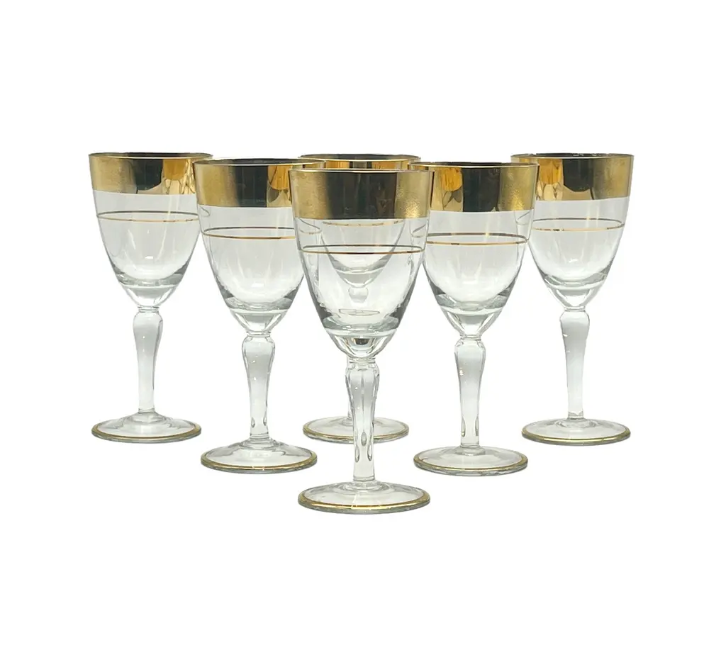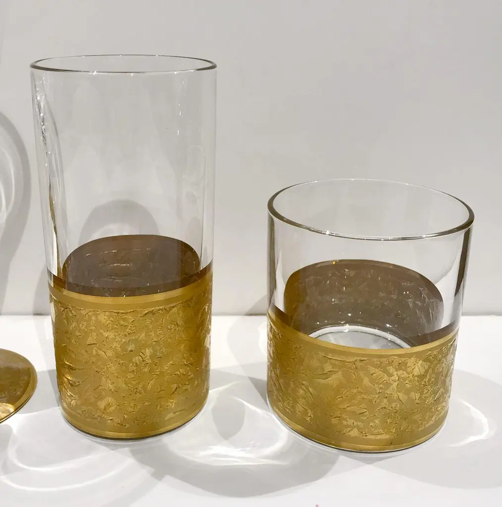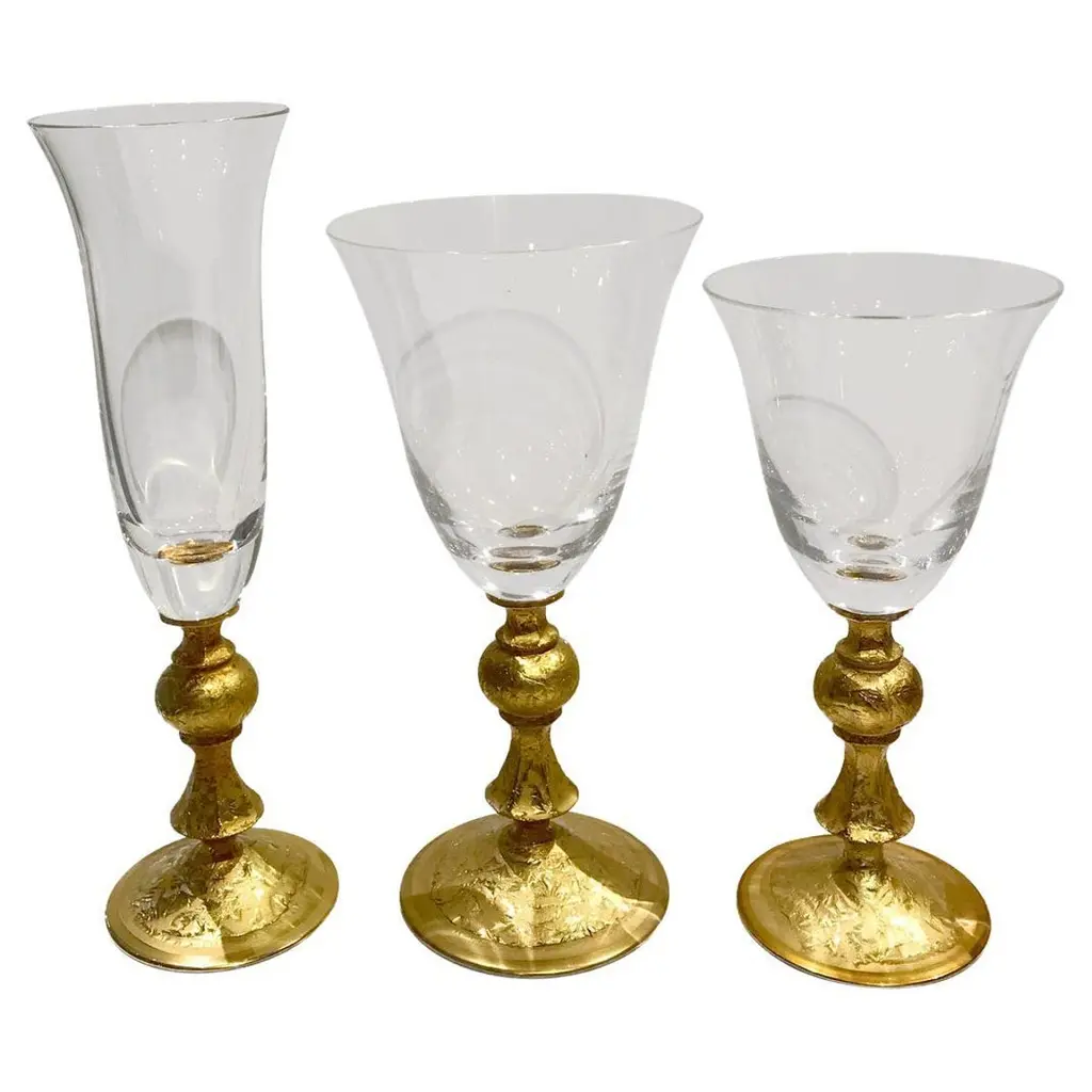 Exquisite set of 20 glasses composed of 5 types of glasses made from solid glass and with a large golden rim with wonderful engraved abstract adornments. This set reflects the timeless excellence of Italian craftsmanship and will enrich the look of any table.Each set is composed of : - 4 champagne flutes Height 24 cm diameter. 7 cm- 4 water glasses Height 21 cm diameter. 10,5 cm- 4 wine glasses Height 19 cm diameter. 8. cm- 4 tumblers Height 15 cm diameter. 7 cm- 4 whisky glasses Height 9,5 cm diameter. 8 cm.