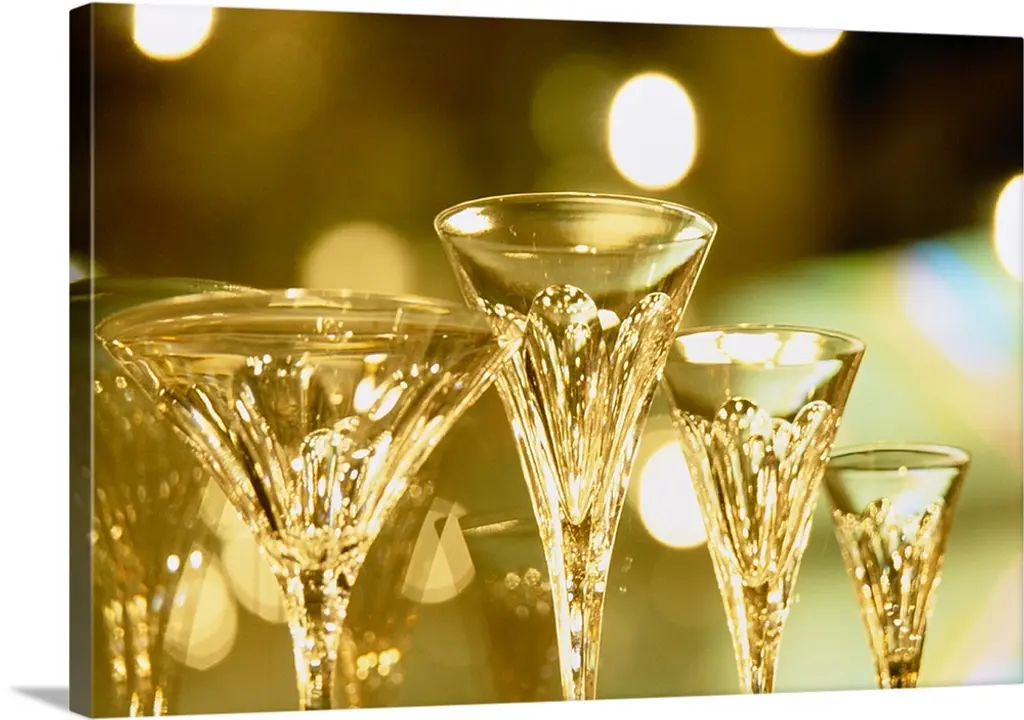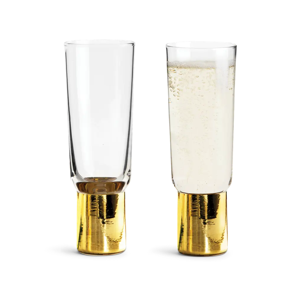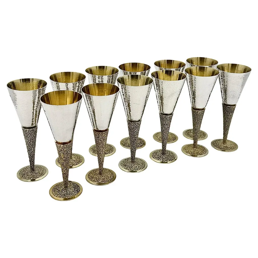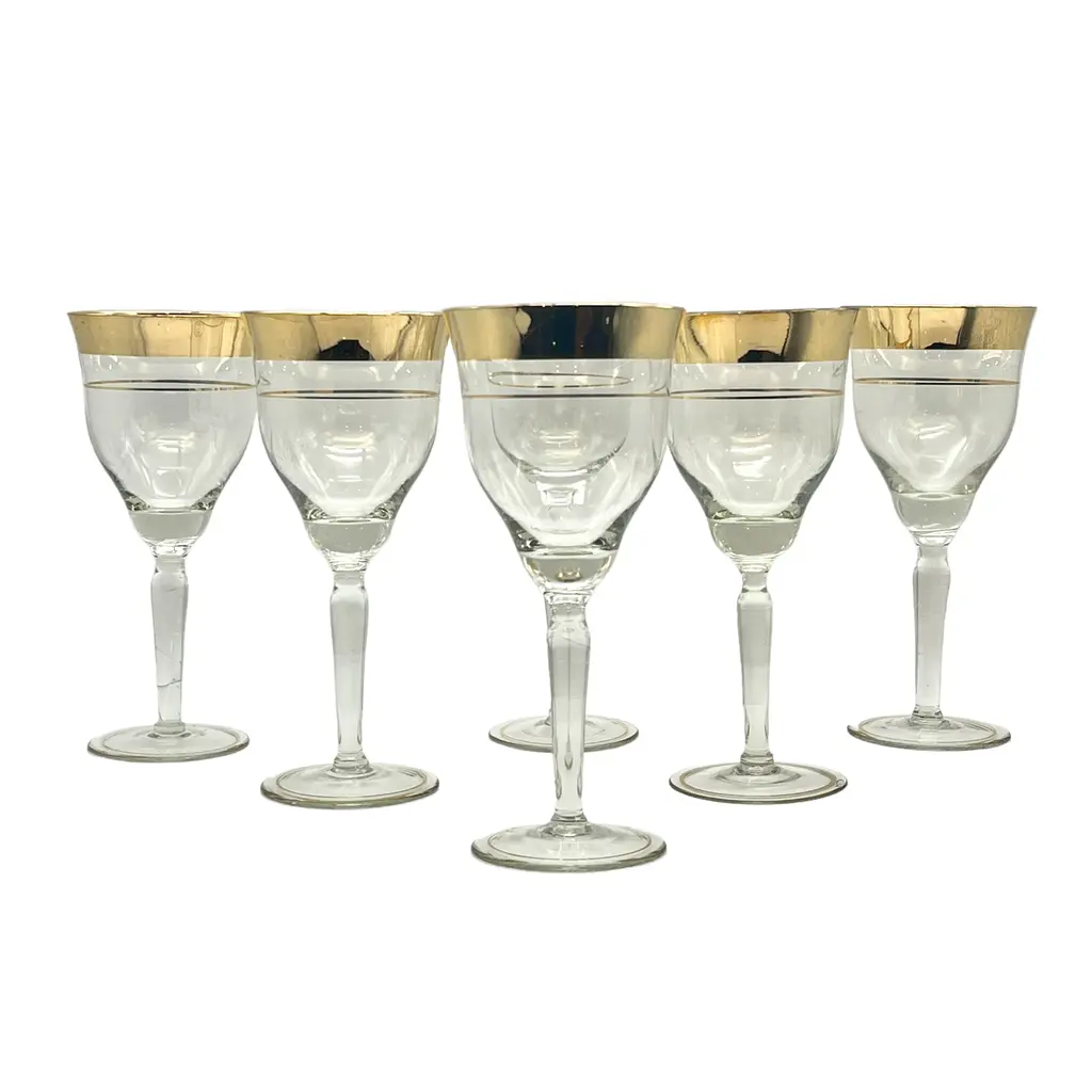 Exquisite set of 20 glasses composed of 5 types of glasses made from solid glass and with a large golden rim with wonderful engraved abstract adornments. This set reflects the timeless excellence of Italian craftsmanship and will enrich the look of any table.Each set is composed of : - 4 champagne flutes Height 24 cm diameter. 7 cm- 4 water glasses Height 21 cm diameter. 10,5 cm- 4 wine glasses Height 19 cm diameter. 8. cm- 4 tumblers Height 15 cm diameter. 7 cm- 4 whisky glasses Height 9,5 cm diameter. 8 cm.