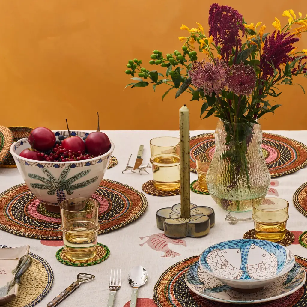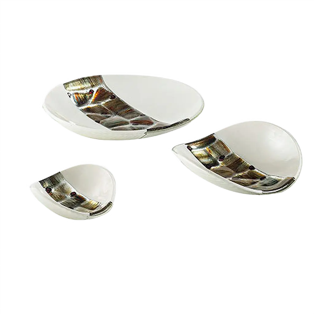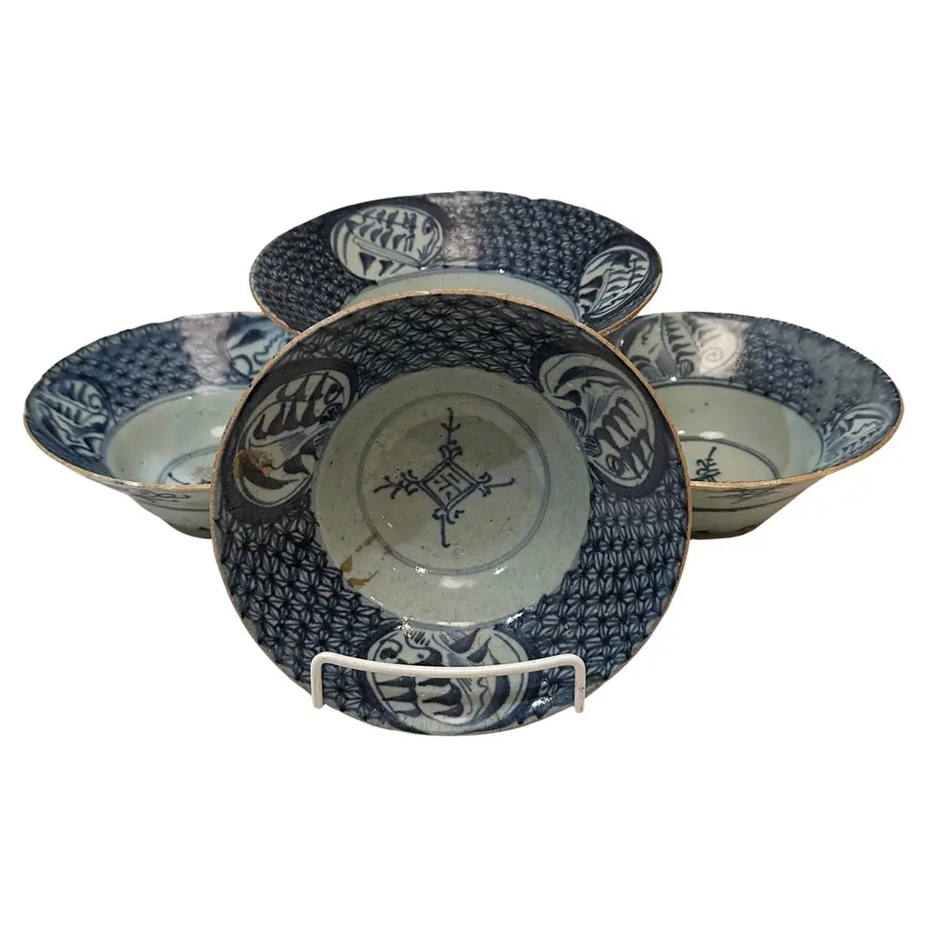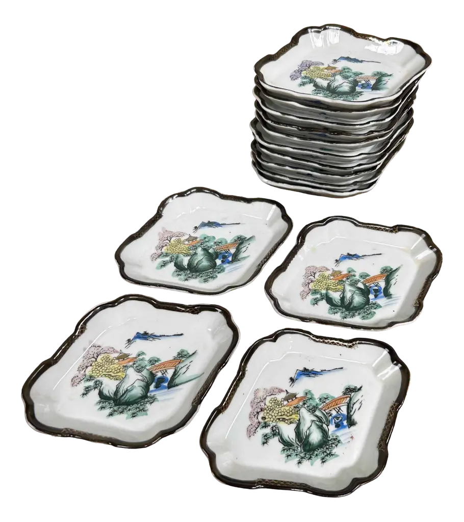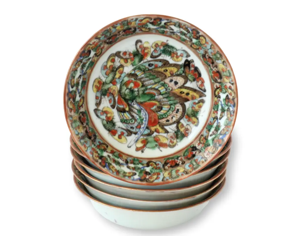 Set of 5 vintage ceramic or porcelain knife or chopstick rests features celadon colored glaze with traditional motifs of flying cranes and clouds, the "Thousand Cranes" design that is common to Korean Goryeo ware. The elongated, sculptural shapes of the pieces showcase the decor with two cranes flying towards each other; light craquelure effect on the glaze adds depth and visual interest to the composition.The knife or chopstick rests come in sets on 5, that is common in Asian tableware sets; we are offering 2 sets of 5 rests at the time of the listing.