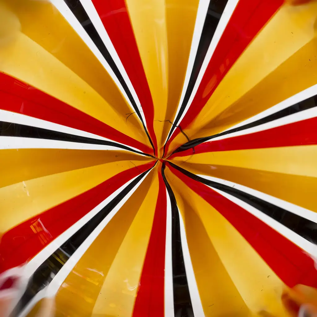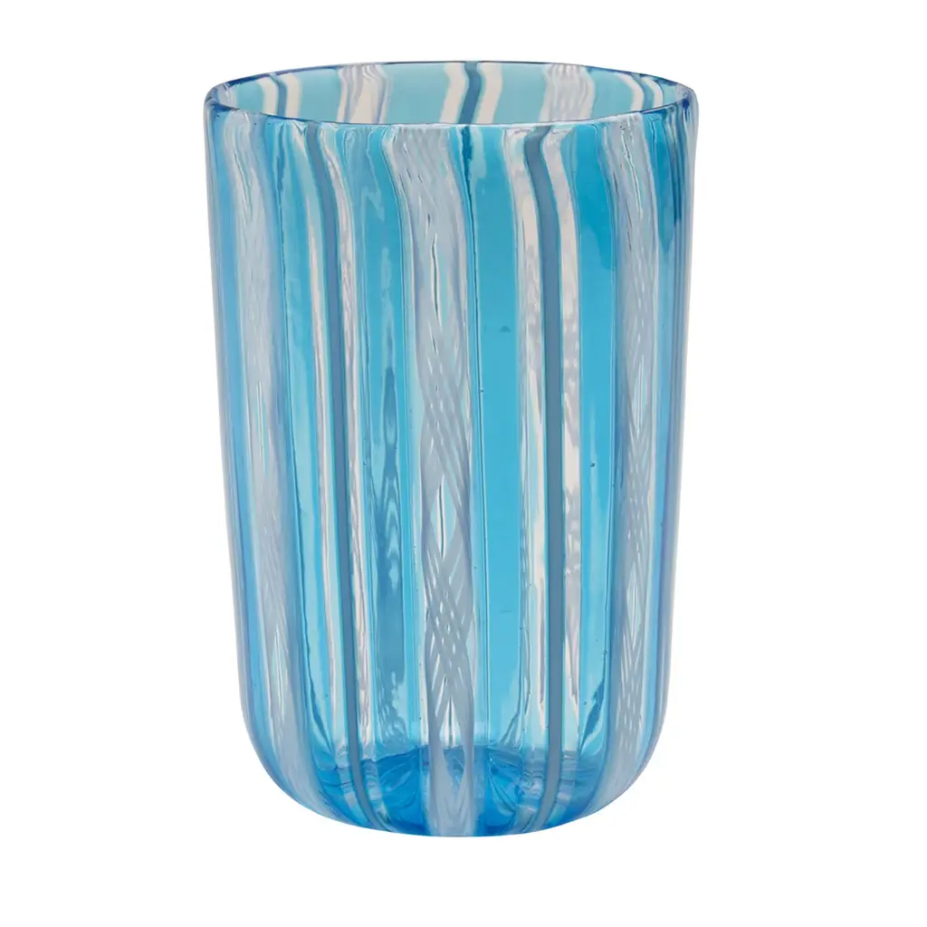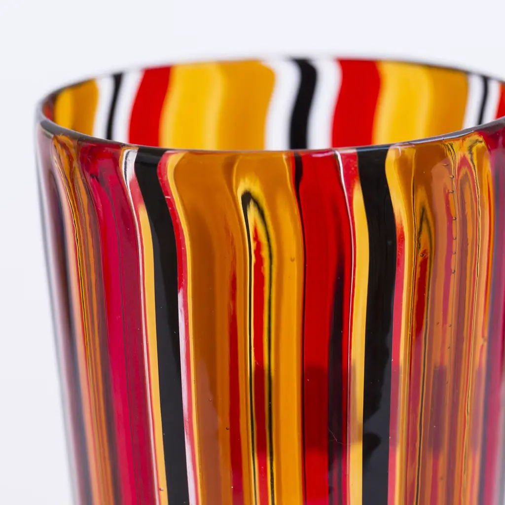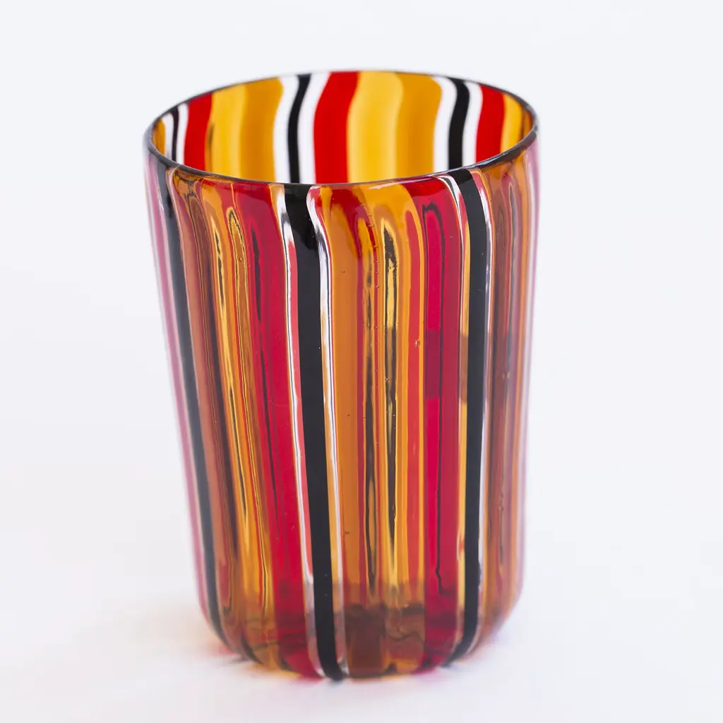 Set of 6 Murano glasses made with the "a Canna" technique, where canes of colored glass are melted into a clear glass base. This beautiful amber, black and red set includes 6 glasses entirely handcrafted on the Venetian island of Murano by the master glass blowers of La Fornasotta.