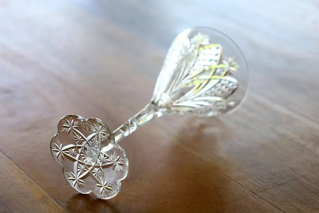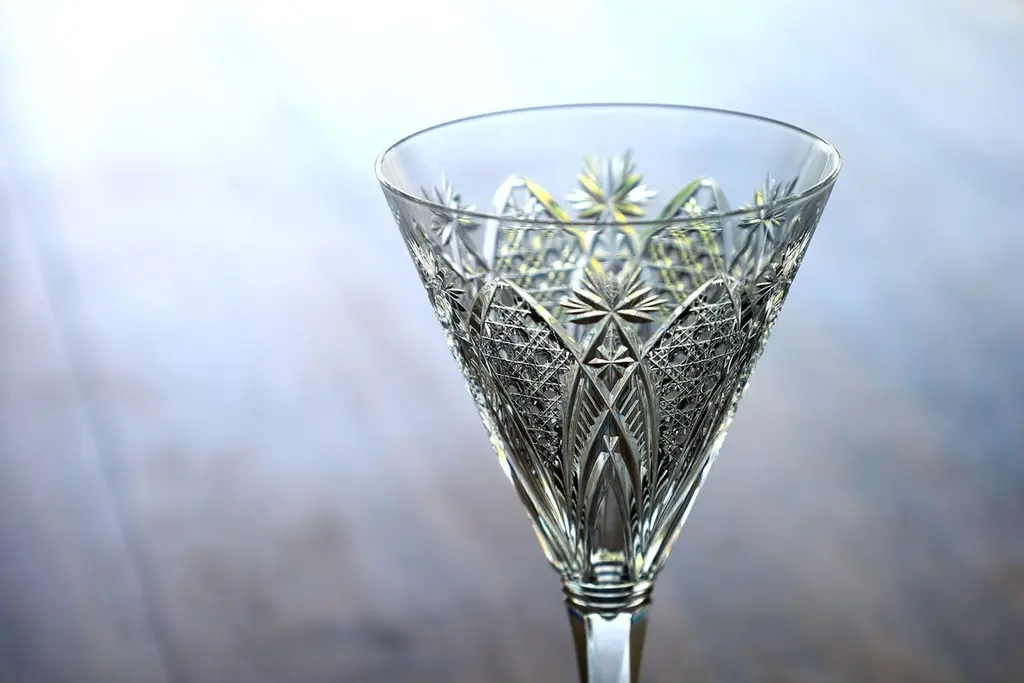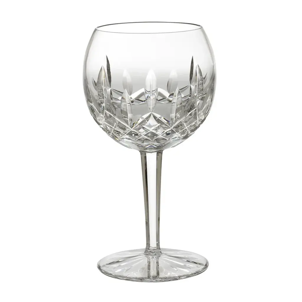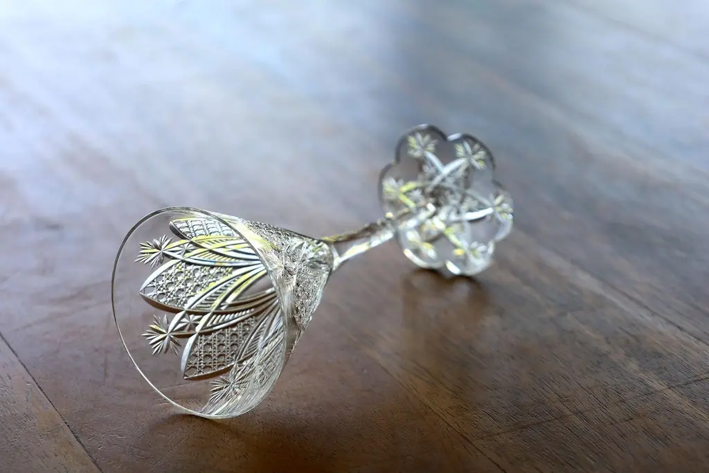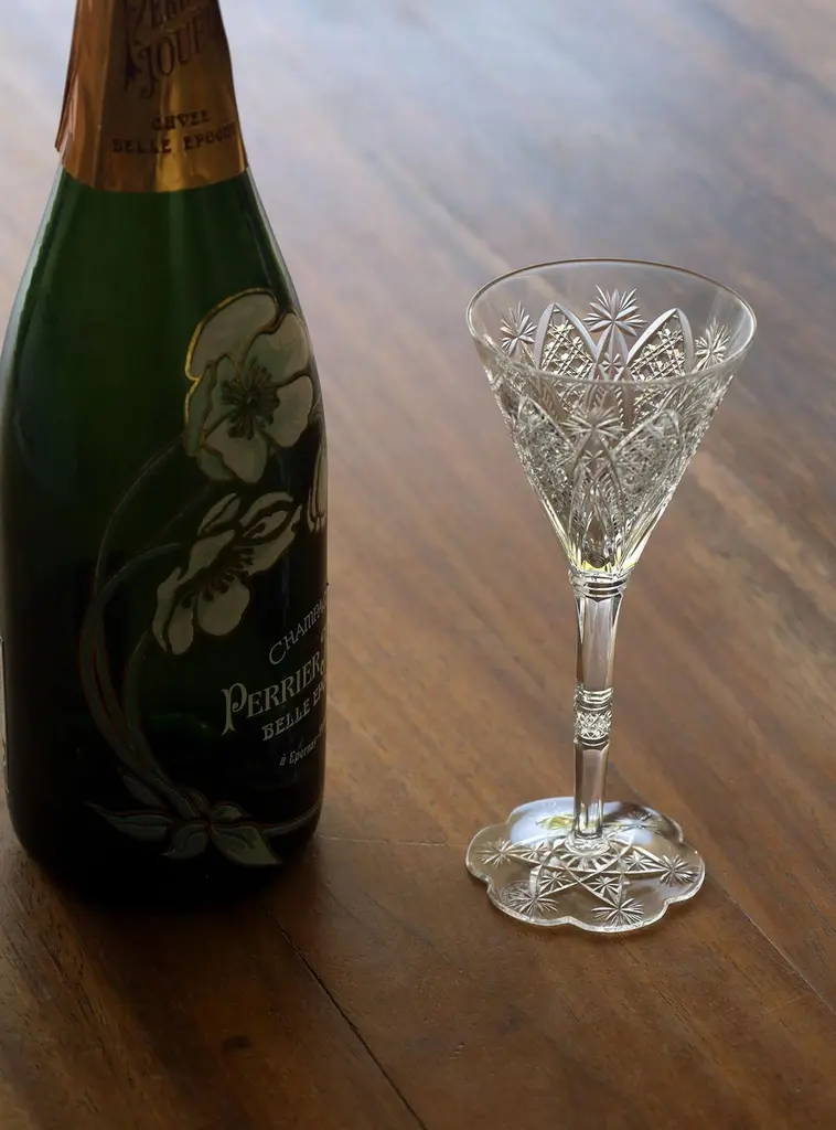 Baccarat Elbeuf service was first introduced in 1908 and presented at the International Exhibition in Nancy, France in 1909. Specially ordered in 1920 by the Maharaja of Baroda. This set of 6 signed Baccarat glasses are hand blown clear crystal and cut with elegant lines, brilliantly refracting light like a rainbow and they ring like a bell. The exquisite cutting on the bowls suggest diamonds, jewels and palmettes that evoke a flower when seen from above in keeping with the Art Nouveau style of the time.