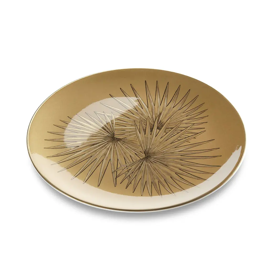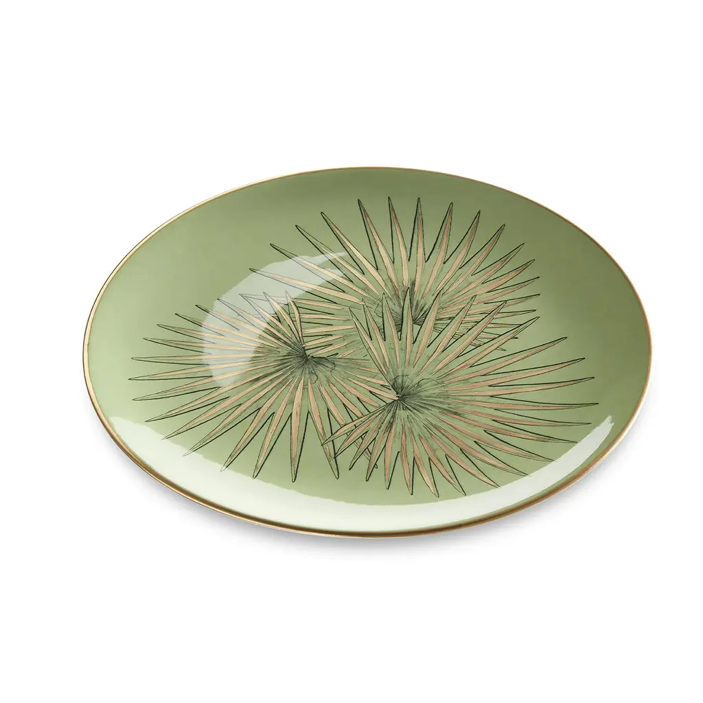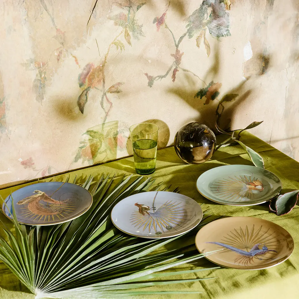 These magnificent Birds of Paradise are an explosion of charm that radiates from the center of the plate and is enhanced by the bold geometry of a palm leaf. Six distinct subjects are presented on a white or colored background with a sophisticated contrasting palette. The version with hand-painted gold details captures and releases light, creating a gleaming dance. It takes an instant to fall in love with them; a single choice is nearly impossible.