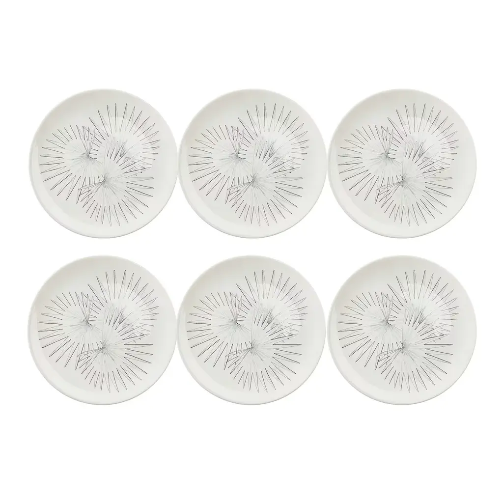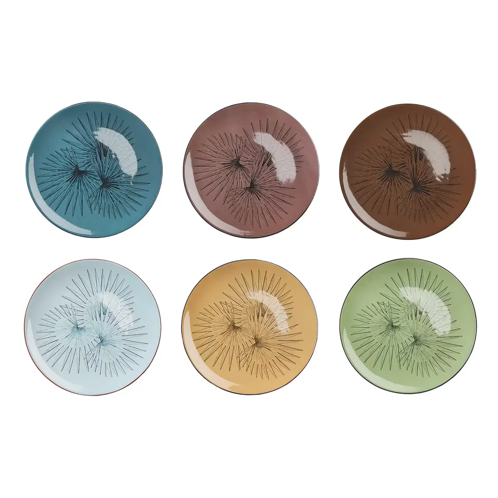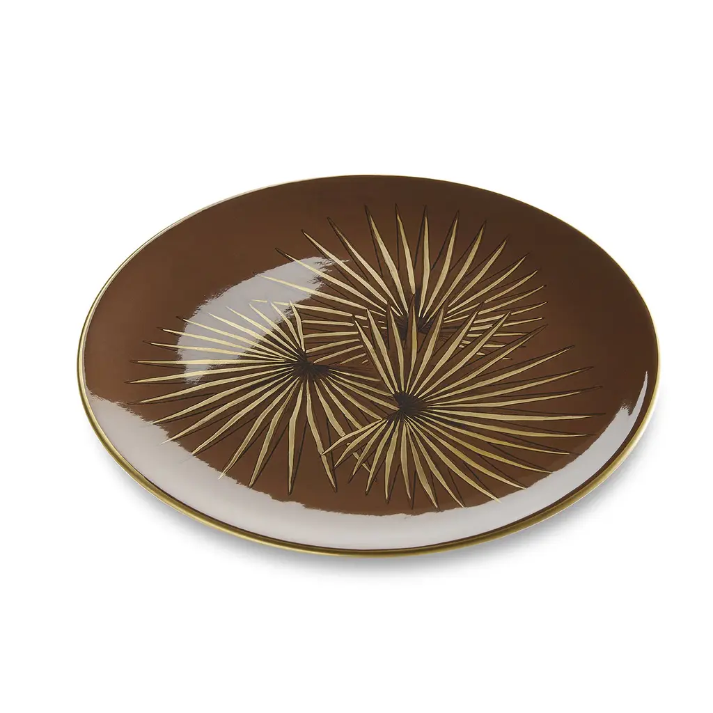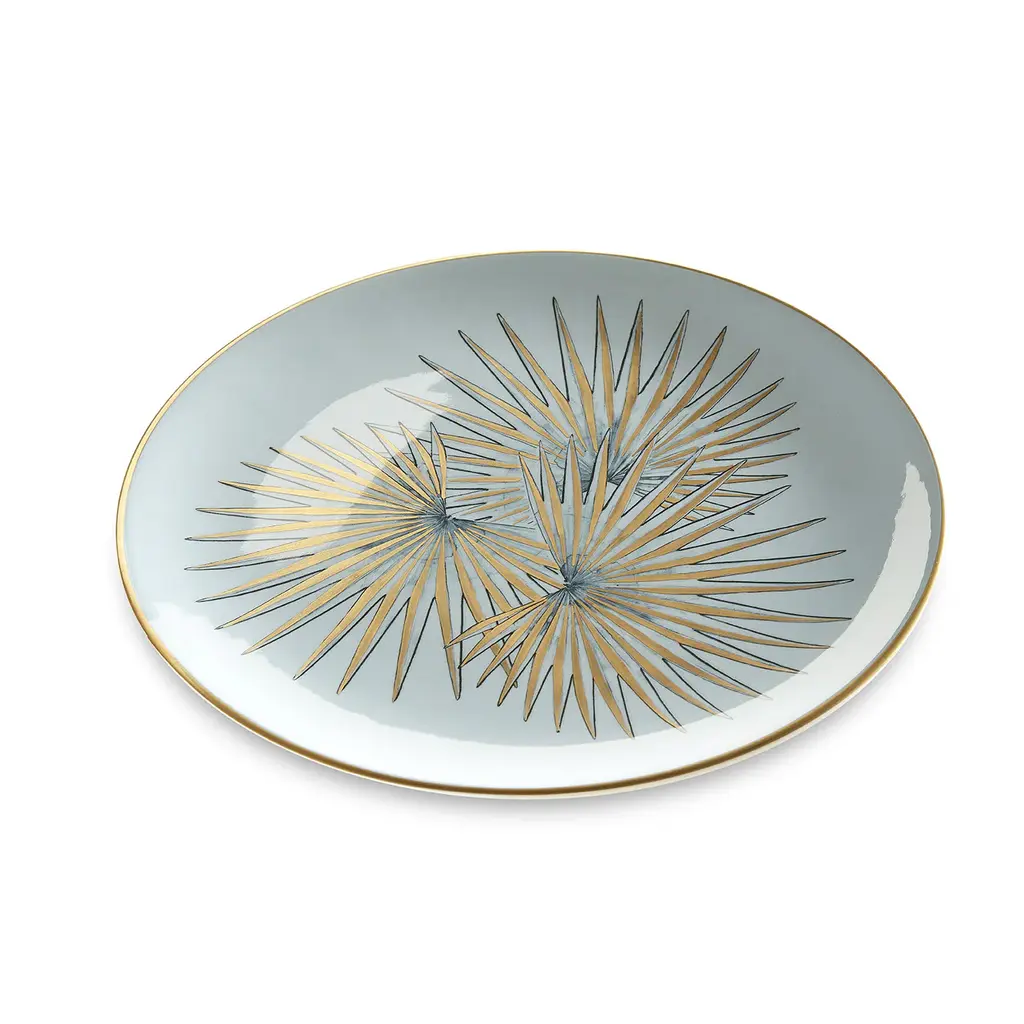 These magnificent Birds of Paradise are an explosion of charm that radiates from the center of the plate and is enhanced by the bold geometry of a palm leaf. Six distinct subjects are presented on a white or colored background with a sophisticated contrasting palette. The version with hand-painted gold details captures and releases light, creating a gleaming dance. It takes an instant to fall in love with them; a single choice is nearly impossible.