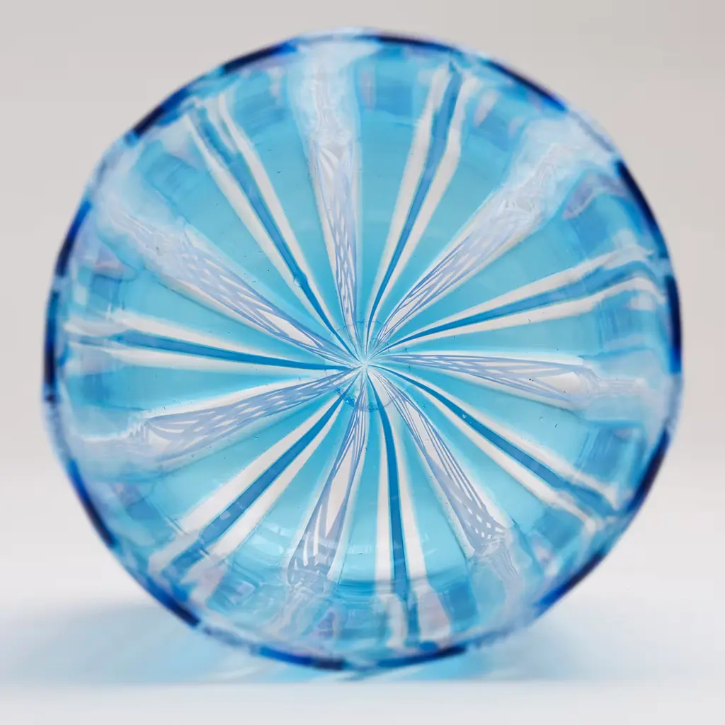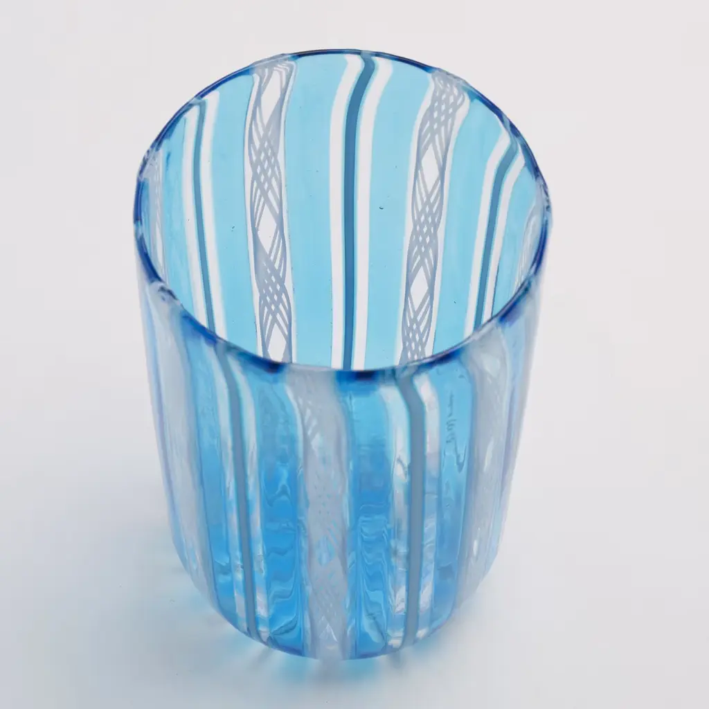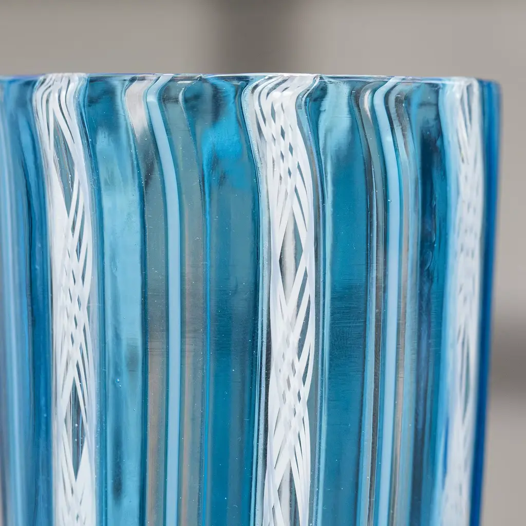 Set of 6 filigree Murano glasses made with the "a Canna" technique, where canes of colored glass are melted into a clear glass base. This beautiful blue set includes 6 glasses entirely handcrafted on the Venetian island of Murano by the master glass blowers of La Fornasotta. The filigree glasses are usually considered the most precious among all Murano glasses.
