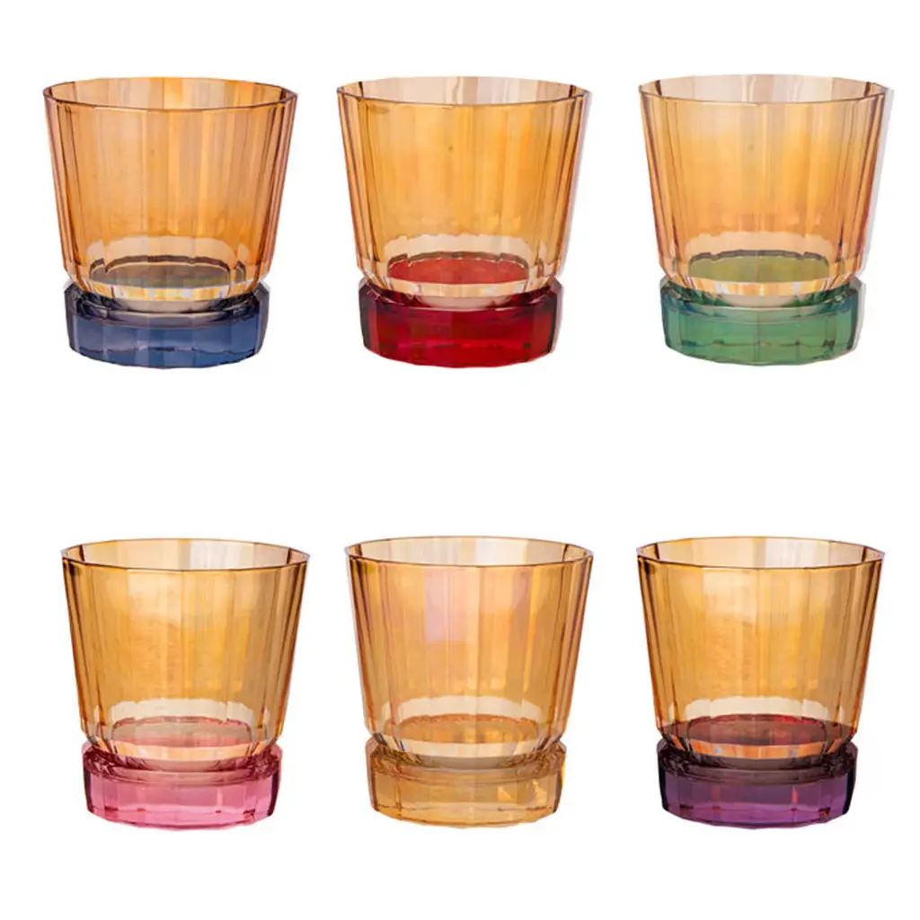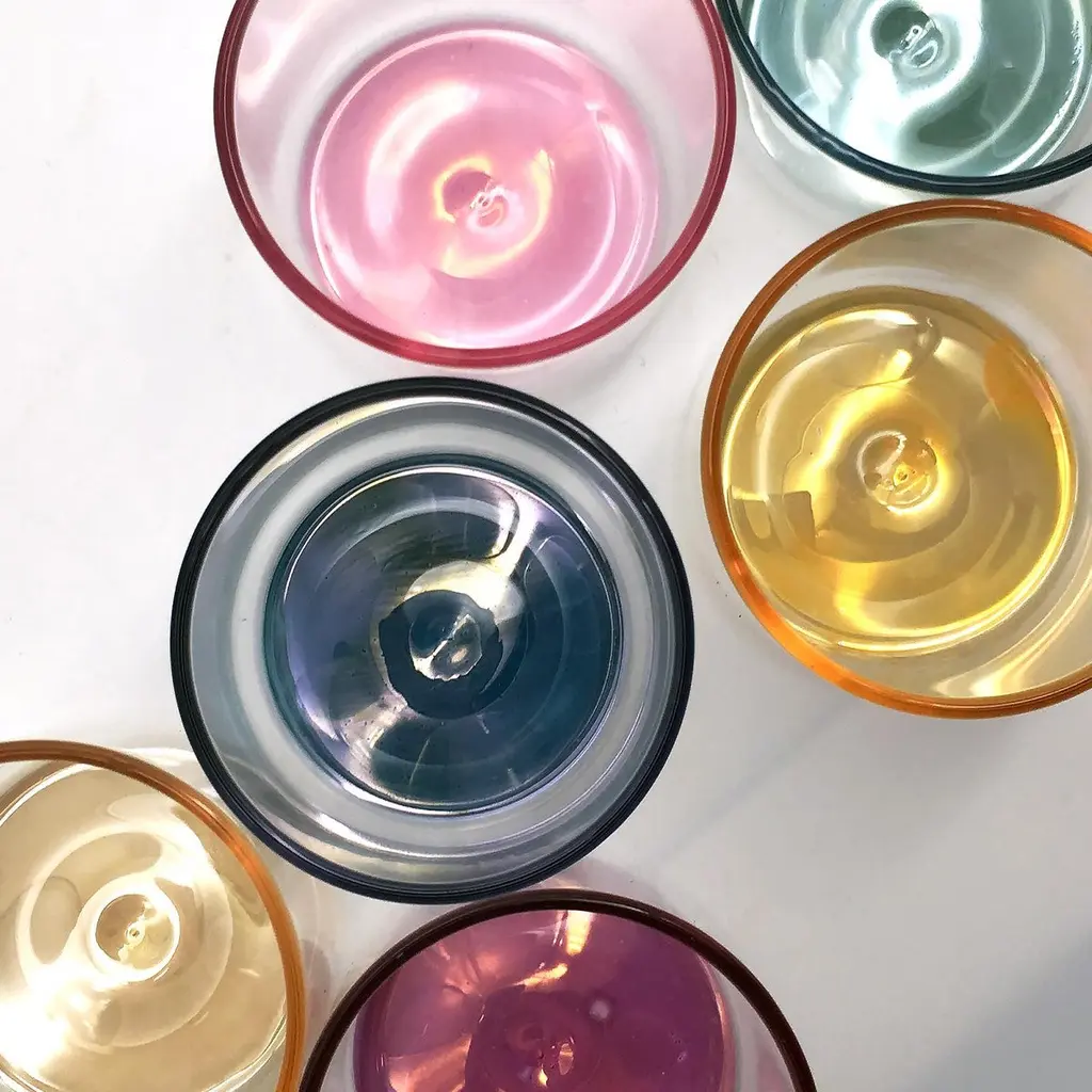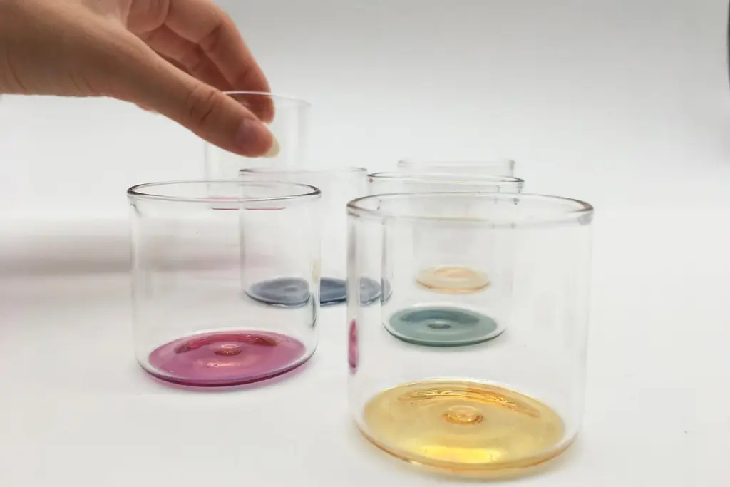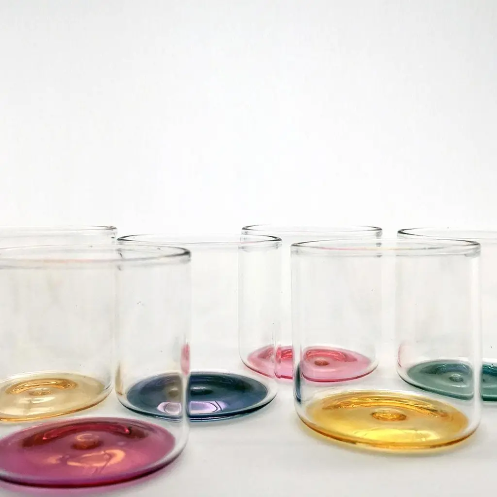 Set of 6 shot glass.Dimensions of each glass : Ø4,4 x H4,3 cmThe “Iride” glass exploit the phenomenon of light refraction and play with the bottom color, transporting it to the surface. Iride is made for the water, perfect liquid for the experiment, which loses its transparent essence and assumes the 6 colors you want, transforming the table into a palette.