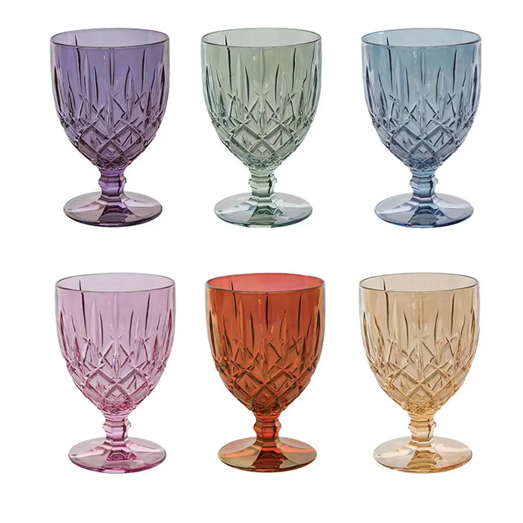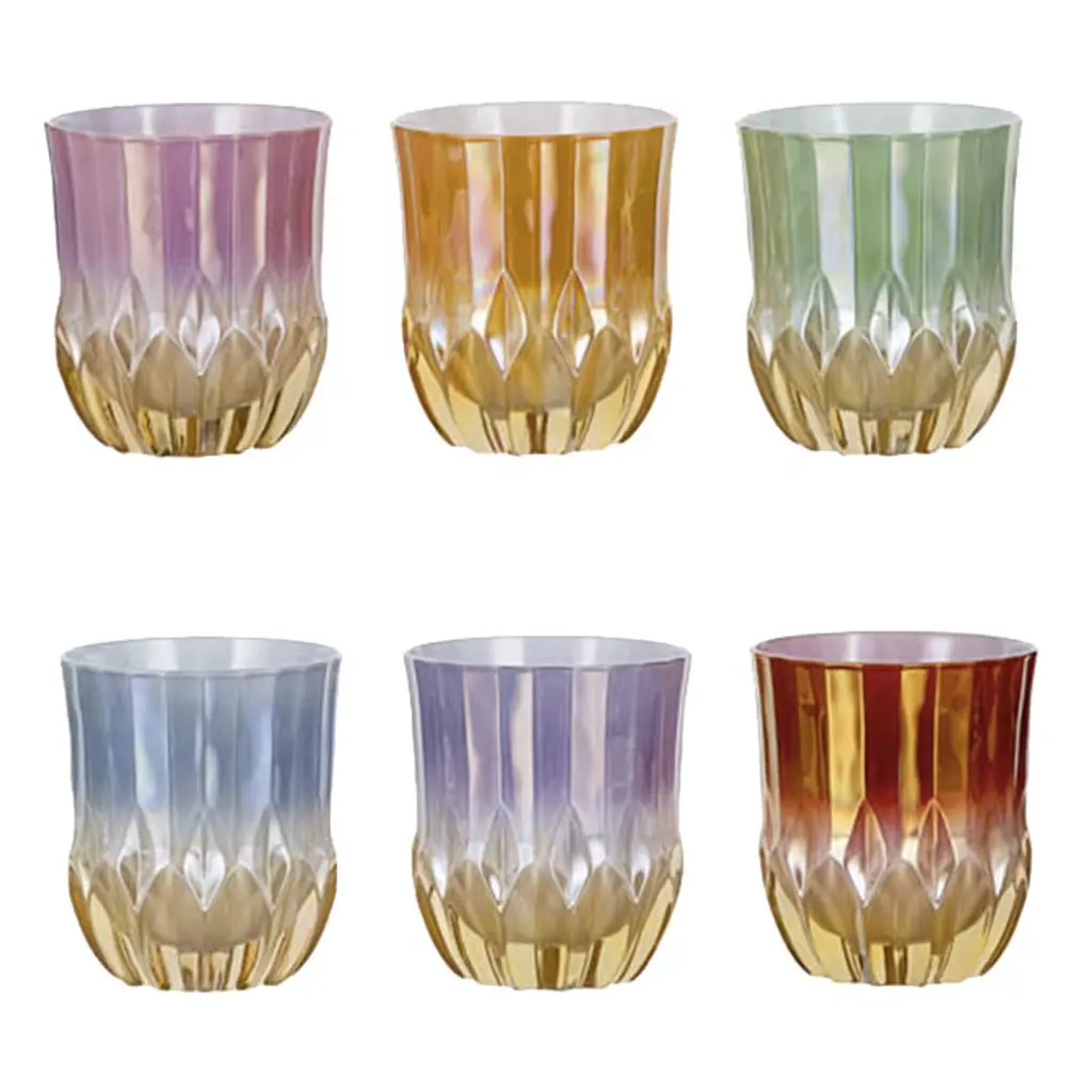 Precious and colorful, this set is comprised of six short glasses made of mouth-blown glass that can be used to serve after dinner drinks such as amaro or other liqueurs. Each glass has an amber-colored base, highlighted by the unique grooved texture of the bottom that stems vertically up to the mouth of the piece. The internal surface of each glass is coated in white, while the exterior features a different shimmering color for each piece. A special addition to any home or a great gift.