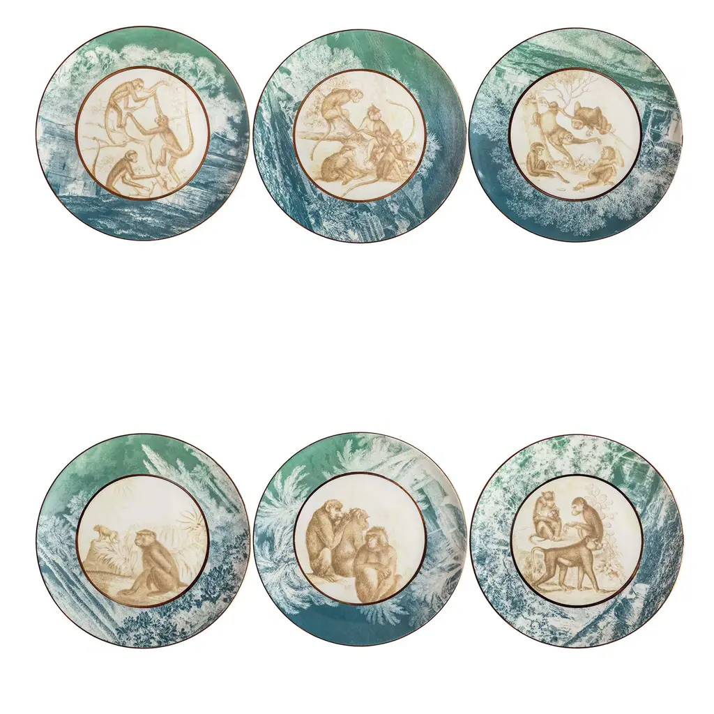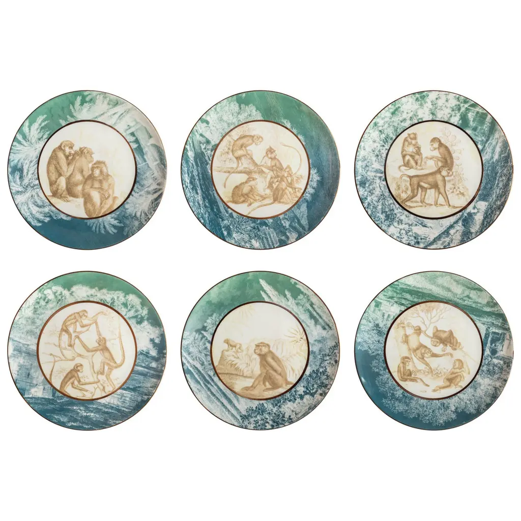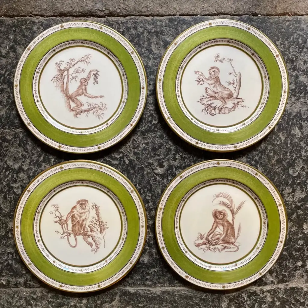 A remarkable set of twelve plates, each featuring a different monkey playing, climbing, or hiding amongst plants and fruit, make up this set. Together, they create a collection with a genuine dynamic composition. A fun theme enhanced by a wide green border and a precious decoration.