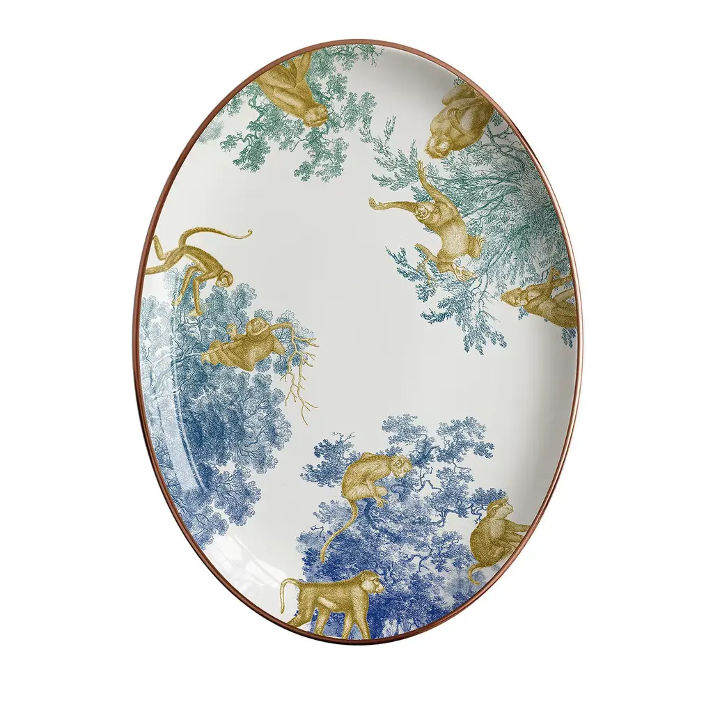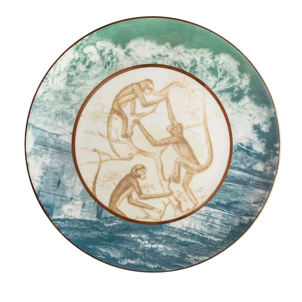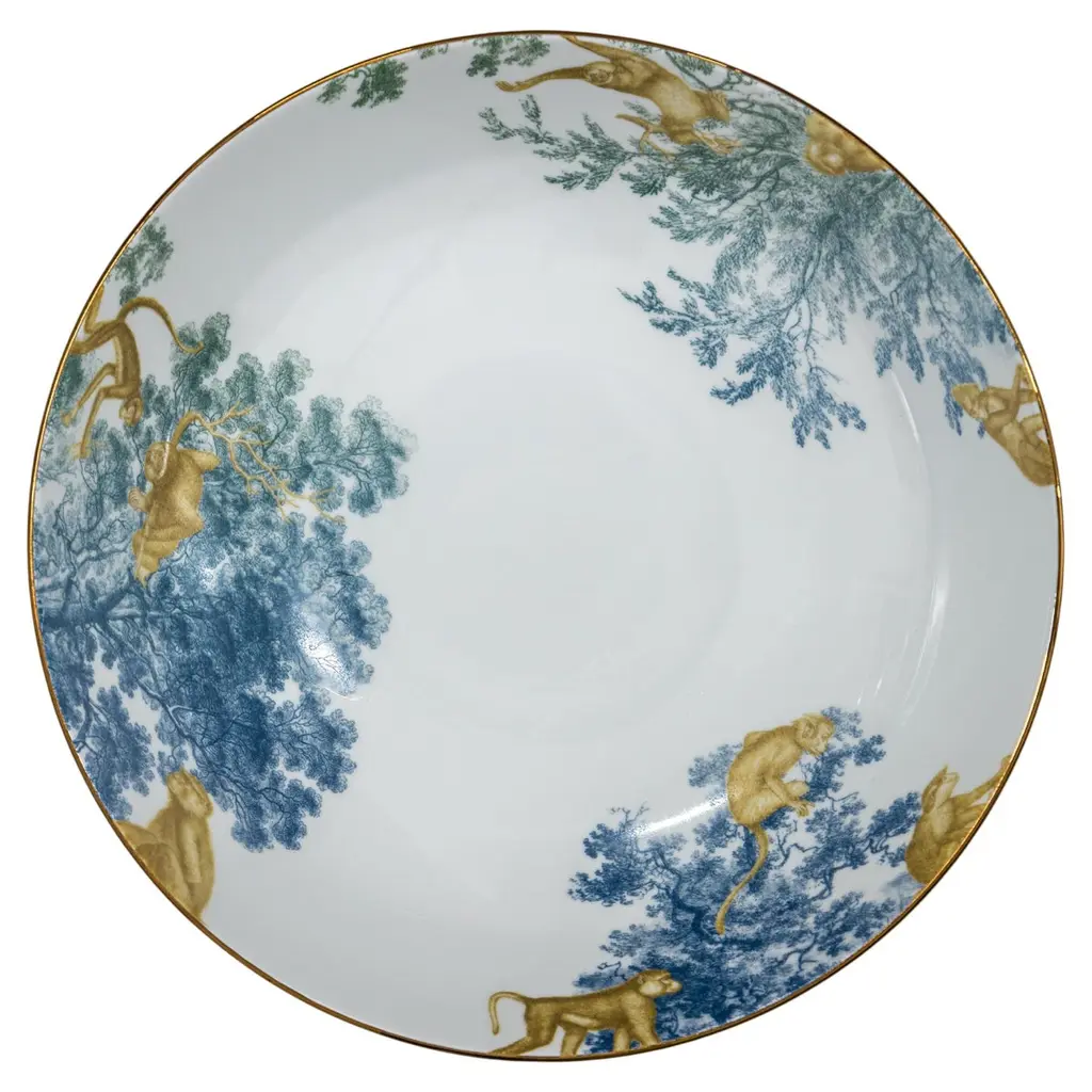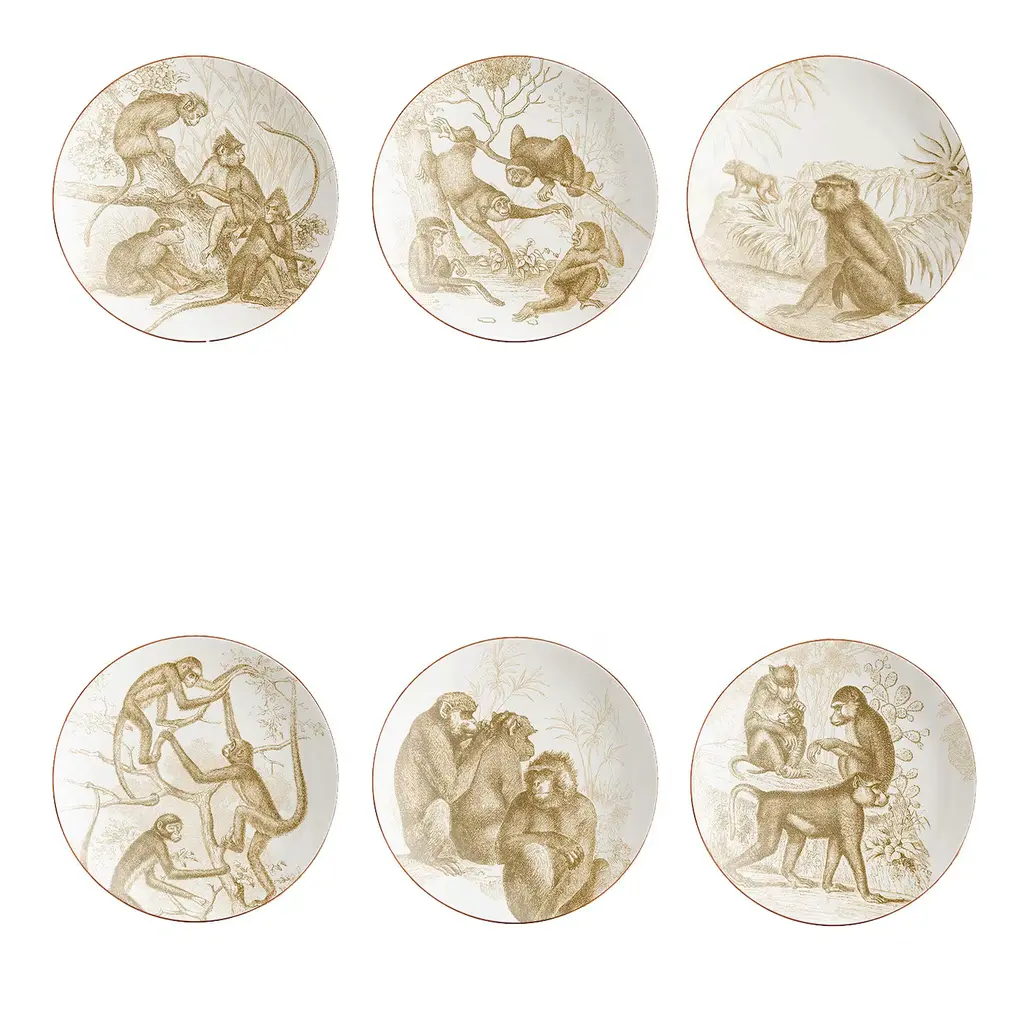 A remarkable set of twelve plates, each featuring a different monkey playing, climbing, or hiding amongst plants and fruit, make up this set. Together, they create a collection with a genuine dynamic composition. A fun theme enhanced by a wide green border and a precious decoration.