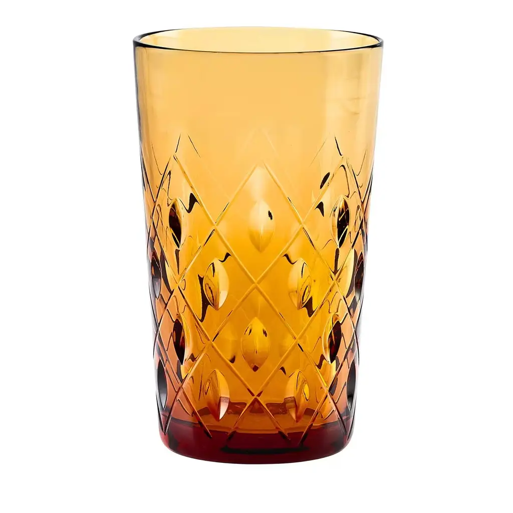 Warm and inviting, this set of six water glasses features a cozy amber tone and a subtle diagonal stripe. The glasses are made in Venice according to centuries of tradition, but proudly represent the lagoon's more contemporary styles. Thanks to their timeless appeal, the glasses suit any decor.
