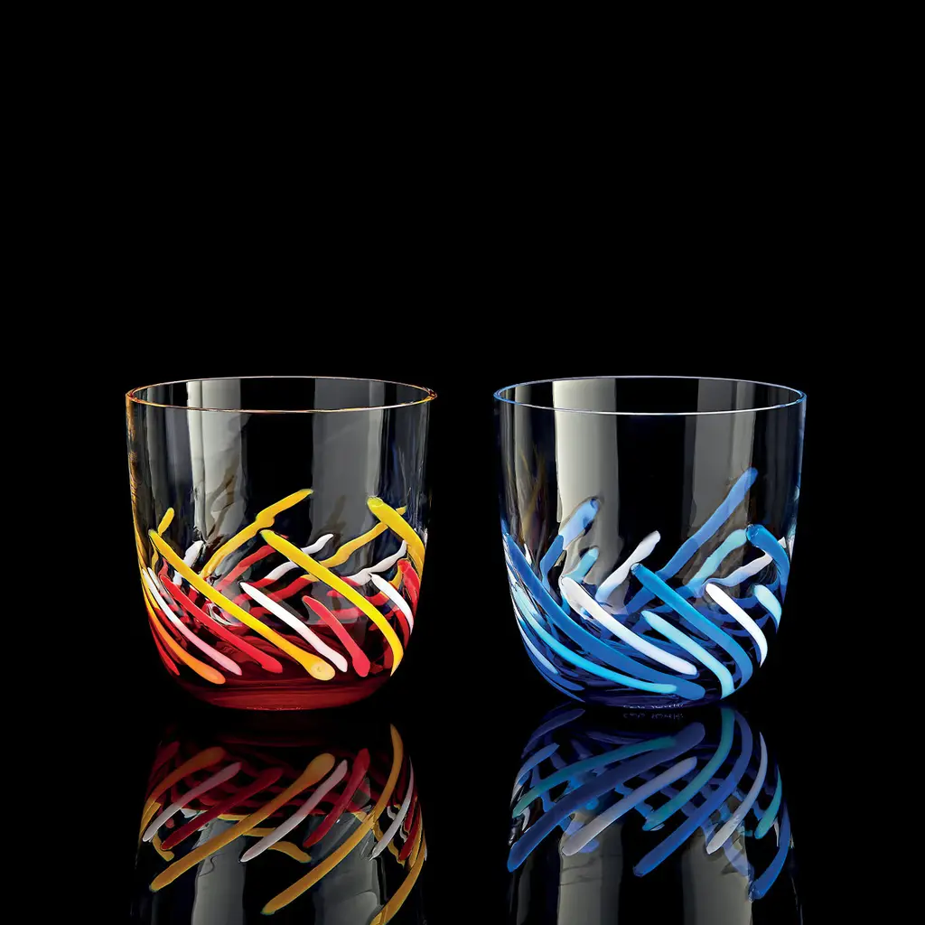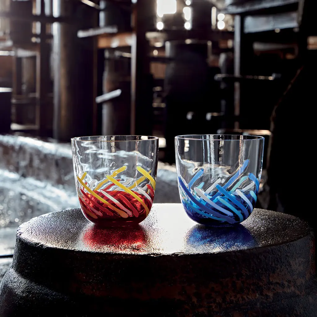 The I Diversi 2020 Set of 6 Glasses is unique and individual in each piece. Blown expertly by mouth and finished by hand, the decorative motifs are applied using heat. For additional exclusivity, the glasses are also signed and dated. Featuring an exquisite shape and pure lines, they are decorated spectacularly with bold painted blue, aqua and white strips.