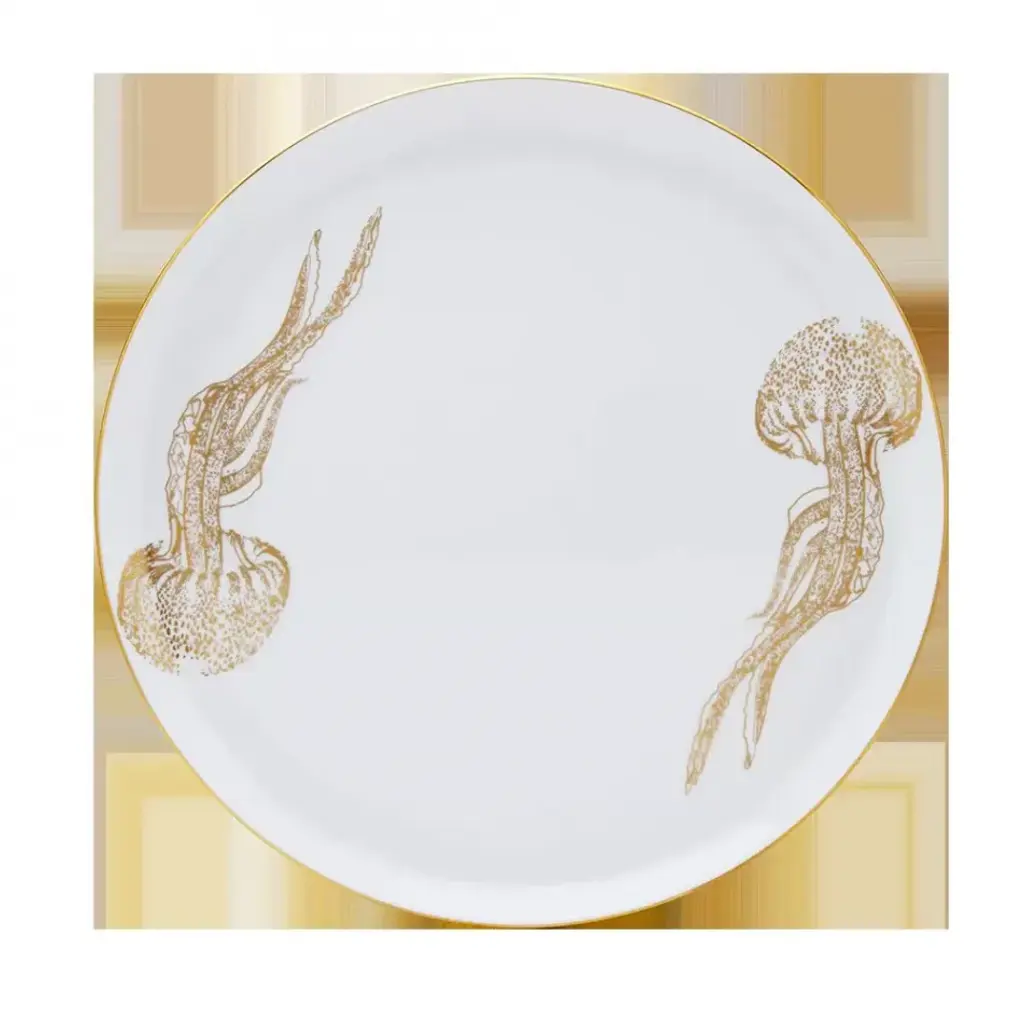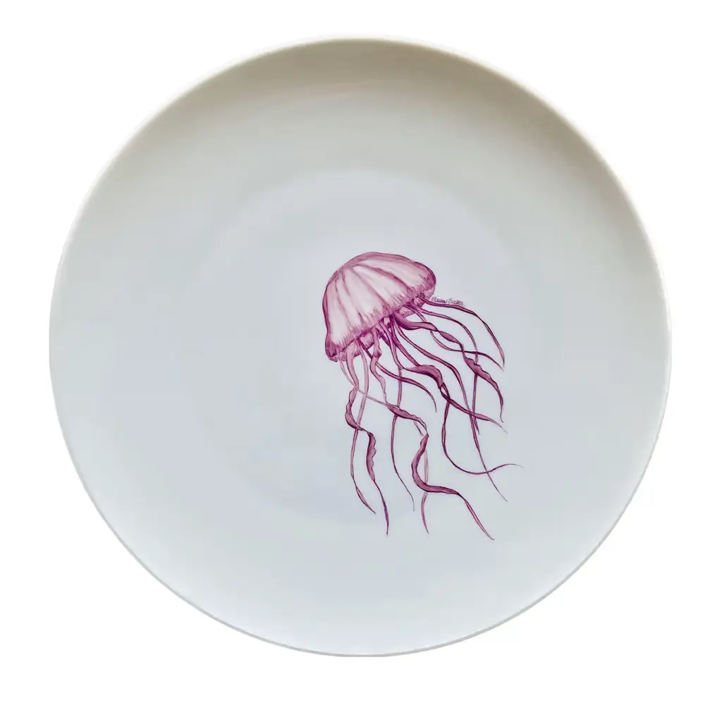 Boasting an ecclectic charm, this set of six ceramic plates is defined by a stupendous print of a giant jellyfish whose tenticles morph into the strings suspending an acrobat holding a starfish and two shells tied with a thin rope to her left hand. A stupendous set will surely add a sophisticated and unconventional character to a modern decor.