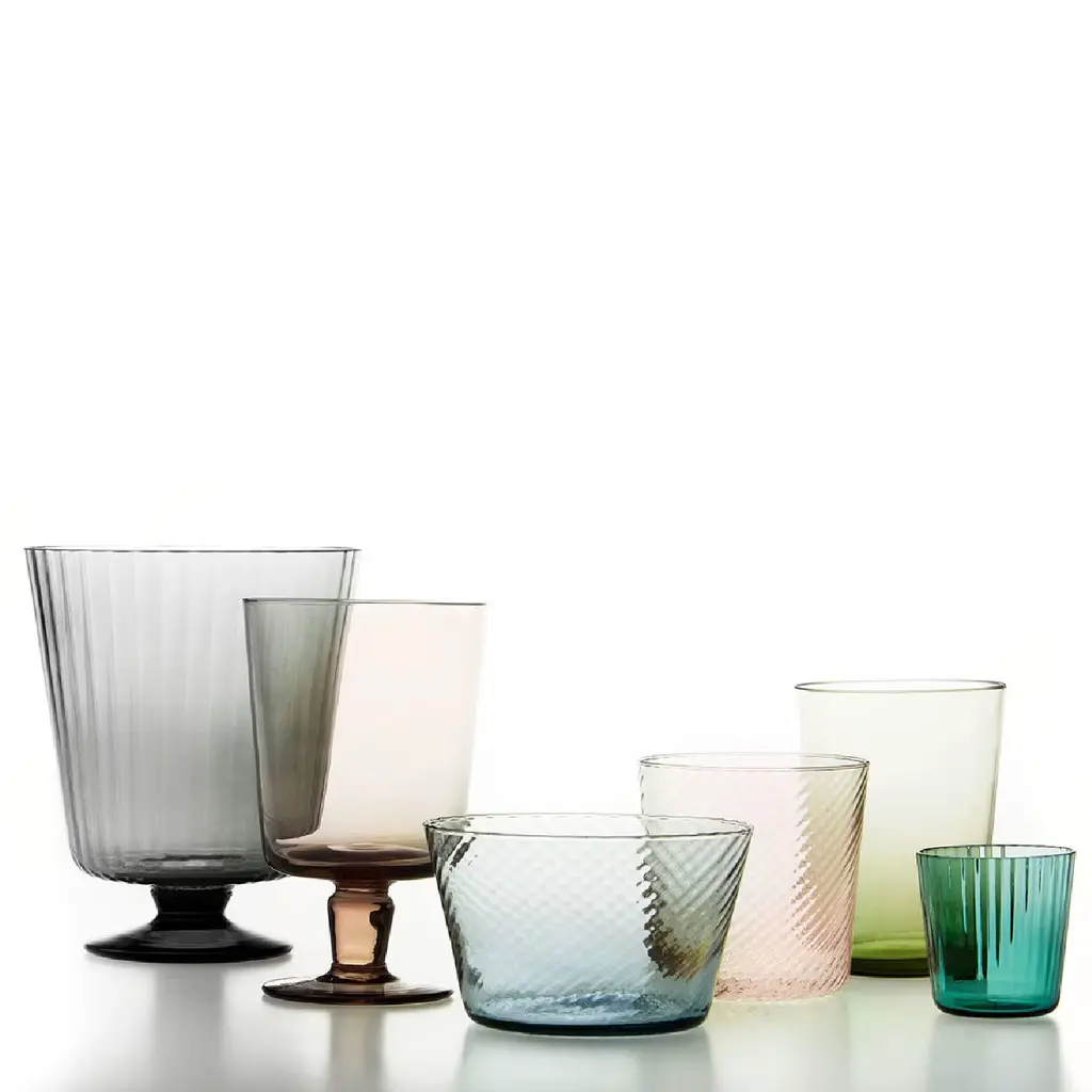 Part of the Plissè Collection, this set comprises six stem glasses, each entirely handmade of glass using crafting methods that belong to the centuries-old Venetian tradition. The pieces boast a charming pink hue that is more vivid on the round base and short stem and gradually fades into the side of the cup, which is adorned with an exquisite texture of "twisted" and parallel grooves, for a dynamic and elegant effect.