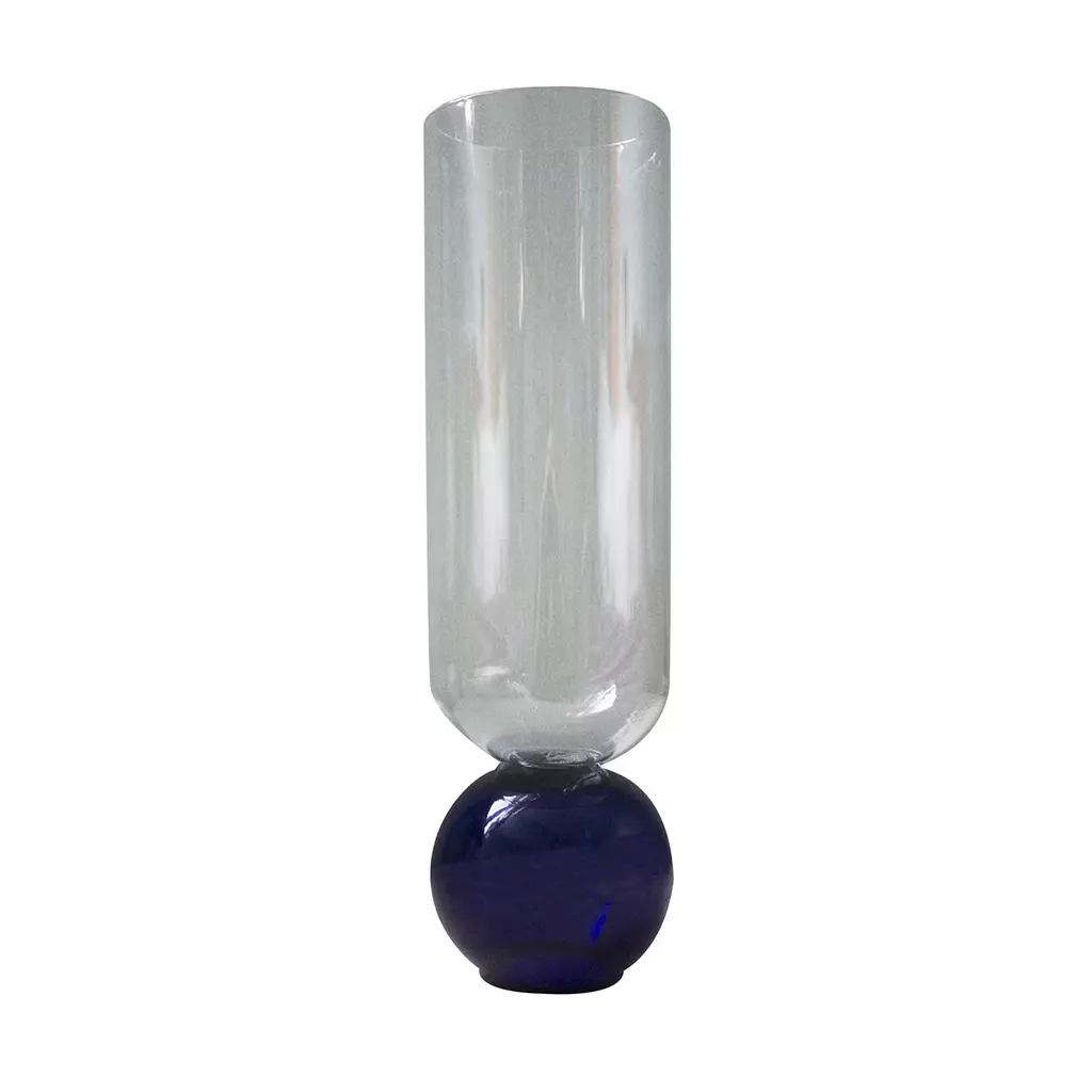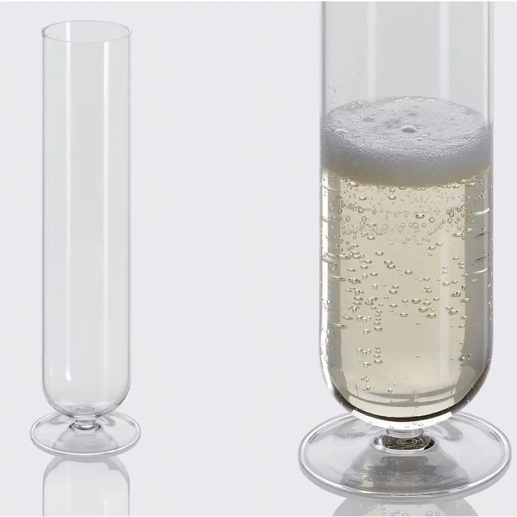 Inspired by alchemy tools and chemistry phials, this unique glass with its narrow body and elongated shape, was hand-made in borosilicate, highly resistant, glass. It can be used as a striking champagne glass, to enjoy the sight of each fine bubble coming to the surface after traveling in this unusual vessel, but whatever the drink of choice, this object will make a sophisticated impact on any table.
