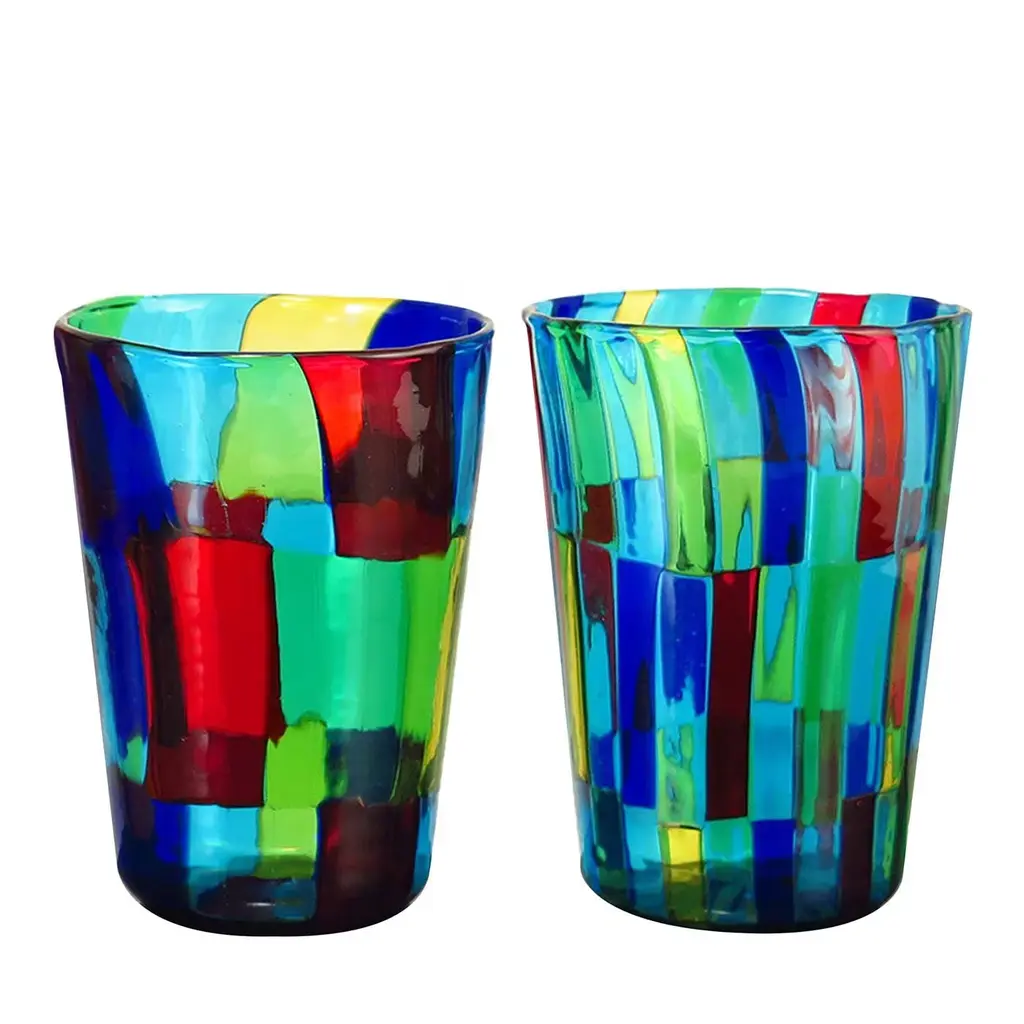This beautiful set of glasses has the characteristic of being realized with pastel colors (red, yellow and orange) and transparent colors such as aquamarine and yellow, which together create a perfect balance giving lightness to the composition. Each piece is entirely handcrafted by Angelo Ballarin with Murano glass, so there might be little differences in the dimensions.