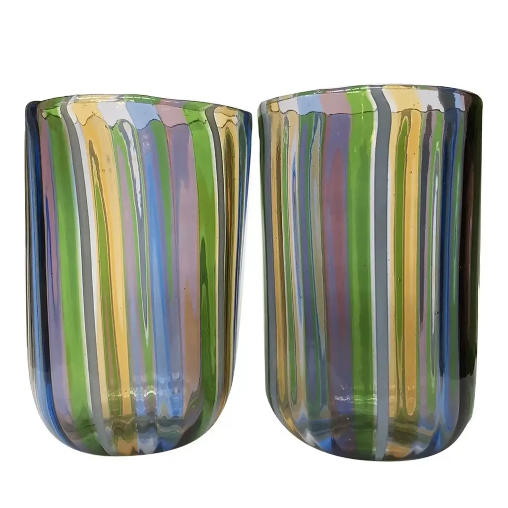 Also called Goti da Fornasa, this set of of 6 Redentore glasses, is entirely handmade in Murano glass by expert craftsman Angelo Ballarin. The stunning combination of colors, both solid and transparent, compliment each other beautifully. As each piece is unique, the glasses may vary slightly in size.